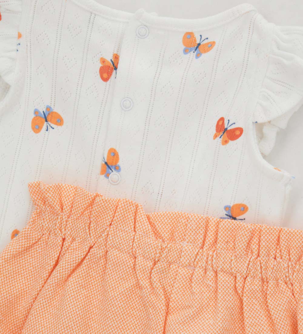 Ensemble t-shirt et culotte avec t-shirt en coton côtelé à imprimé allover, col ras du cou, manches courtes à volants et ouverture dos avec boutons-pression et culotte en coton piqué à taille élastiquée et finitions à volants.