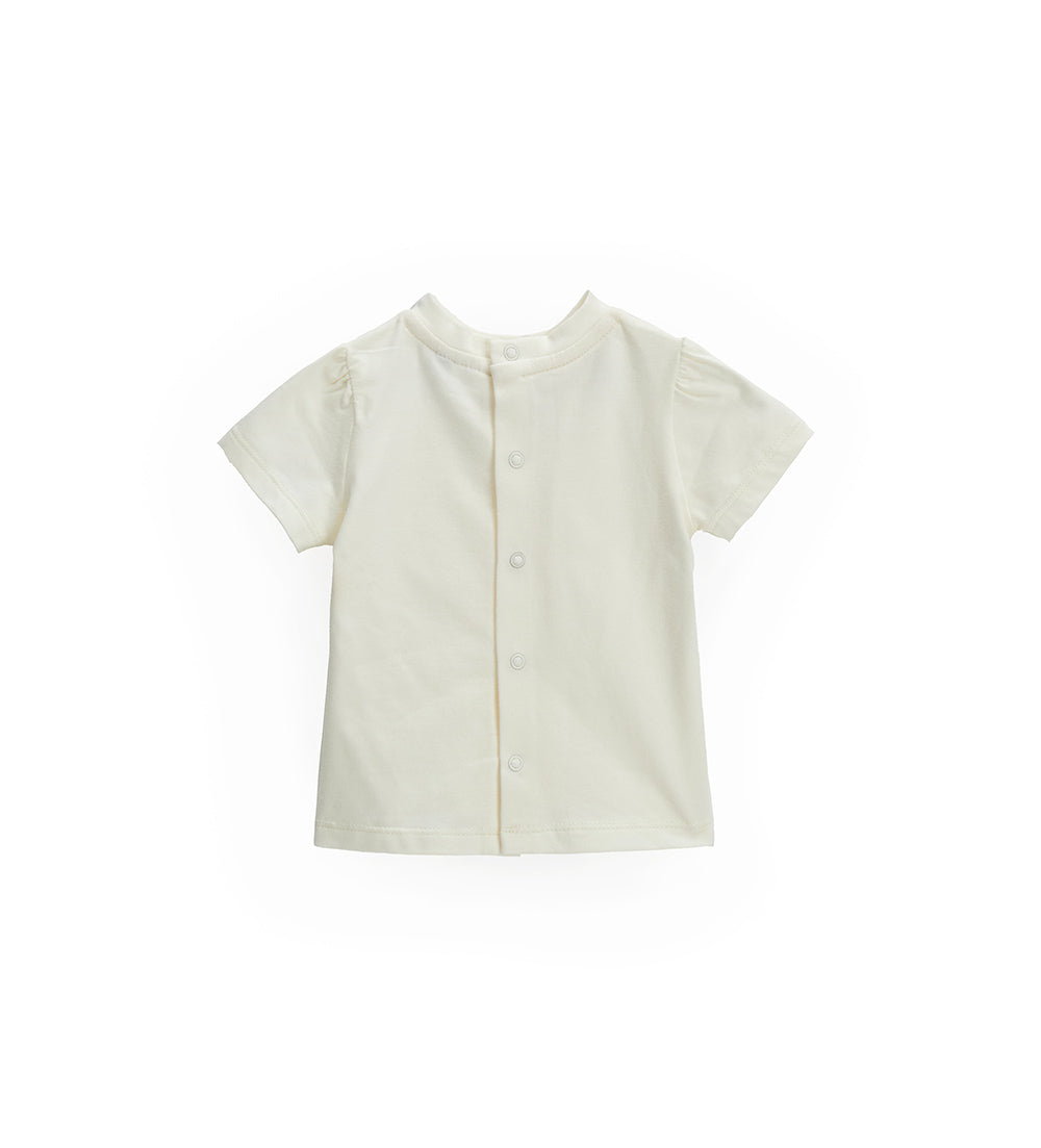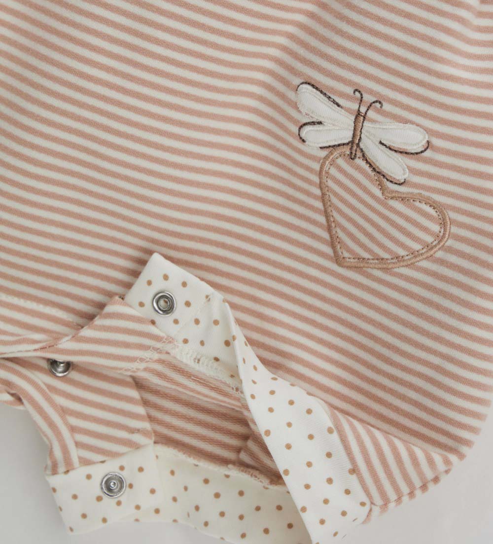 Ensemble t-shirt et salopette en coton avec t-shirt col rond à manches courtes bouffantes avec broderie et imprimé et salopette rayée teinte en fil avec poche, volants, appliqués, bretelles avec boutons imitation bois à 4 trous et boutons-pression cachés à l’intérieur de la jambe.