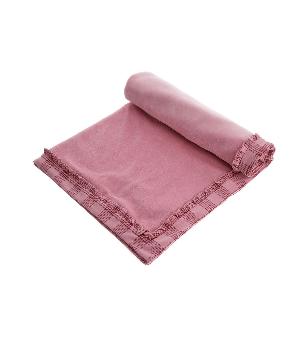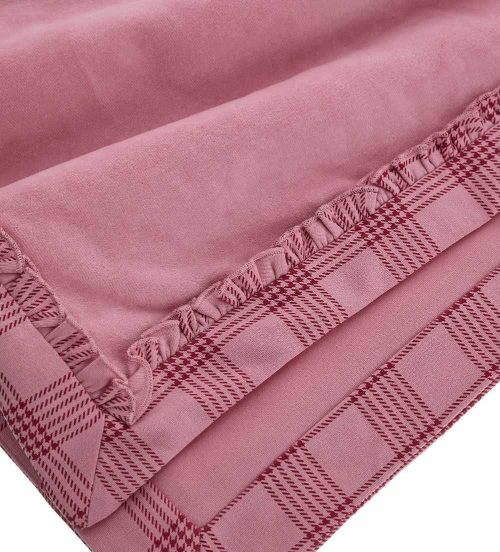 Couverture en chenille sur le devant et interlock sur le dos avec application et broderie sur le devant, bordures et volants sur le devant et le dos avec imprimé all-over.