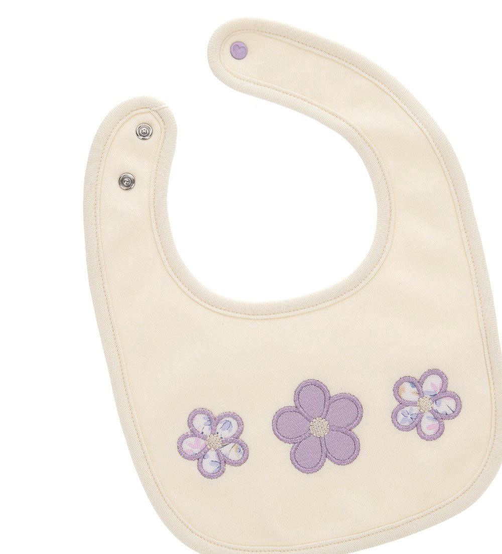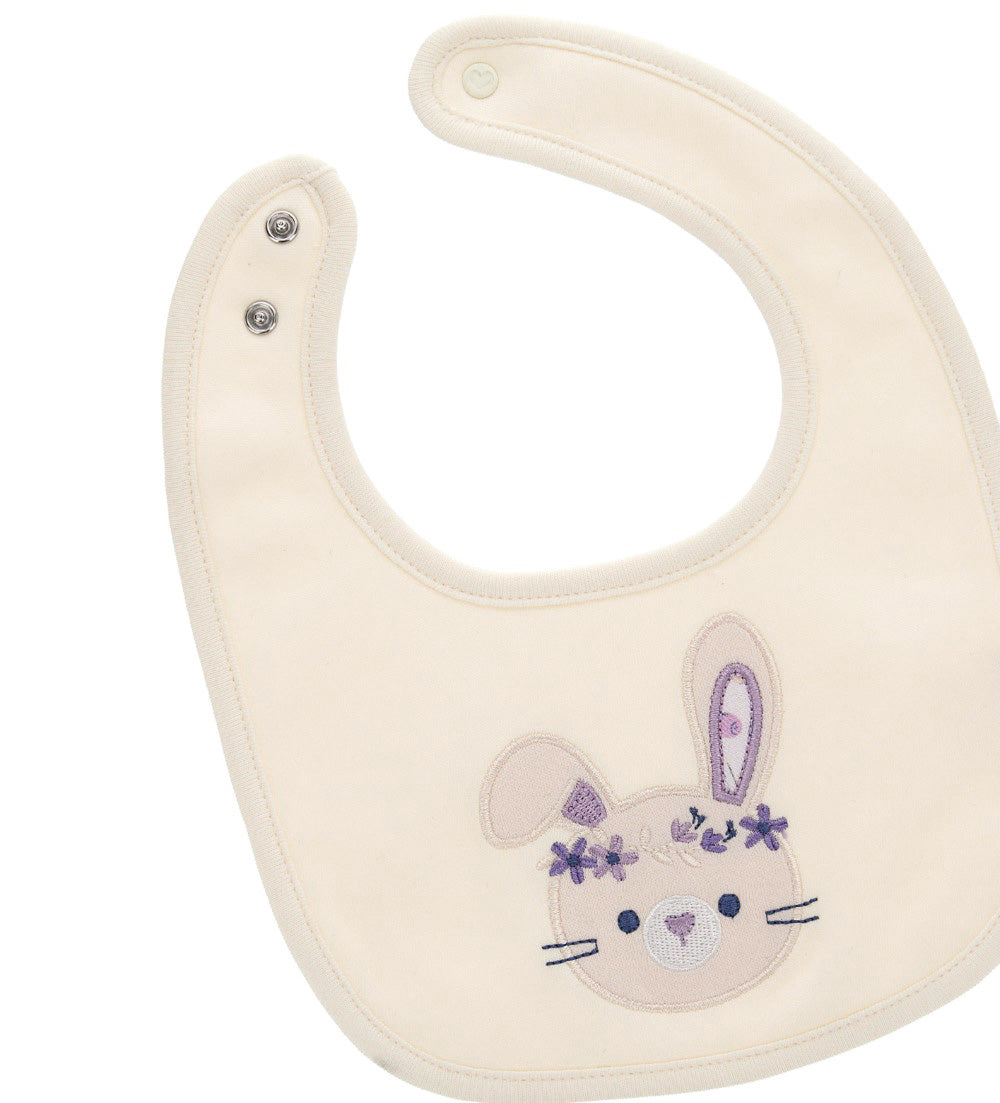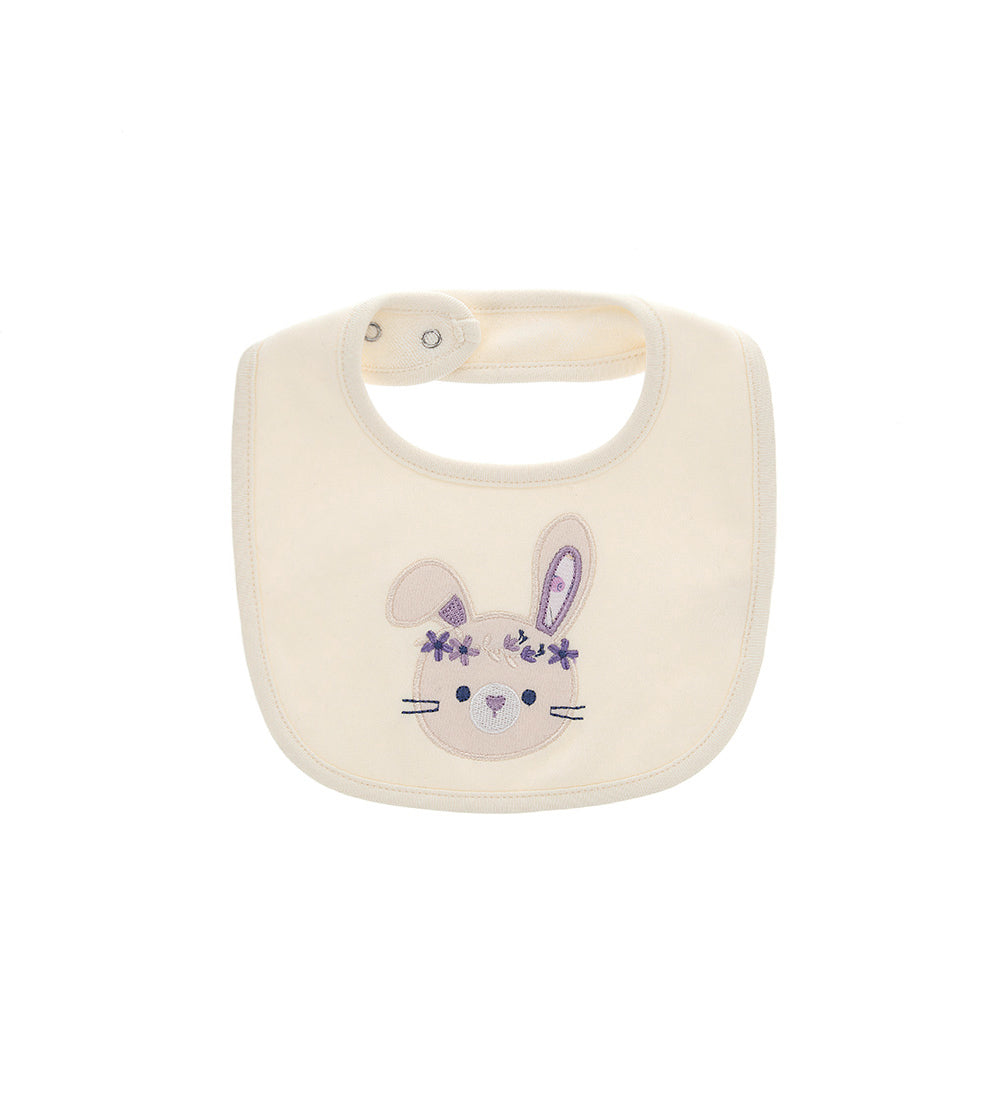 Bavoir en coton avec dos en éponge douce, ouverture réglable pratique avec bouton-pression, broderie lapin et appliqué sur le devant.