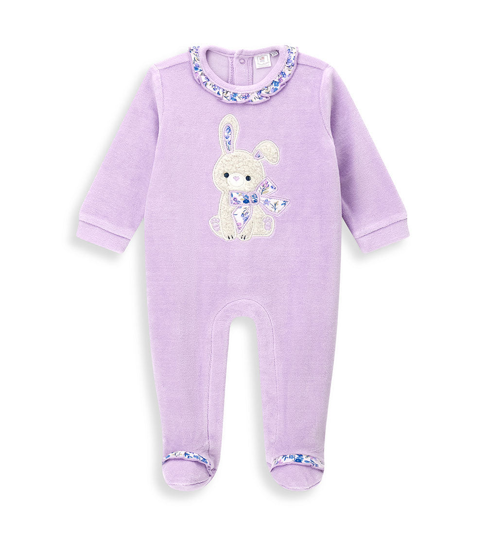 Barboteuse en chenille douce à manches longues, col rond à volants, imprimé all-over, broderie sur le devant et ouverture pratique par bouton-pression dans le dos et à l’intérieur de la jambe.