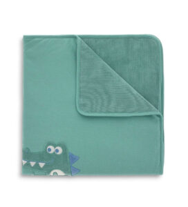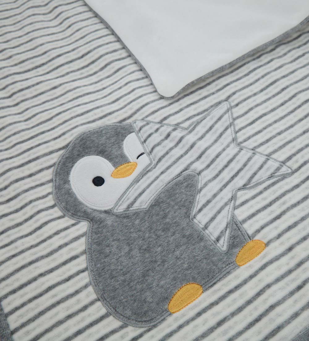 Couverture douce en chenille teinte en fil, avec rayures sur le devant et jersey de coton uni sur le dos. Adorables appliqués et broderies en chenille à motifs de pingouins et d’étoiles.
