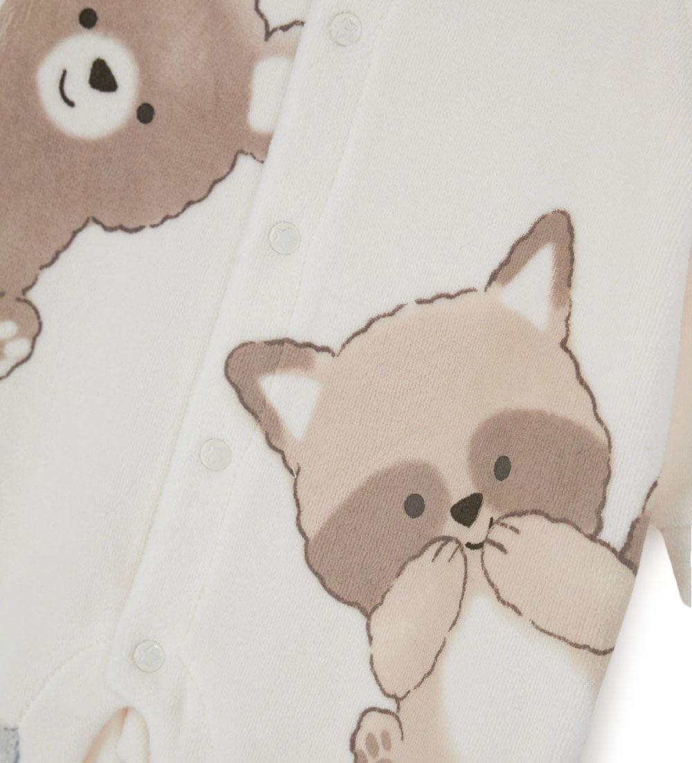 Combinaison en chenille douce avec col rond, manches longues, imprimé sur le devant et ouverture pratique à boutons-pression au dos et à l’intérieur de la jambe.