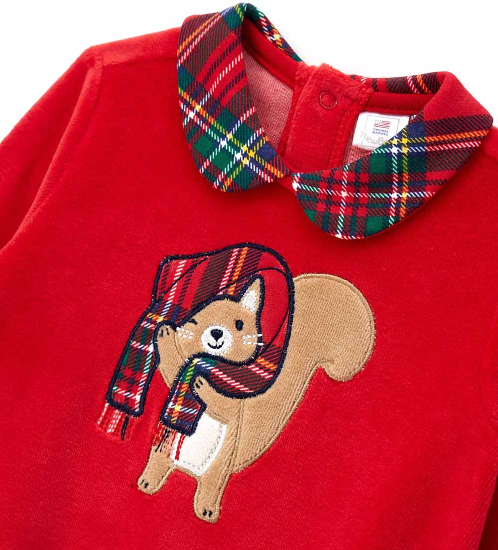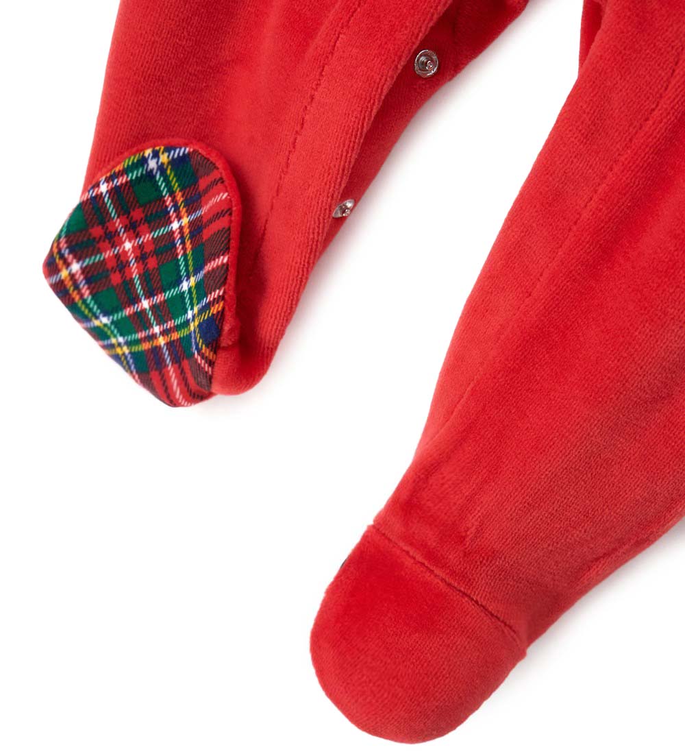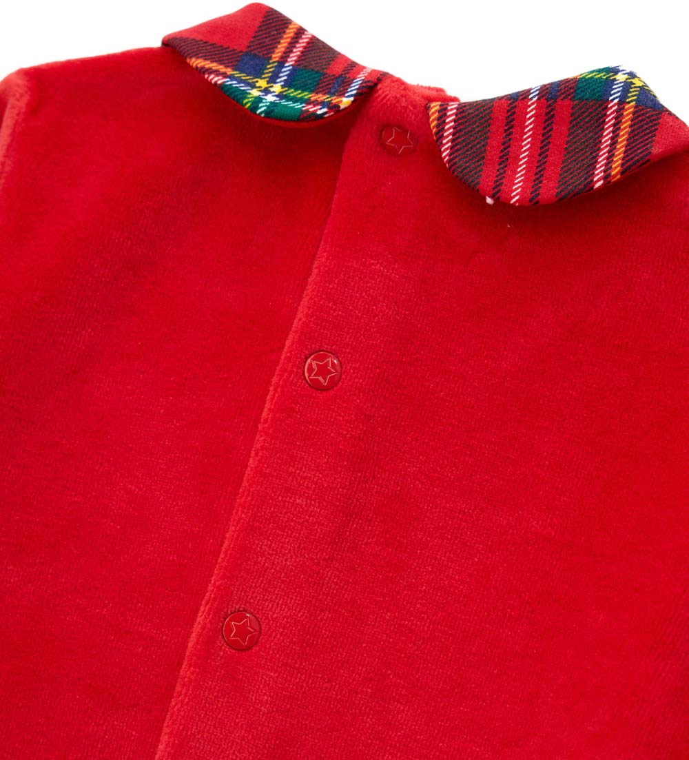 Combinaison pantalon tendance en chenille à manches longues, col chemise à carreaux, effet salopette contrastant et fermeture pratique à boutons-pression.