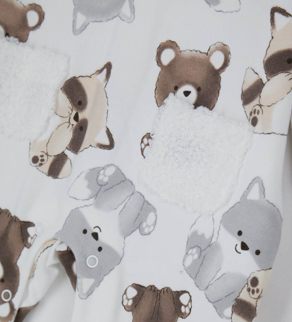 Sweat-shirt à imprimé intégral, manches longues, col rond, poches latérales en fausse fourrure, fermeture à boutons-pression et broderie sur la semelle intérieure.