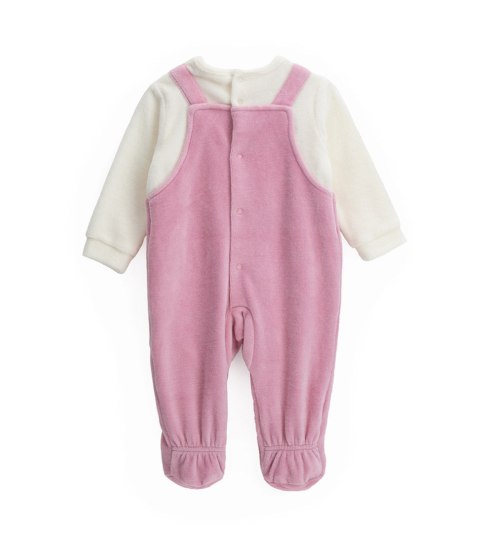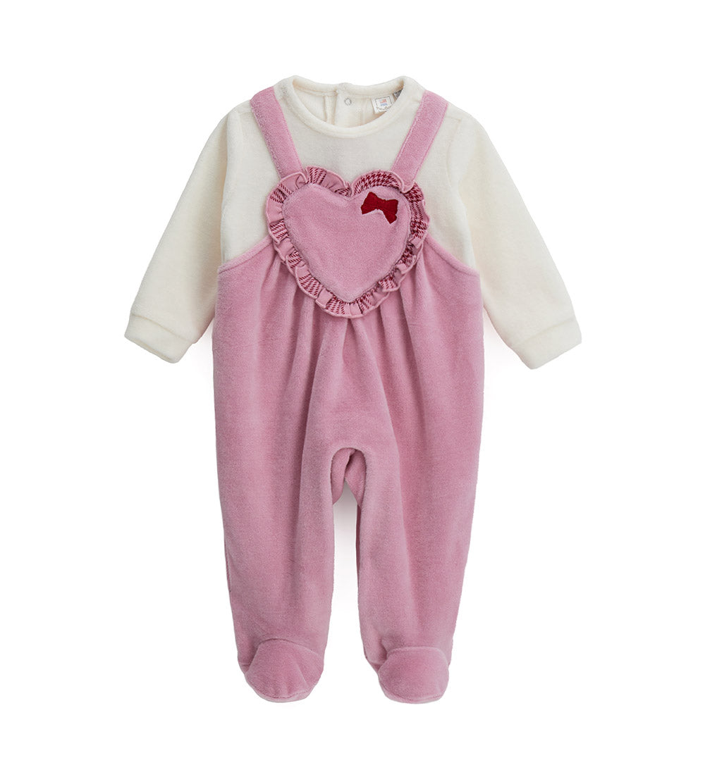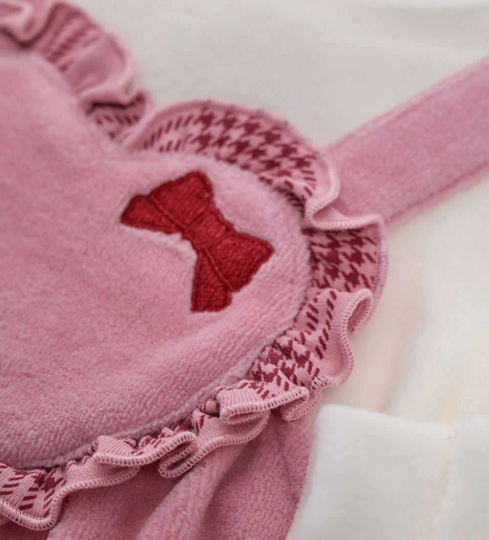 Combinaison en chenille à manches longues, ouverture par boutons-pression au dos et à l’intérieur de la jambe et volants avec imprimé all-over sur le devant.