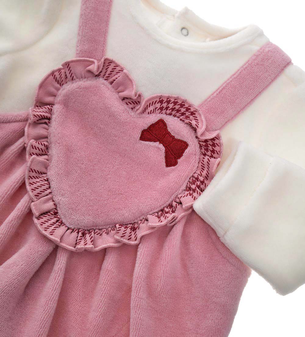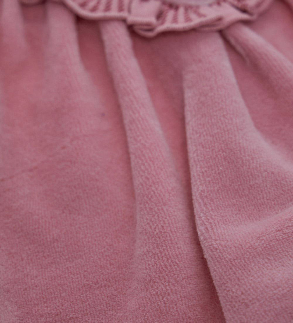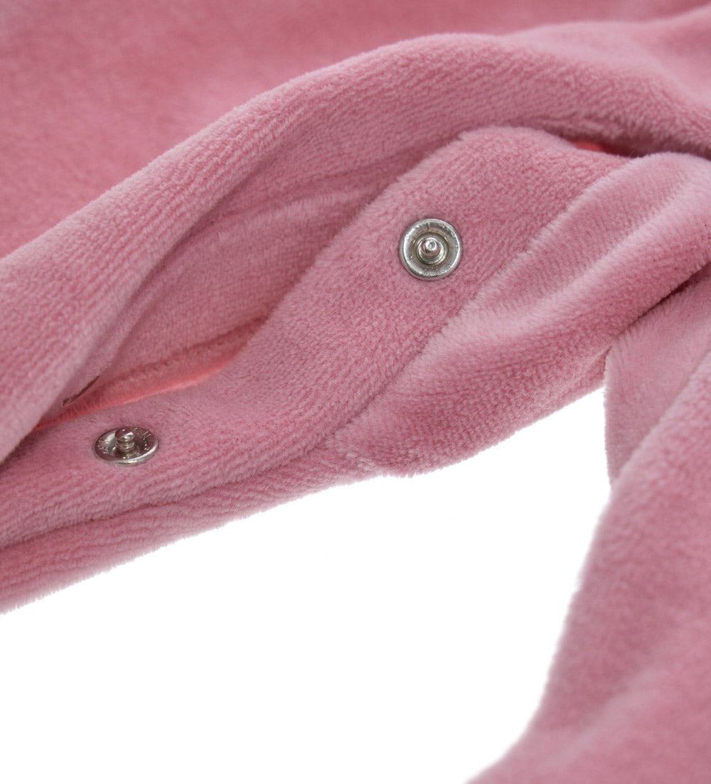 Combinaison en chenille à manches longues, ouverture par boutons-pression au dos et à l’intérieur de la jambe et volants avec imprimé all-over sur le devant.