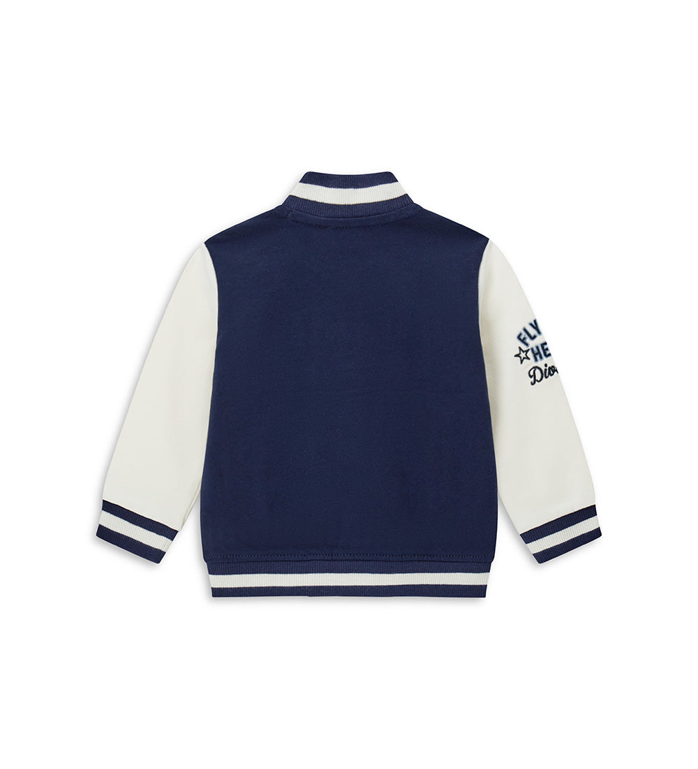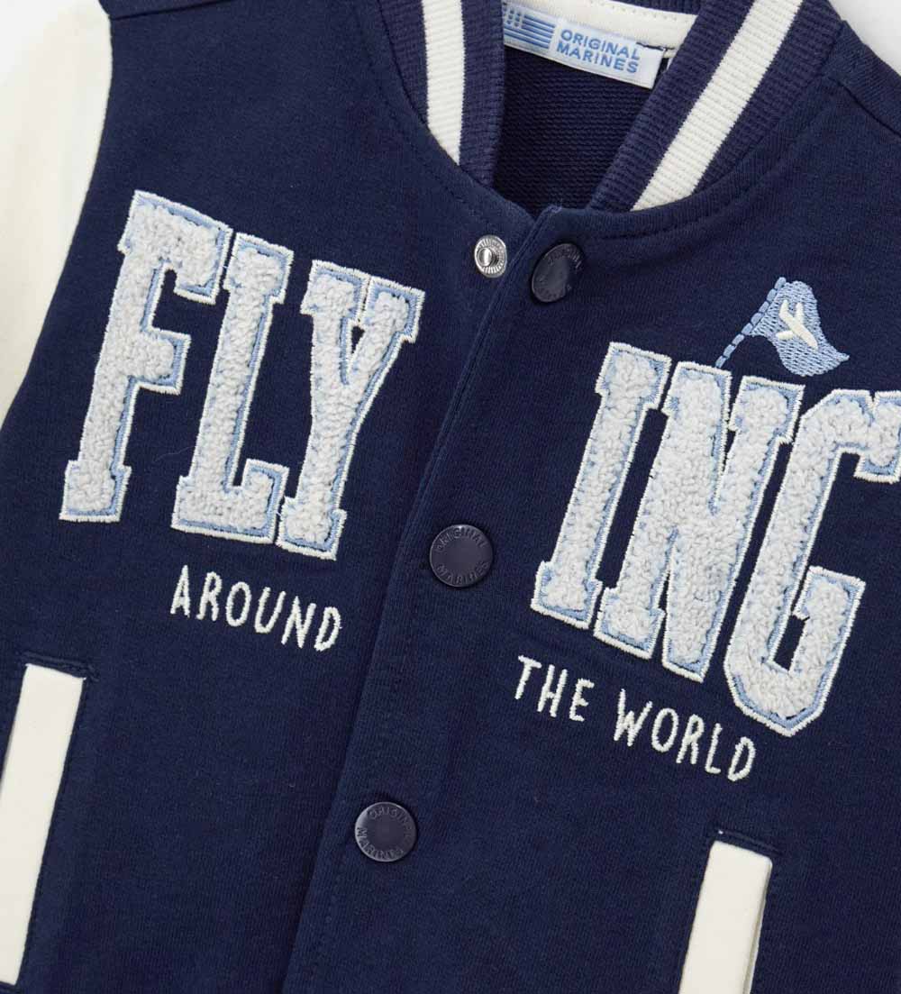 Veste Teddy en tissu polaire doux avec manches longues, finitions côtelées, boutons-pression, poches latérales contrastées, appliques et broderies sur le devant et sur la manche.