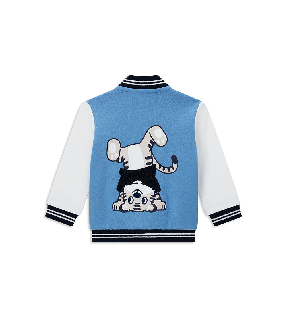 Veste en coton polaire avec col rond et finitions côtelées, ouverture par boutons pression, poches devant et broderies et applications sur le devant et le dos pour un style unique.