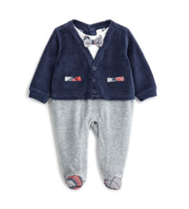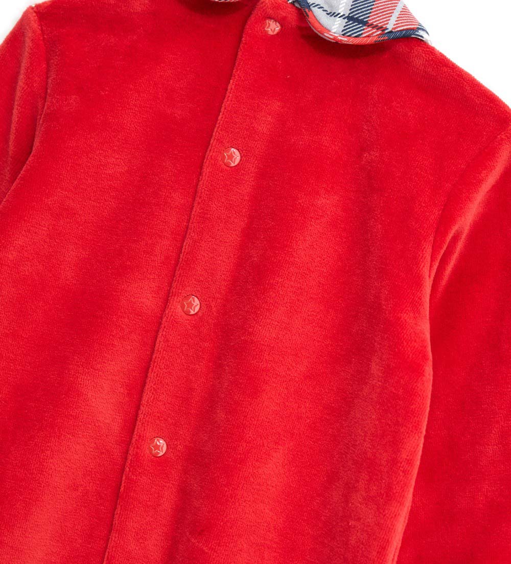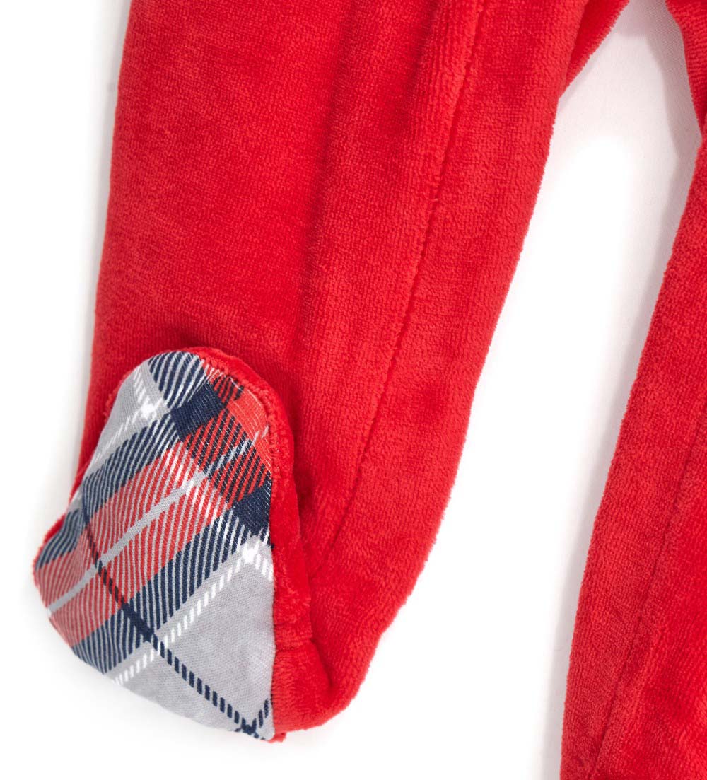 Combinaison en chenille à manches longues avec col chemise, imprimé all-over sur le bas, ouverture à boutons-pression dans le dos et à l’intérieur de la jambe et chevilles élastiquées.