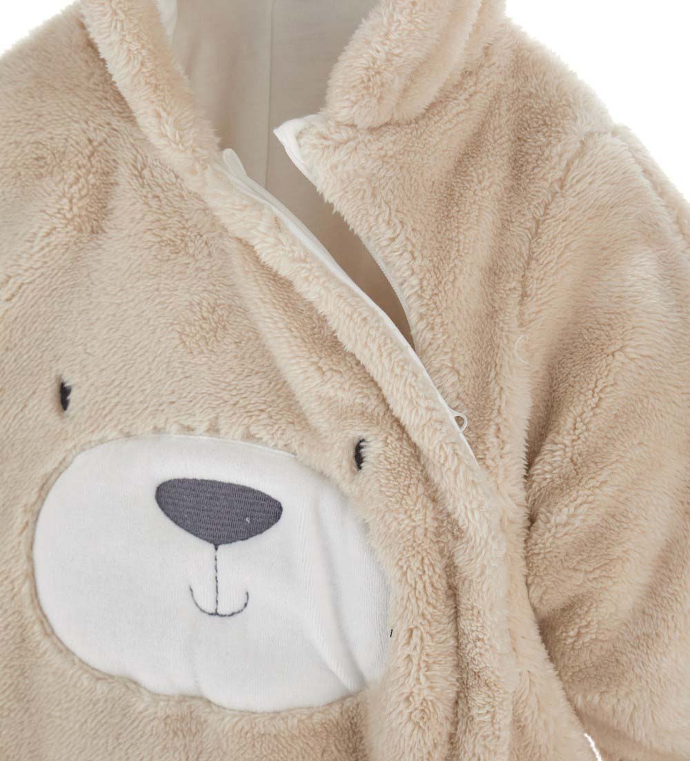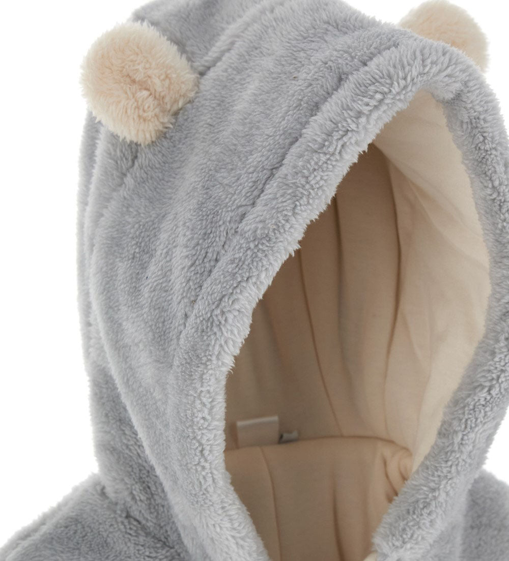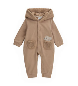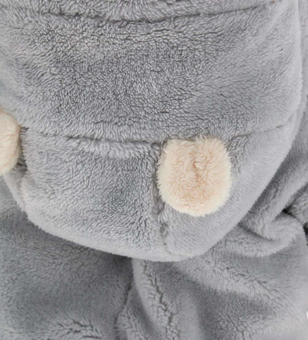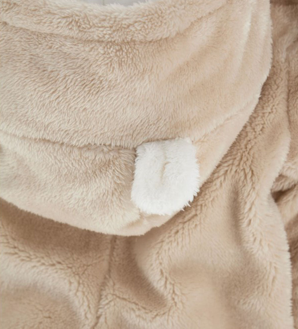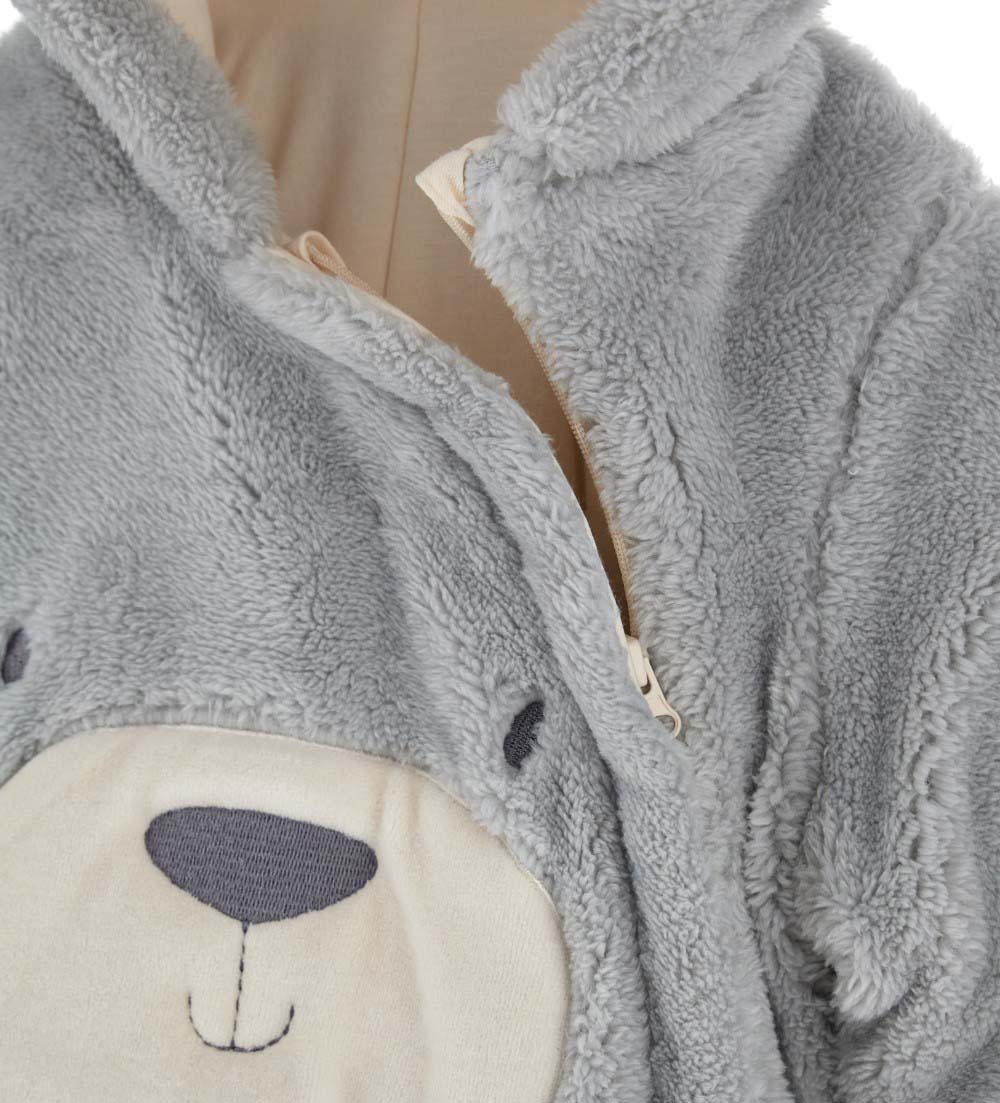 Barboteuse à manches longues en fourrure écologique avec capuche doublée de coton, oreilles 3D, ouverture latérale sur le devant avec zip, applications sur le devant et broderie.