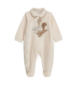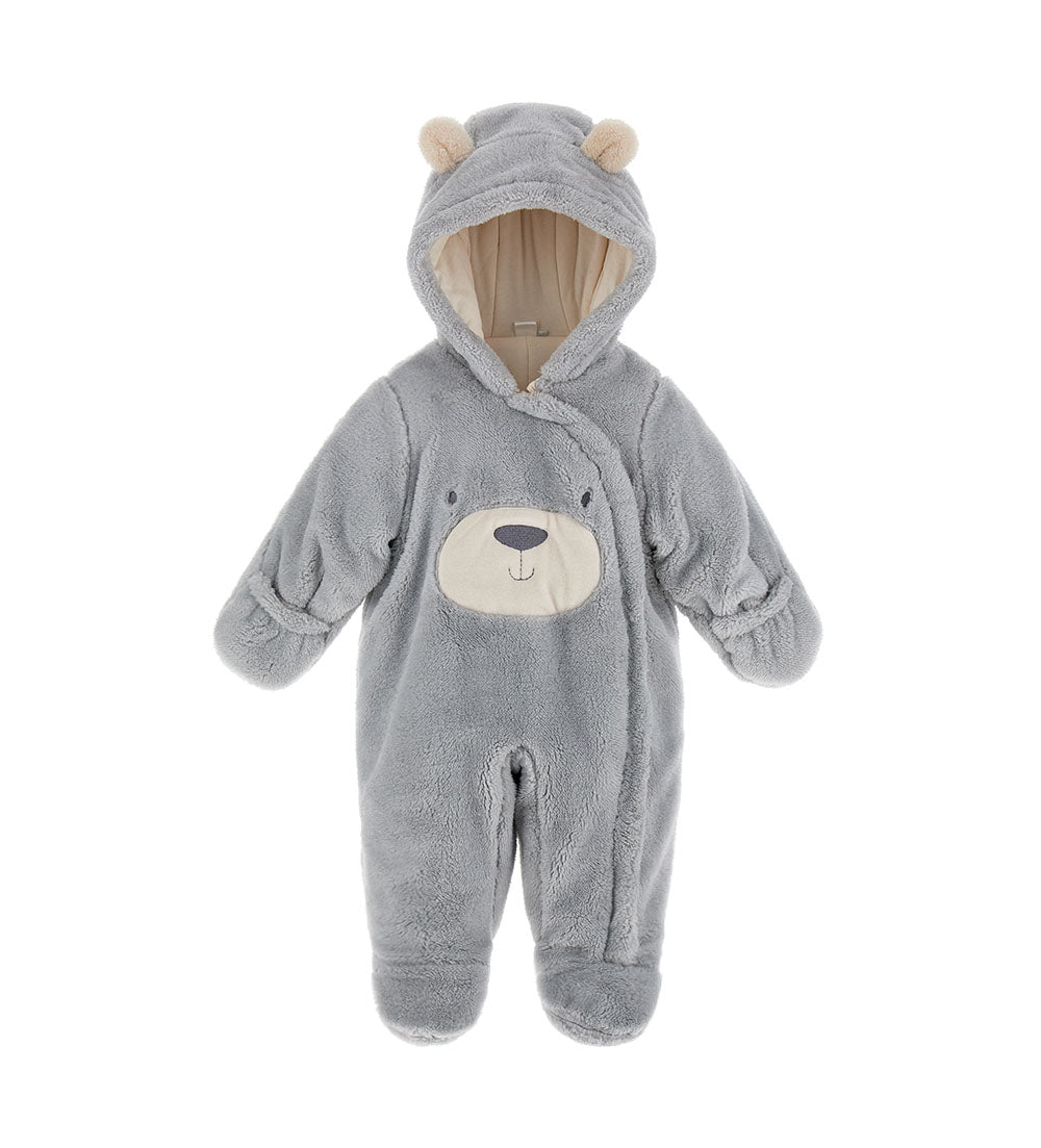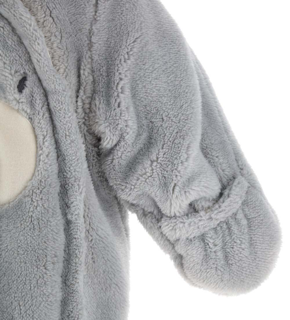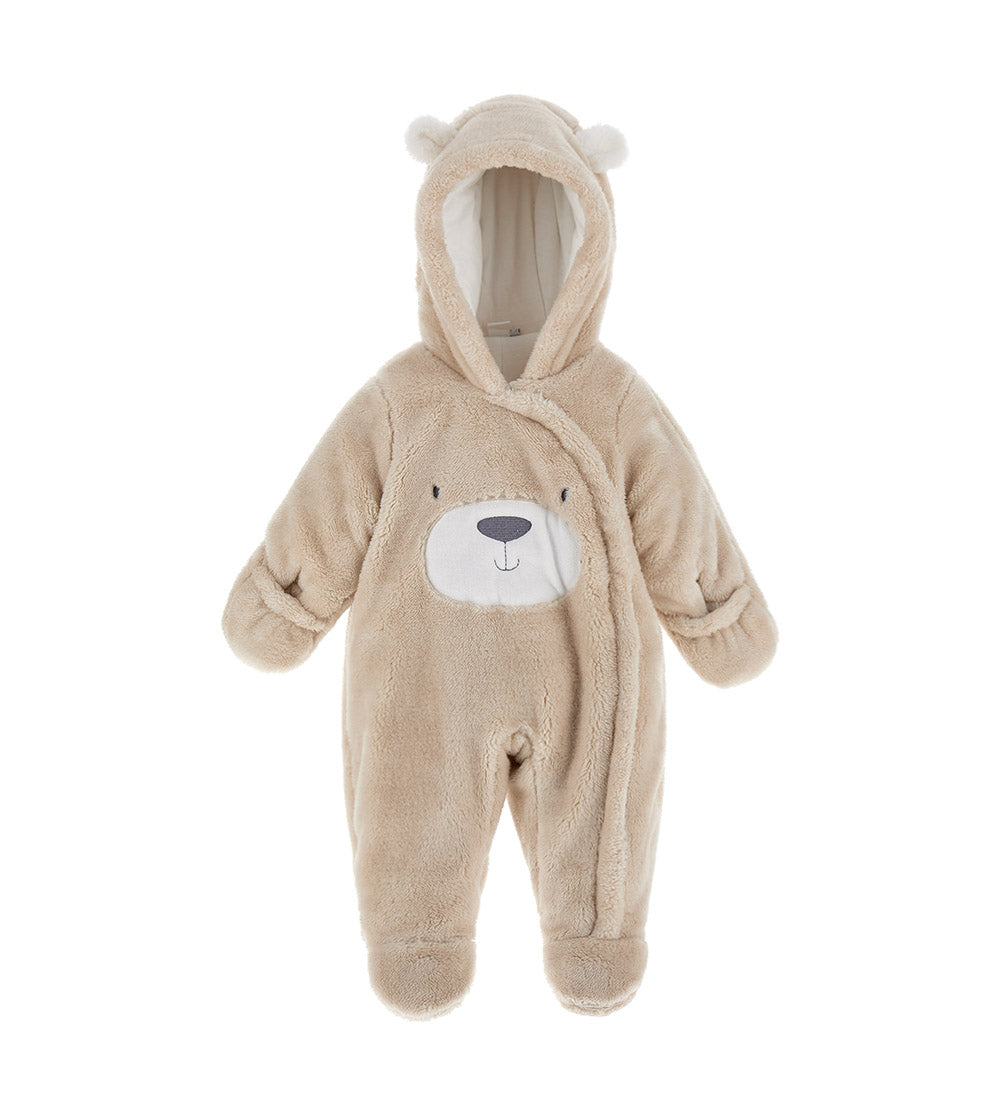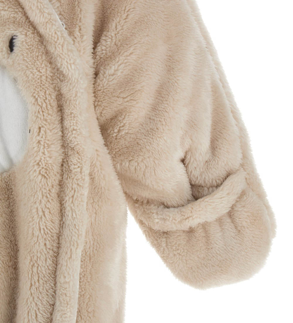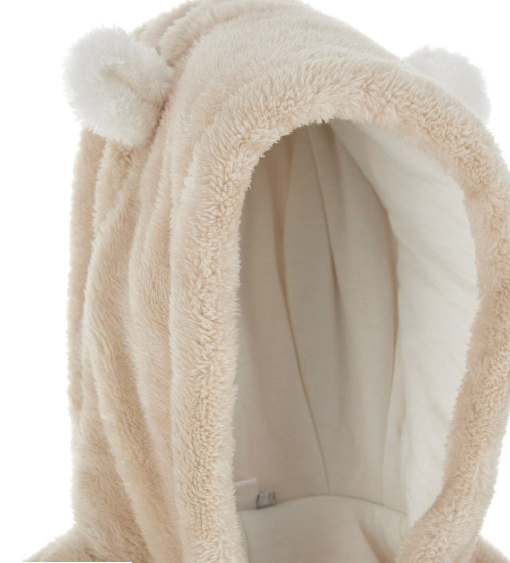 Barboteuse à manches longues en fourrure écologique avec capuche doublée de coton, oreilles 3D, ouverture latérale sur le devant avec zip, applications sur le devant et broderie.