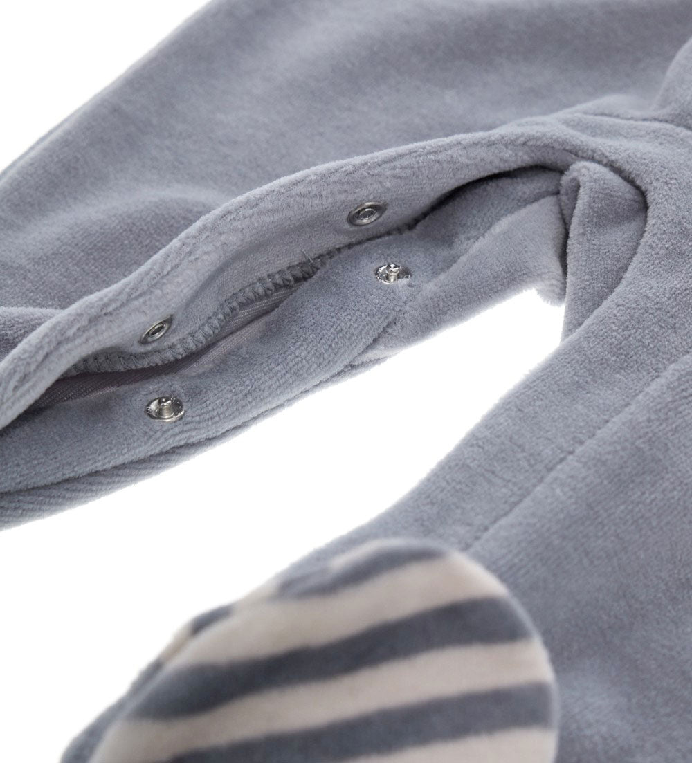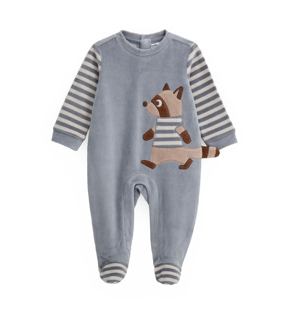 Combinaison en chenille à manches longues, manches et dessous de pied teints en fil, col ras du cou, boutons pression au dos et à l’intérieur de la jambe, applications sur le devant et chevilles élastiquées.