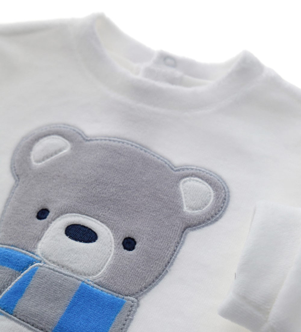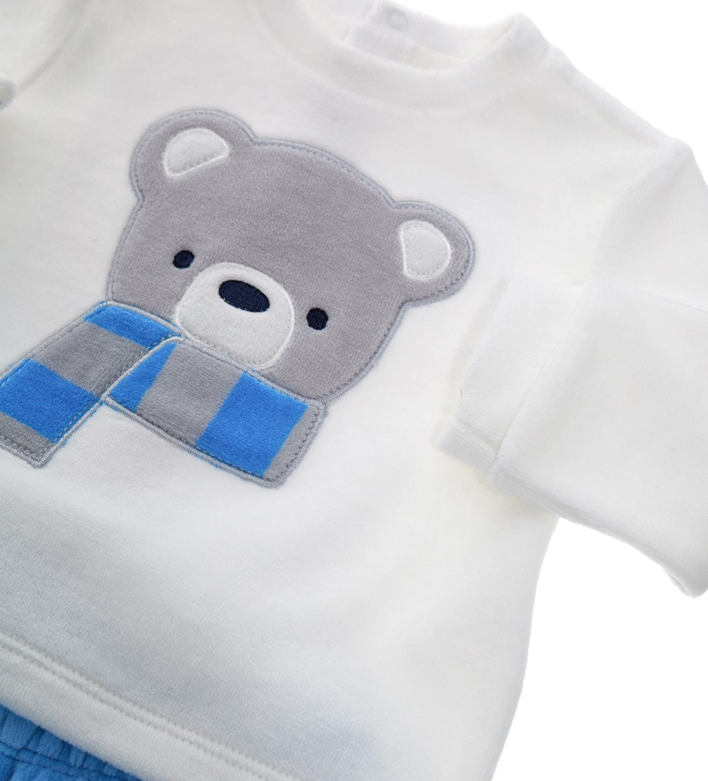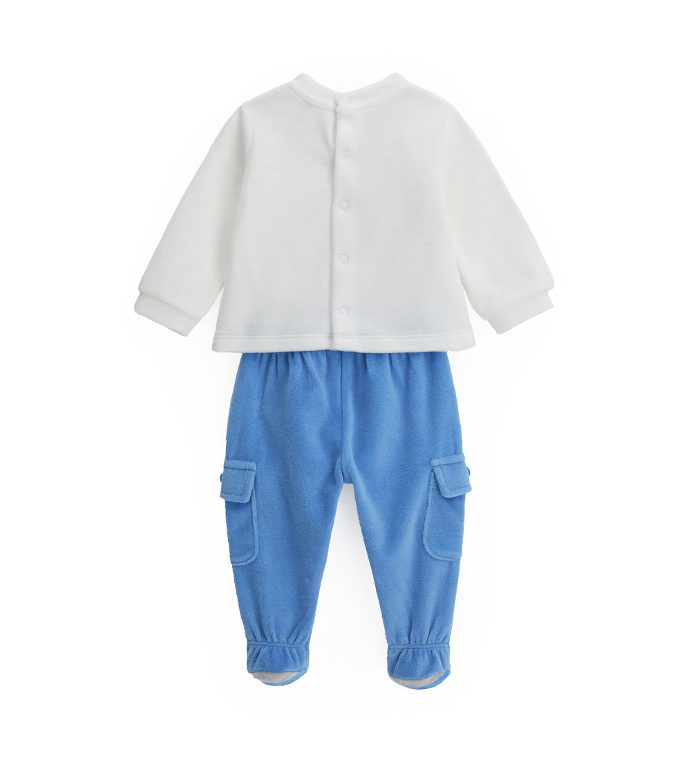 Ensemble pull et pantalon : pull ras du cou en chenille à manches longues, ouverture par boutons-pression au dos et broderie sur le devant. Pantalon en chenille à taille élastique et poches plaquées latérales.