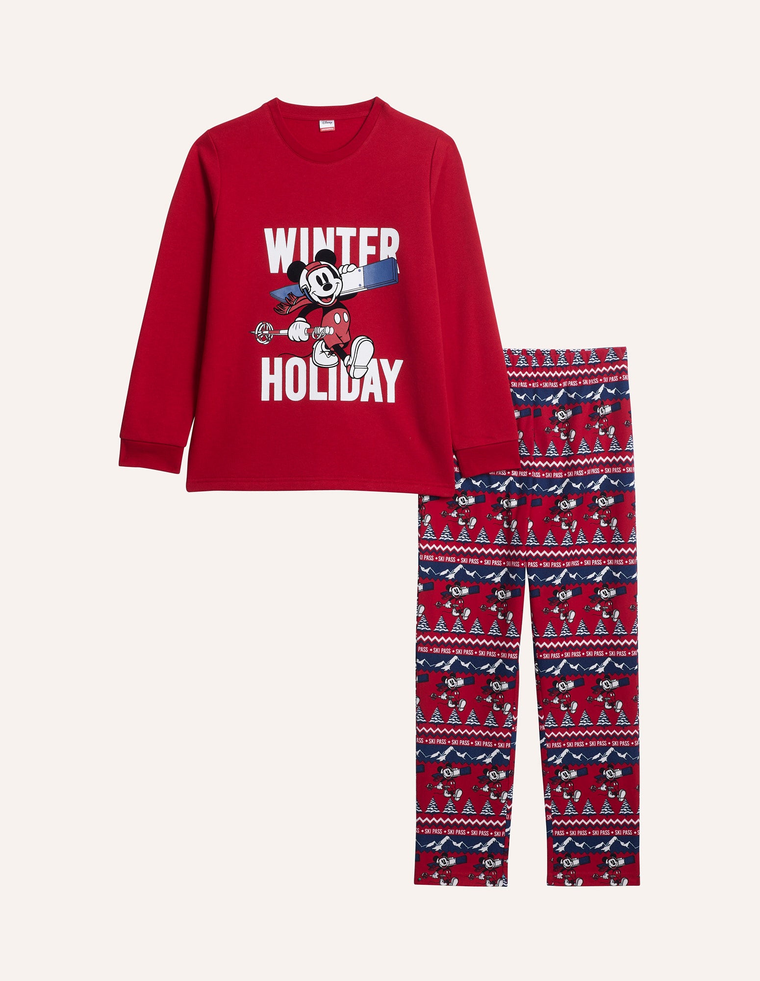 Pyjama long pour garçon. Le haut est en molleton doux brossé, tandis que le pantalon assorti est en micropolaire. Couleur rouge rubis éclatante, parfaite pour les fêtes ! Col ras du cou confortable et poignets pratiques. Imprimé ludique Mickey Mouse en train de skier. Pantalon doux et confortable, rehaussé d’une taille élastique.
