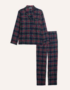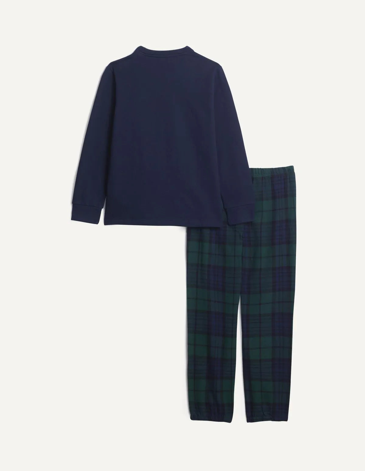 Pyjama long pour garçon en polaire brossée, chaude et douce. T-shirt bleu nuit à col rond avec poignets et joli imprimé. Pantalon à carreaux avec élastique à la taille et aux chevilles. Coupe confortable et classique. Idéal pour créer des ensembles coordonnés avec toute la famille.