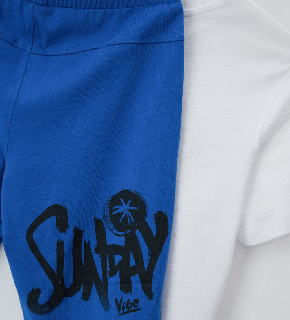 Ensemble t-shirt et bermuda en coton avec t-shirt col rond à bordure côtelée, manches courtes avec imprimé sur le devant et bermuda avec taille ajustable par cordon de serrage et poches latérales.