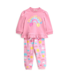Ensemble t-shirt et bermuda en coton avec t-shirt col rond fini avec bordure côtelée, manches courtes avec imprimés sur le devant et bermuda sweat avec taille élastique avec cordon de serrage réglable, poches plaquées latérales et bande teinte en fil sur les côtés.