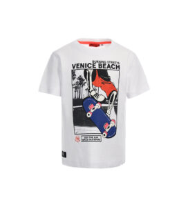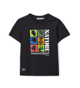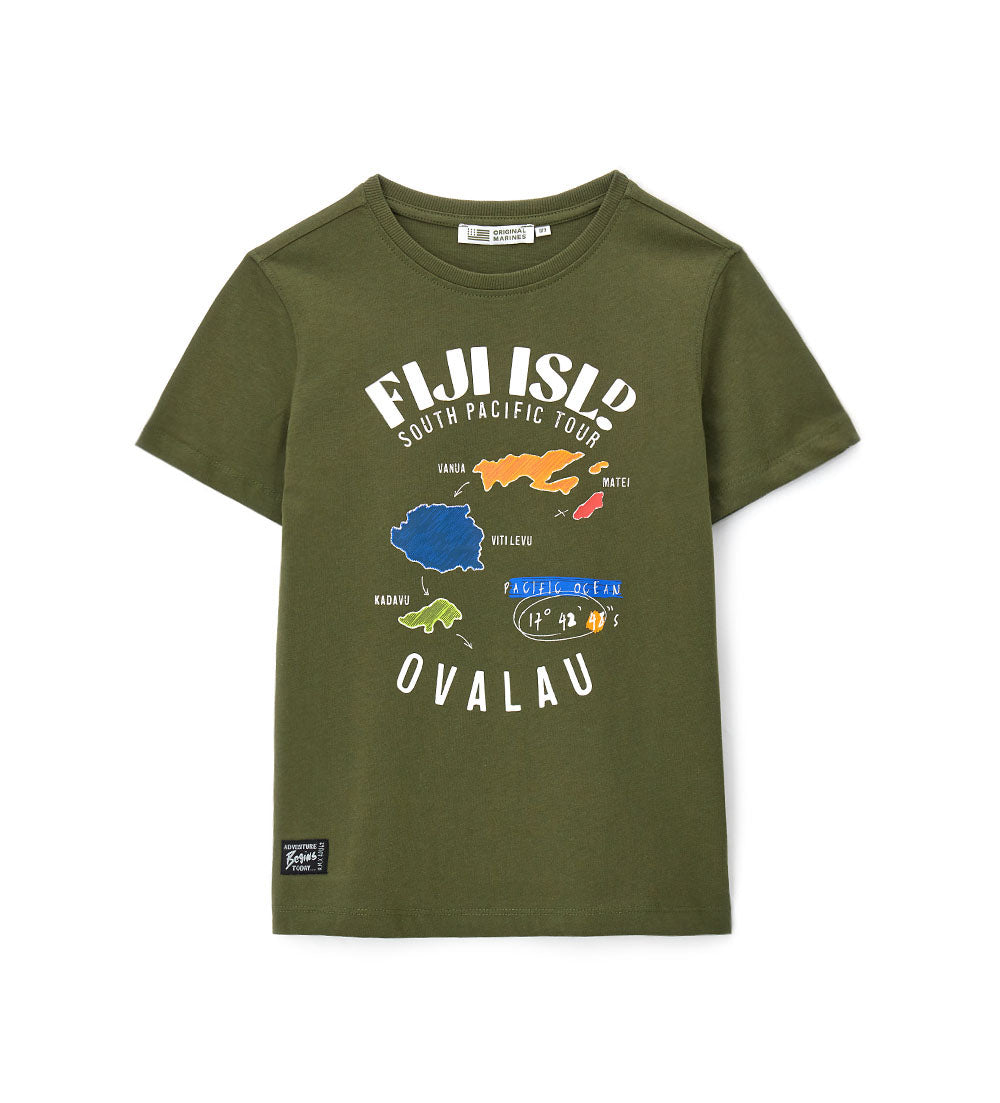 T-shirt en coton avec col ras du cou côtelé, manches courtes, imprimé sur le devant et étiquette brodée.