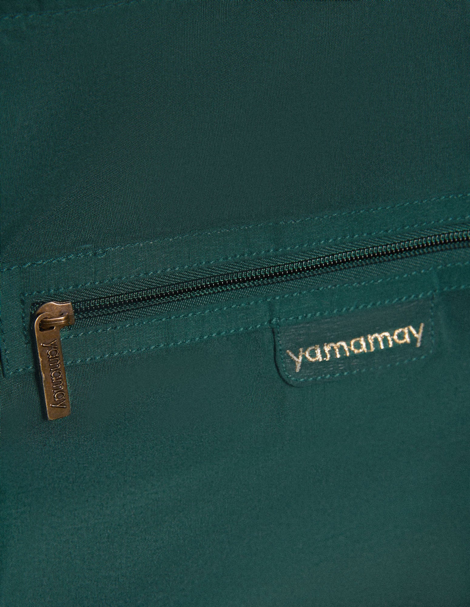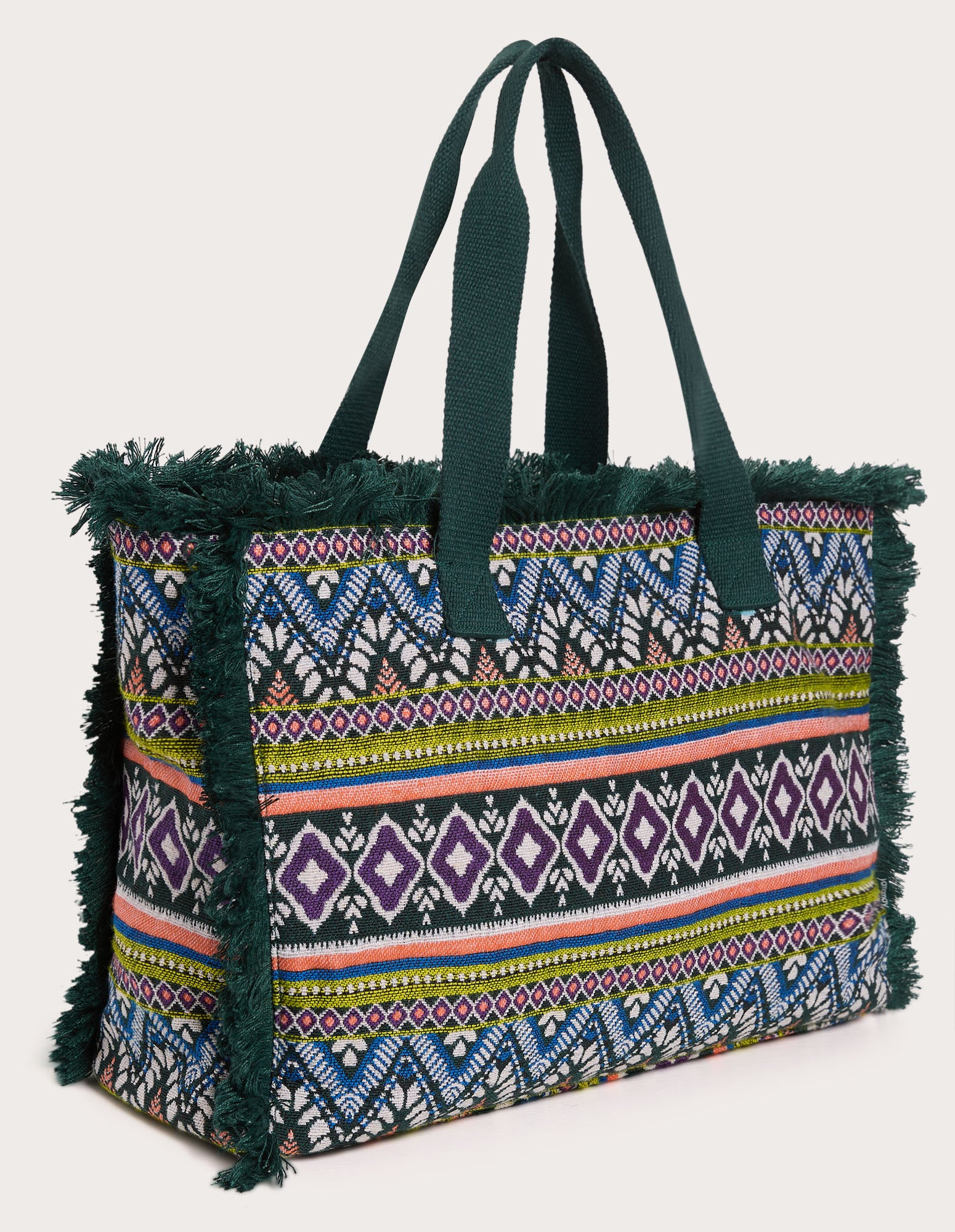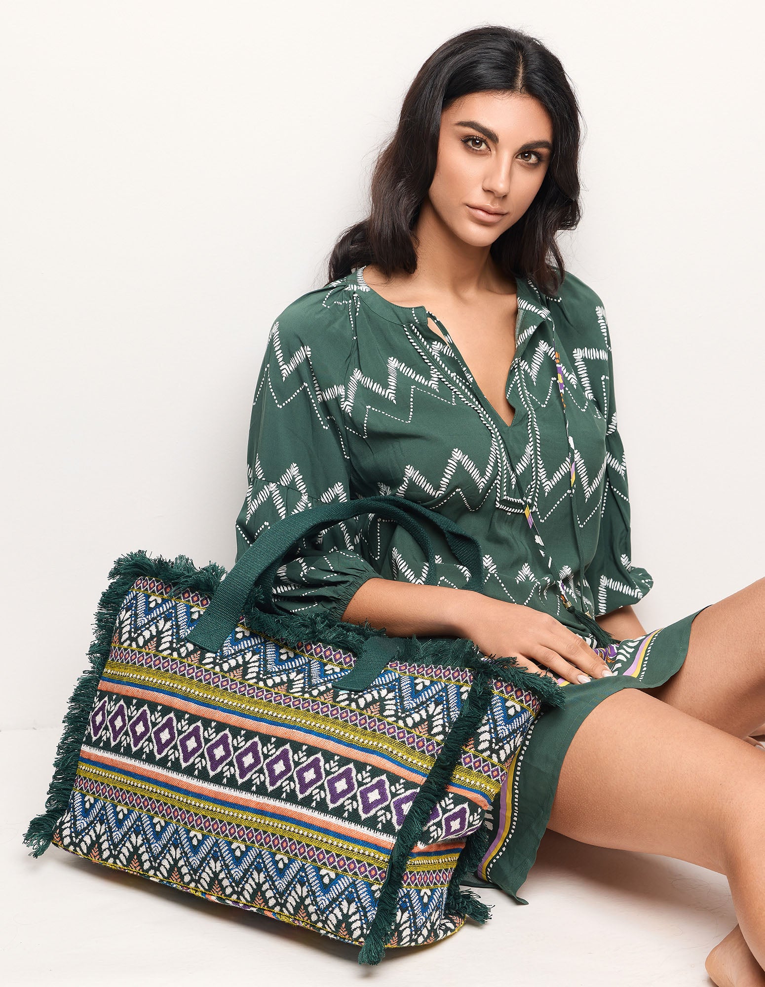 Sac en toile épaisse orné d’un imprimé ethnique dans les tons verts et de motifs géométriques colorés. Il est doté de deux anses permettant un porté épaule. Il est orné de franges sur le bord pour une plus grande liberté de mouvement.
