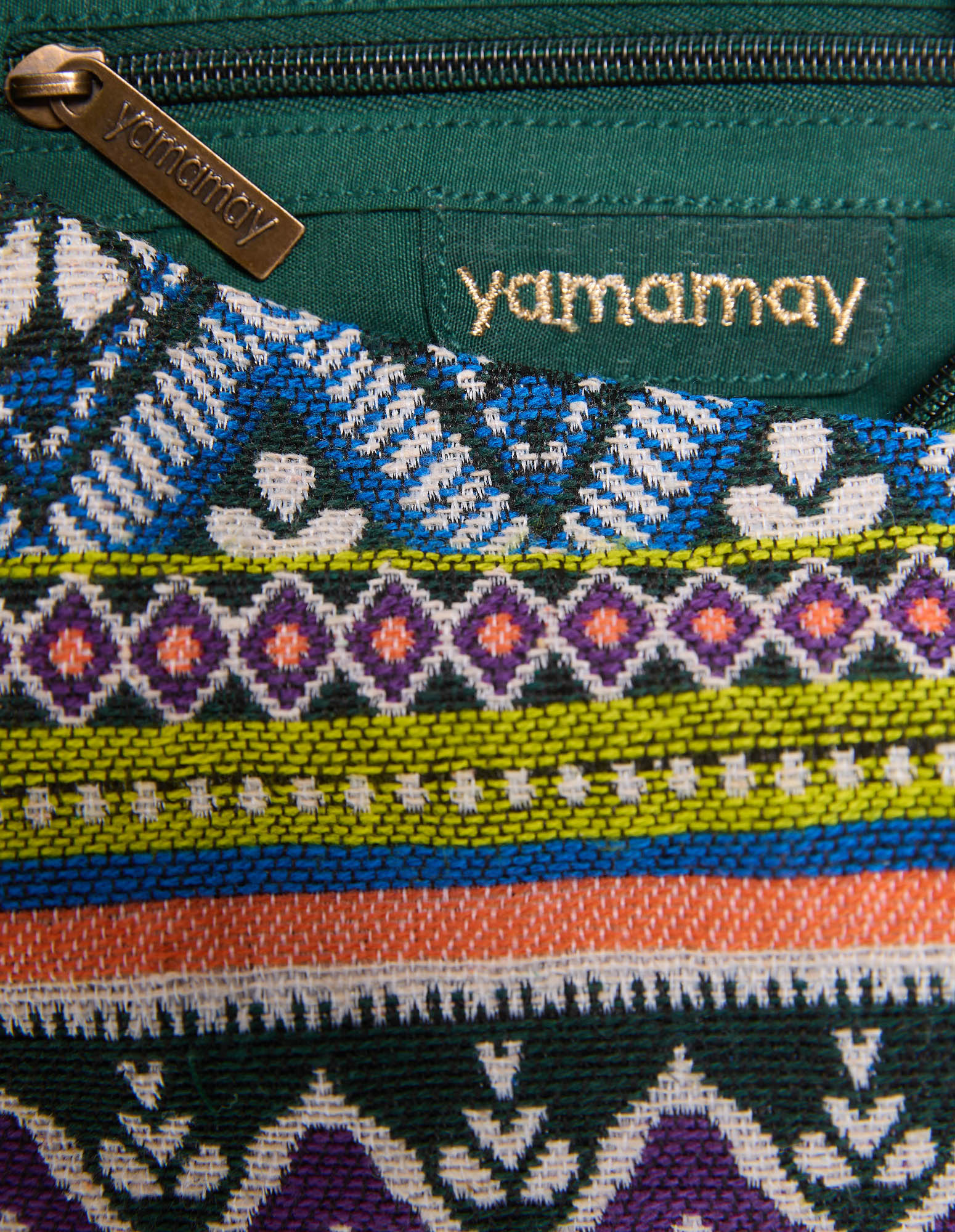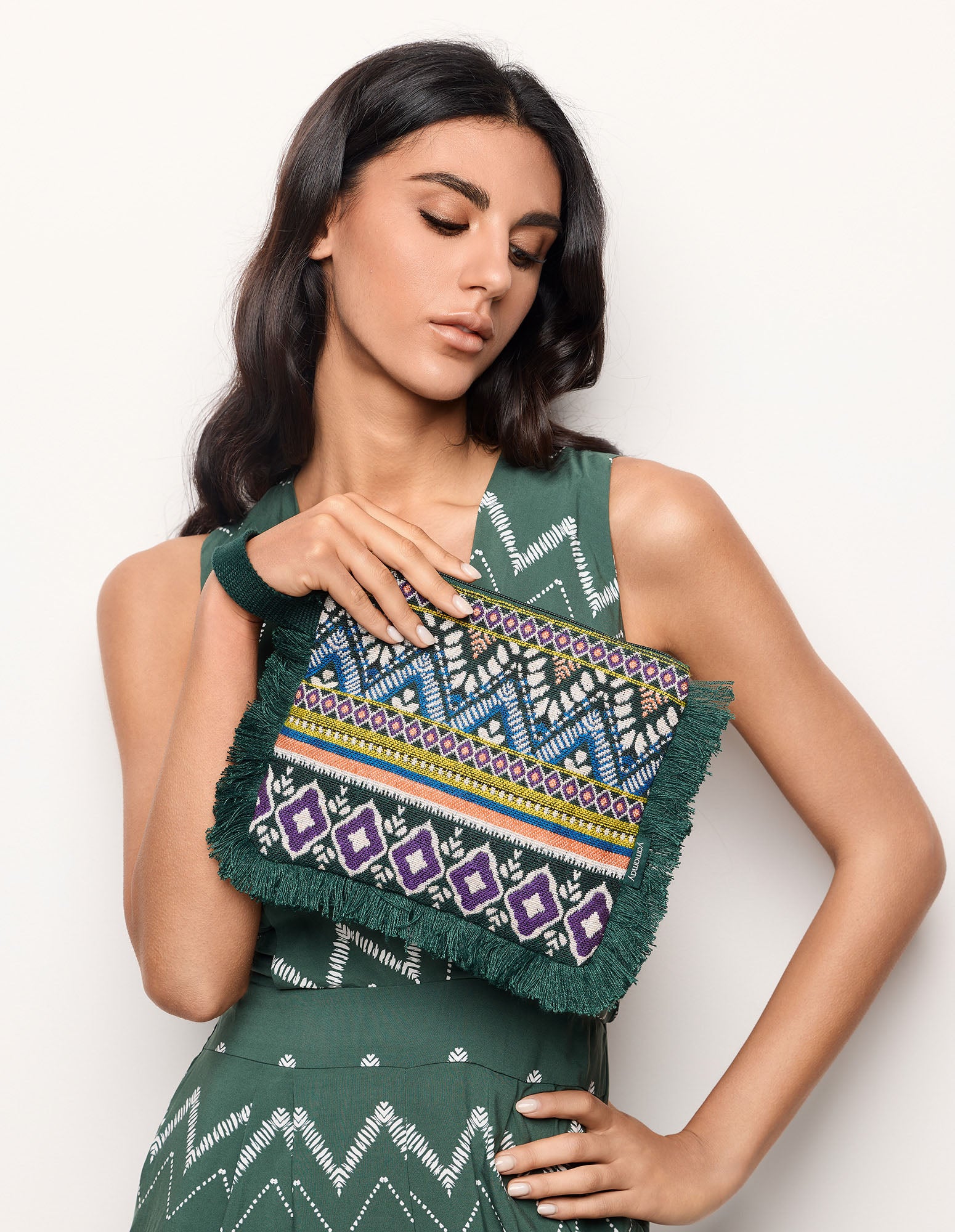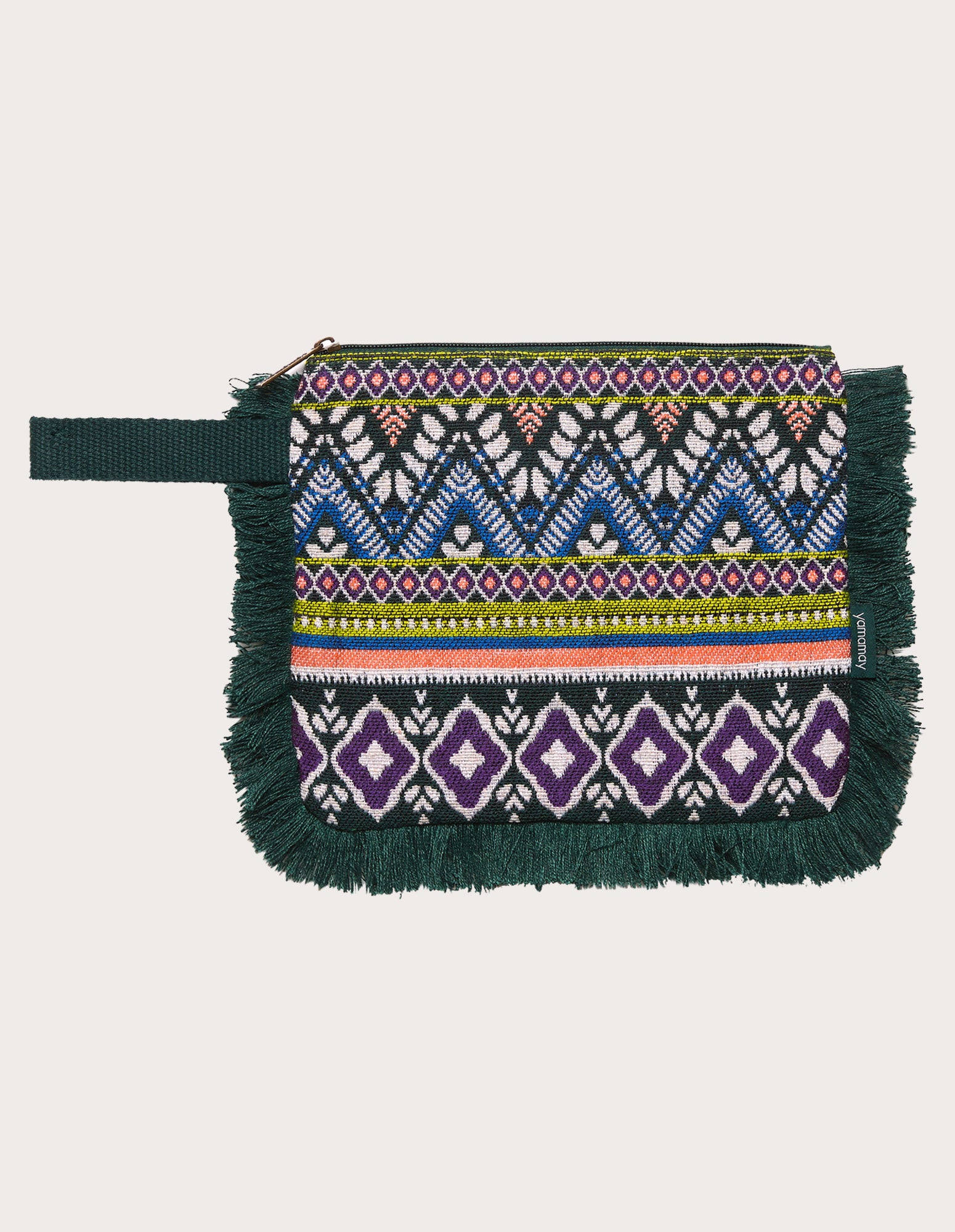 Pochette en tissu ethnique vibrant, ornée d’un imprimé multicolore et de franges en tissu vert olive sur les côtés. Livrée avec une dragonne assortie pour un transport facile et une fermeture zippée sur le dessus.