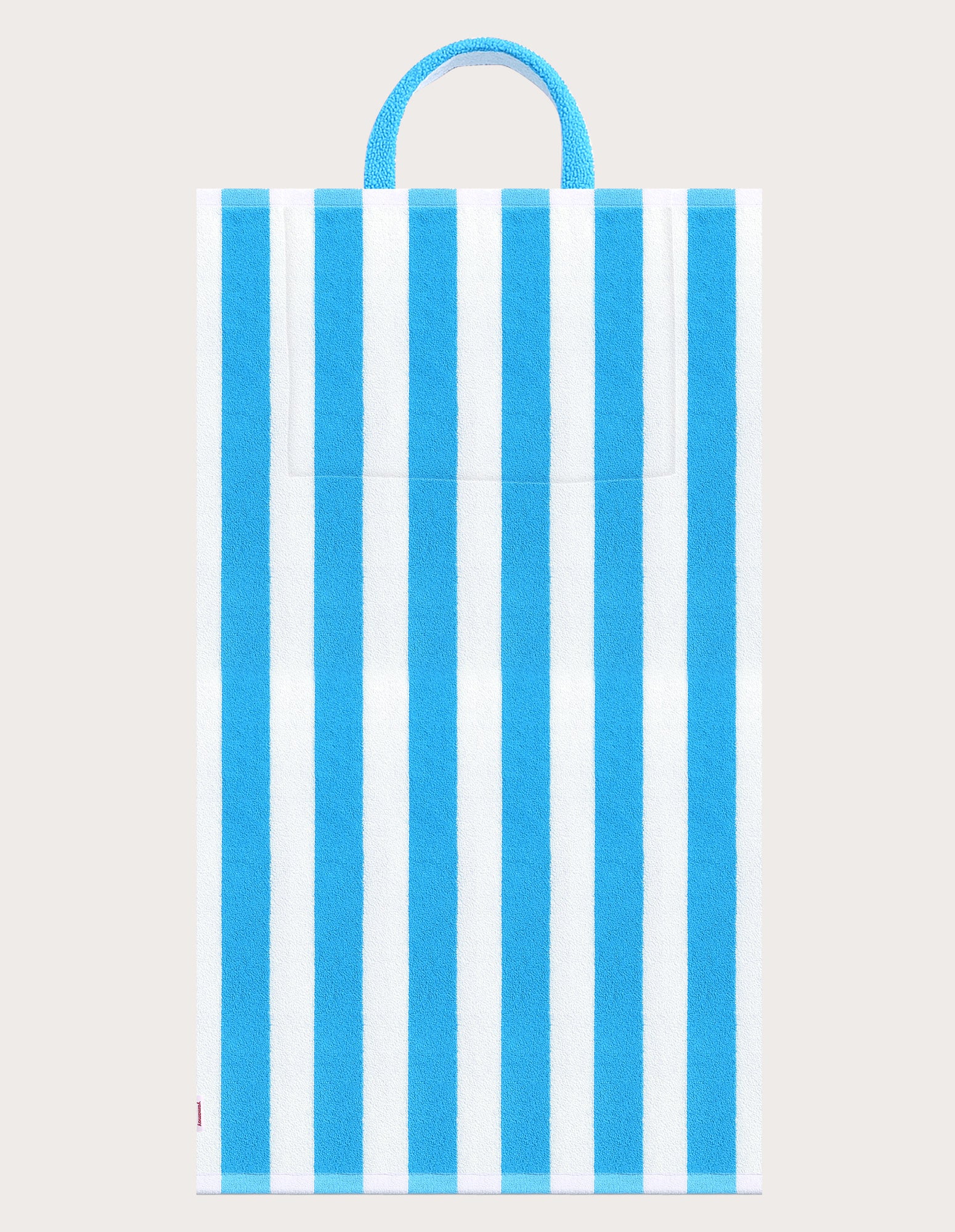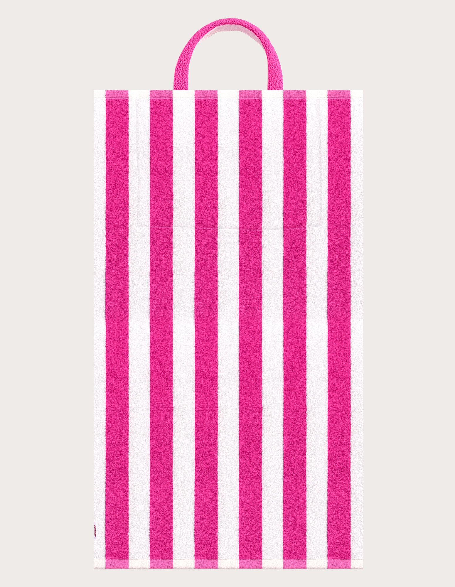 Serviette de plage en microfibre éponge douce avec imprimé à rayures verticales. Elle est dotée d’un coussin rembourré pratique sur le dessus pour un confort optimal lors de vos moments de détente au soleil. Grâce à son design convertible, elle se replie sur elle-même et se transporte comme un sac pratique avec ses poignées assorties. Idéale pour ceux qui recherchent style et fonctionnalité en un seul accessoire : idéale pour la plage, la piscine ou les voyages. Disponible en deux coloris.