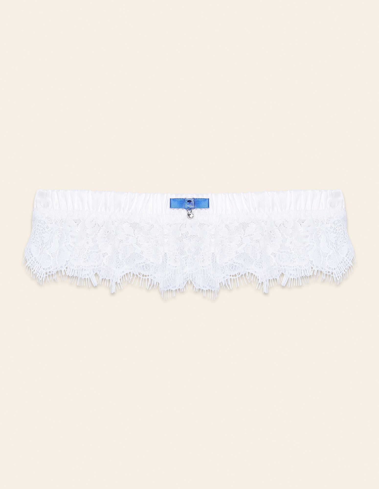 Jarretière blanche élégante Jasmine, taille unique, ornée d’un volant en dentelle rigide et d’une bande élastique recouverte de satin. Elle est ornée d’un nœud en satin bleu clair et d’un petit strass au centre. Un accessoire parfait pour compléter la lingerie de mariée.