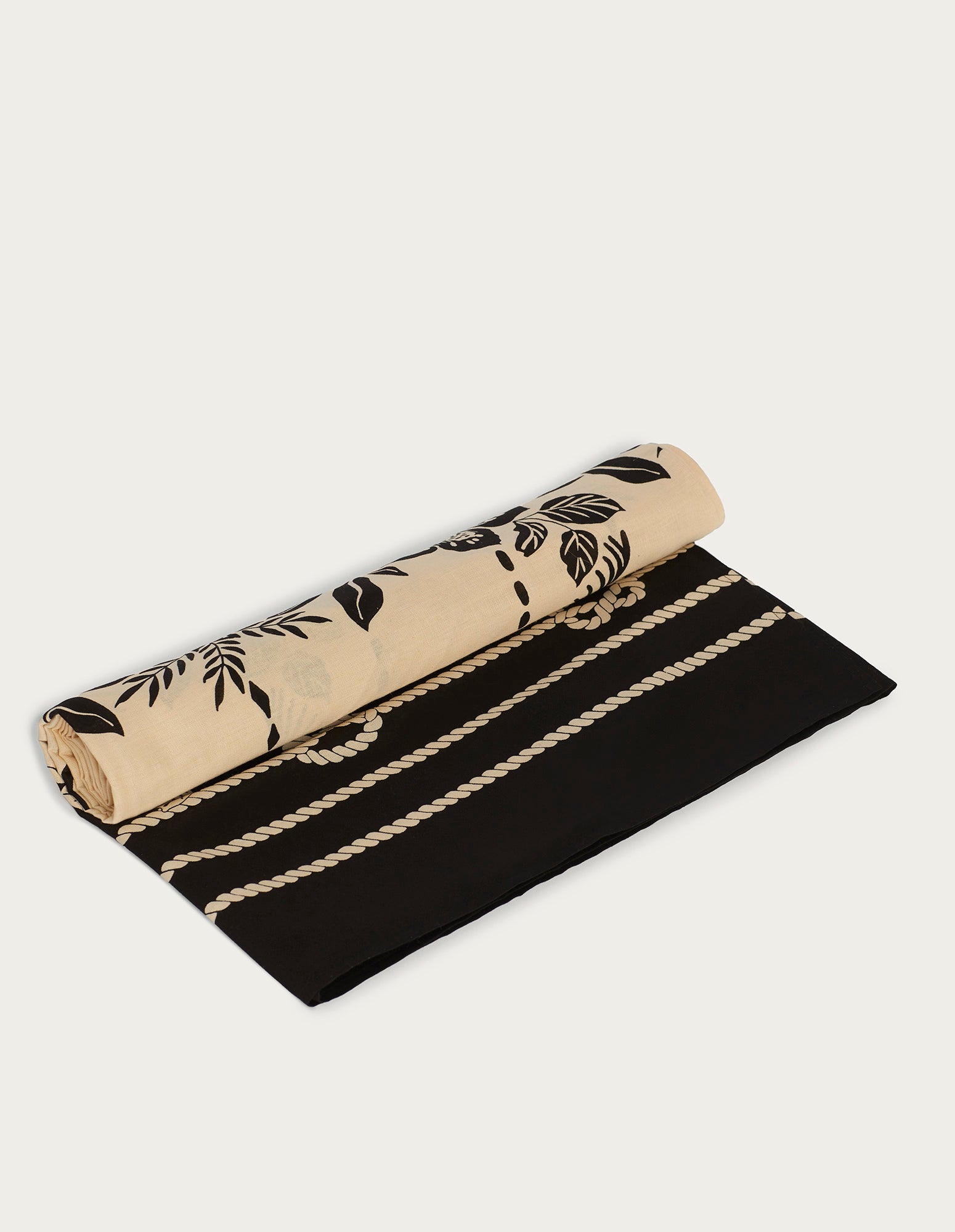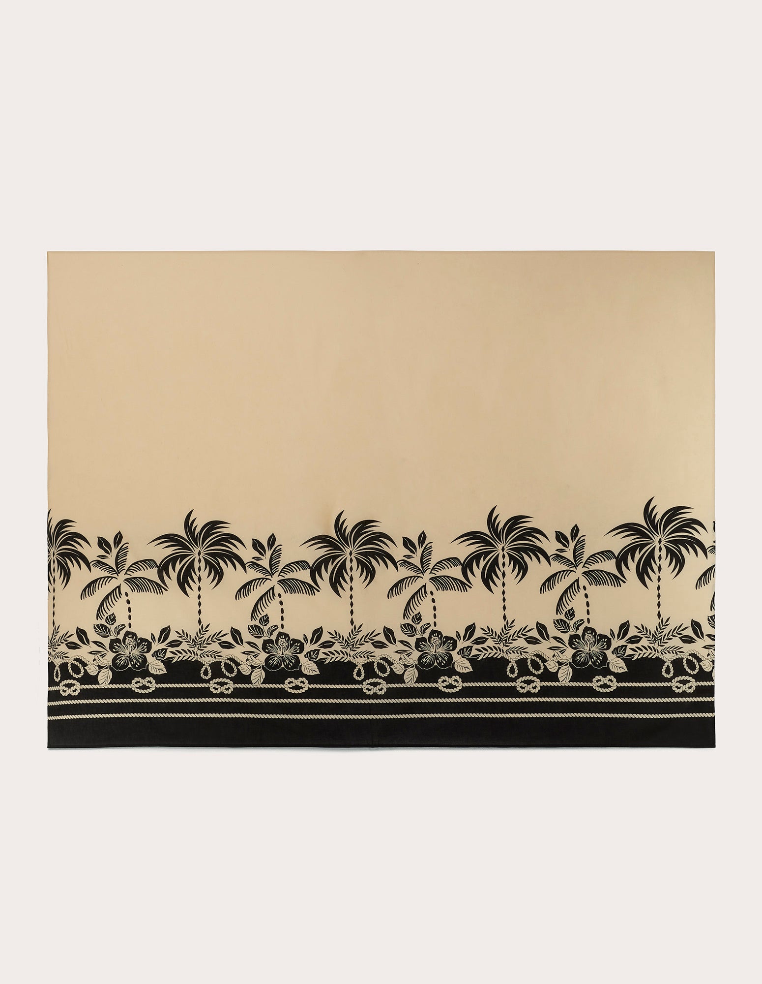Paréo long en coton et lin, lui donnant un toucher frais et léger, avec un imprimé tropical dans les tons sable et noir.