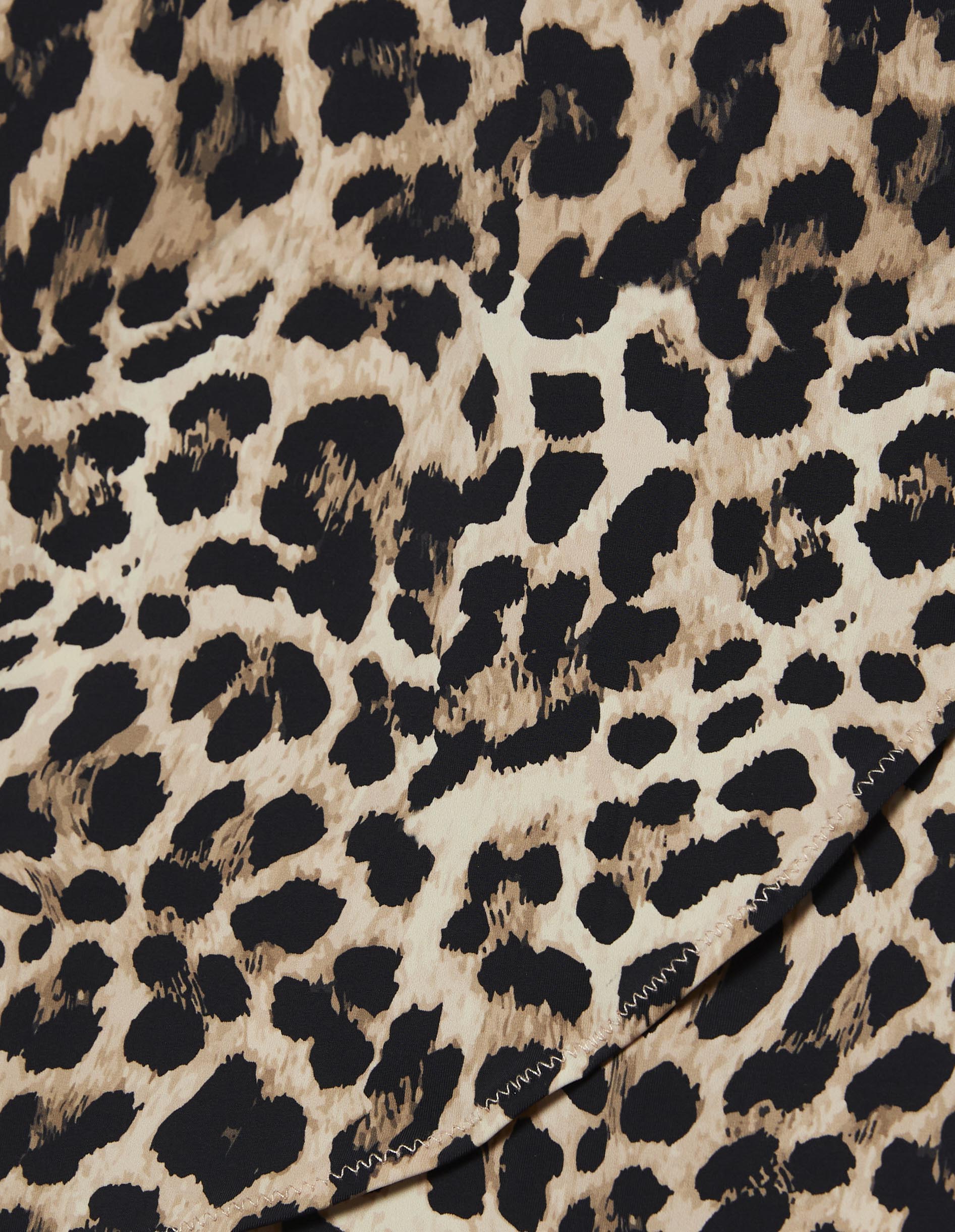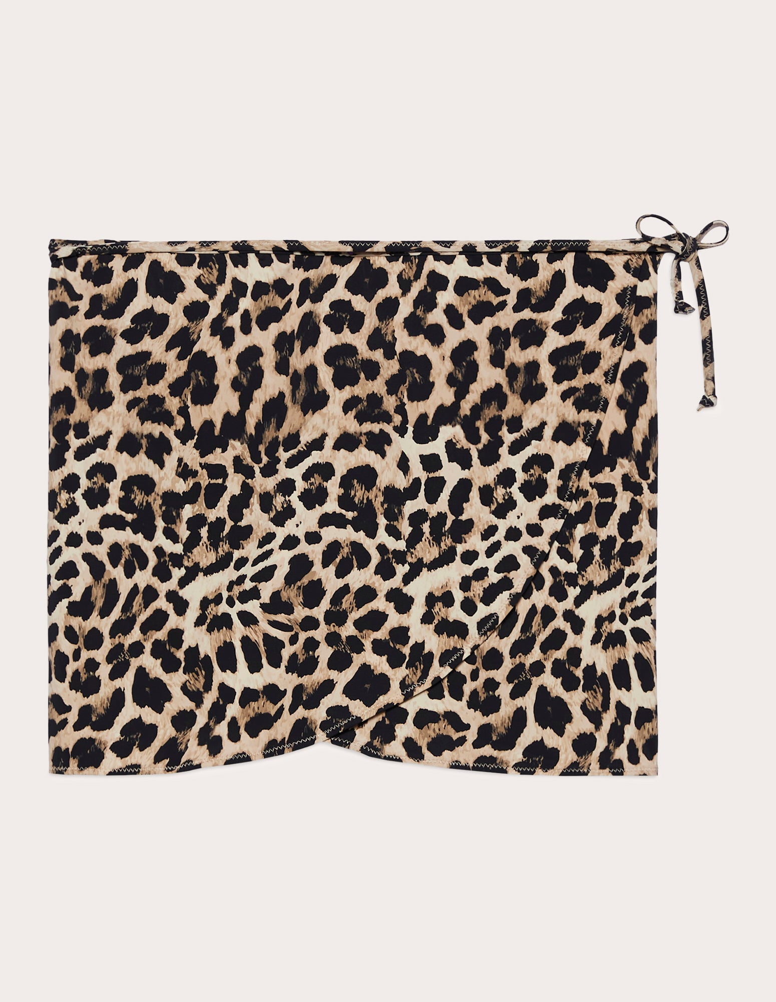 Paréo portefeuille en microfibre mate à imprimé léopard. Forme évasée asymétrique, fermeture à nouer sur le côté et longue sangle fine pour ajuster la taille ou les hanches.