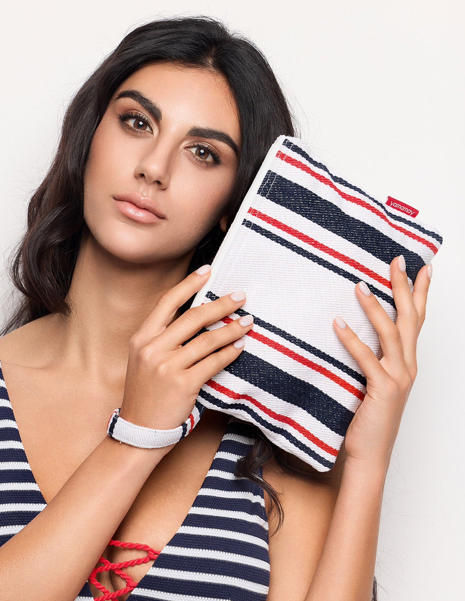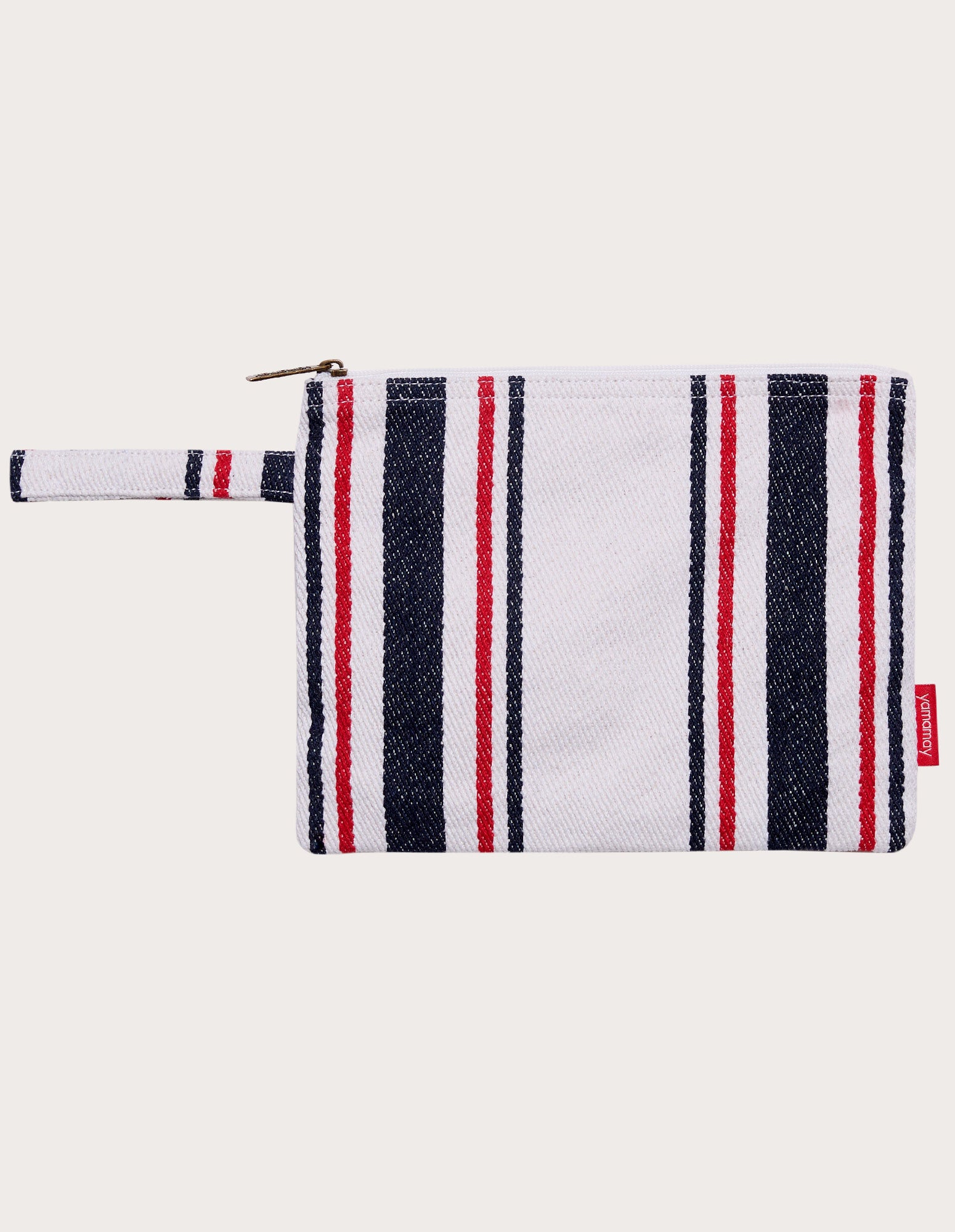 Pochette de plage compacte et fonctionnelle en tissu technique ornée d’un élégant imprimé à rayures verticales blanc, bleu marine et rouge. Son design simple et original, avec ses bords aux finitions soignées et sa fermeture éclair pratique sur le dessus, permet de ranger vos petits objets personnels comme vos clés, votre téléphone ou votre crème solaire. La dragonne latérale, assortie à l’imprimé principal, facilite le port au poignet. Idéale seule ou associée au cabas assorti.
