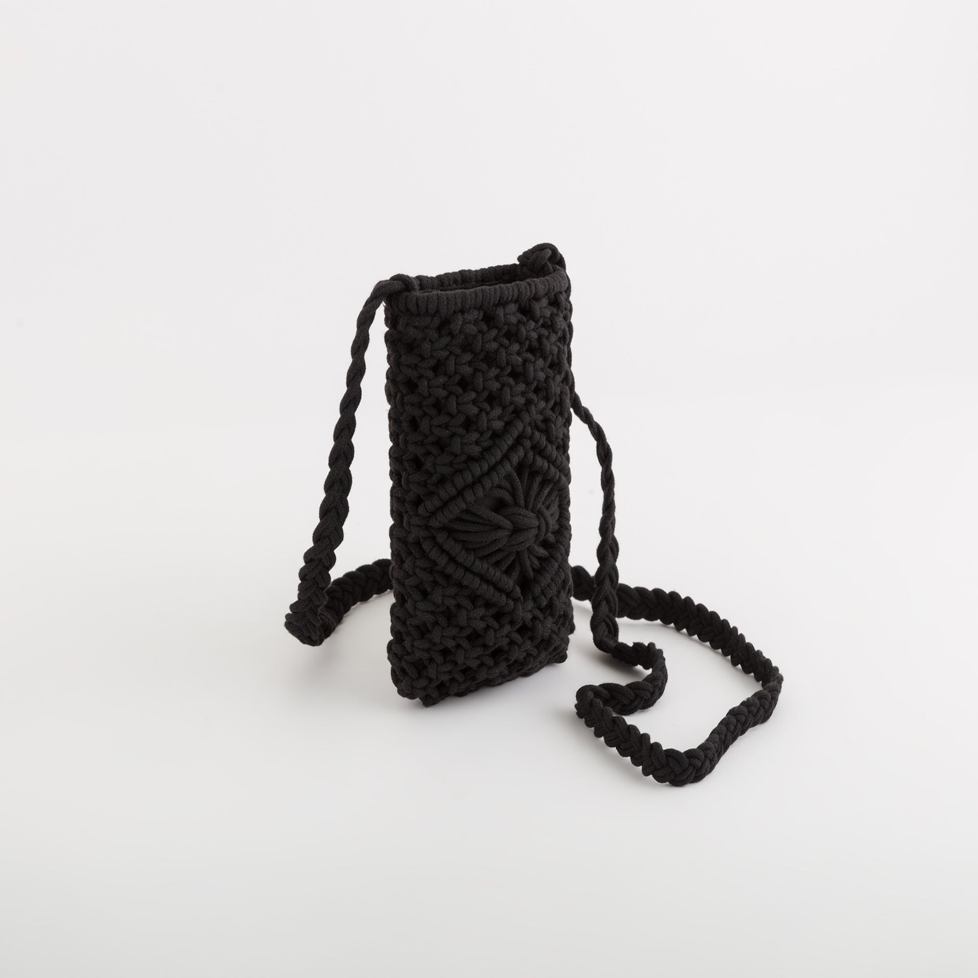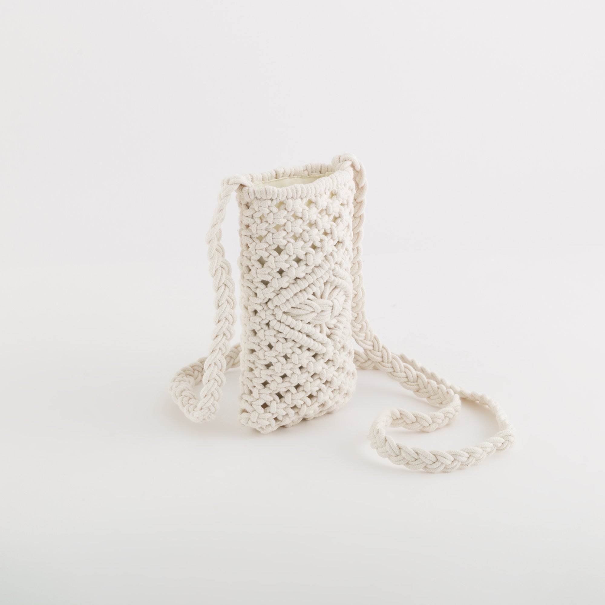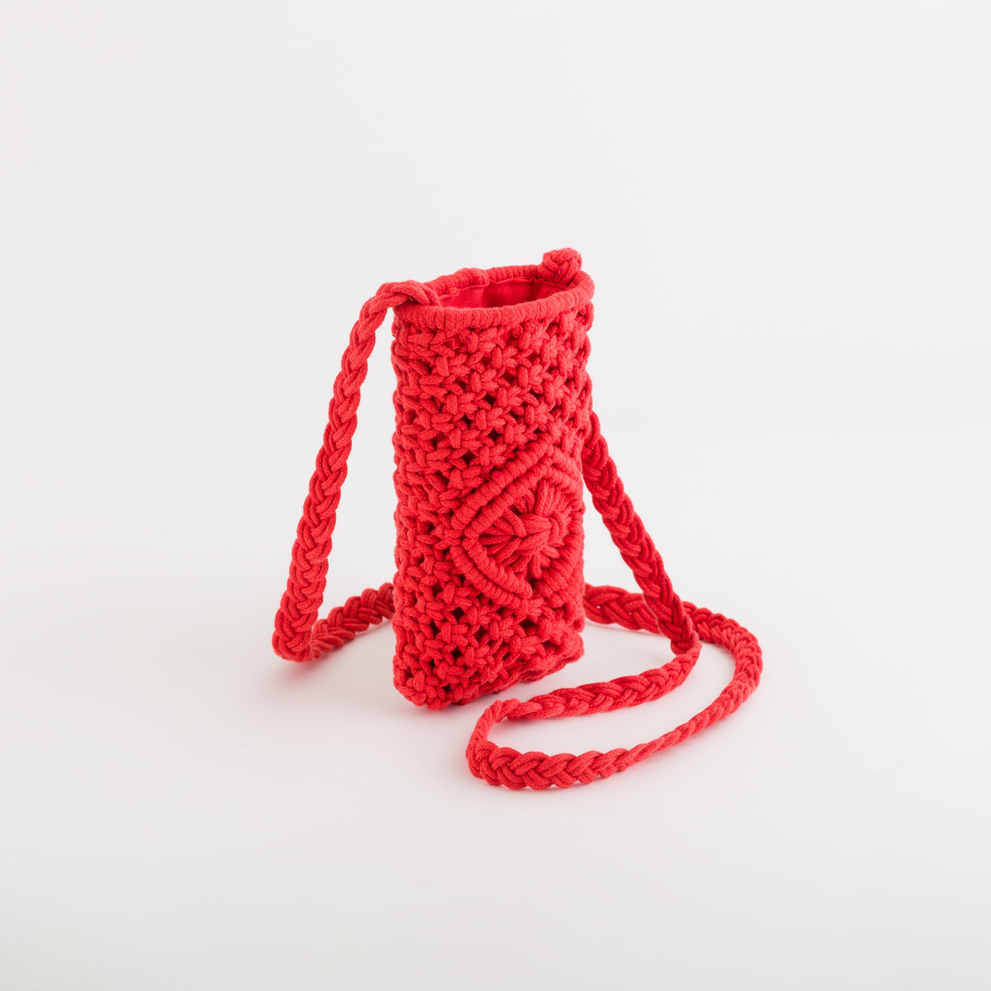 Étui pour téléphone portable de la collection Rodi de Carpisa, en coton crocheté. Ce modèle est doté d’une longue bandoulière permettant de le porter autour du cou.
