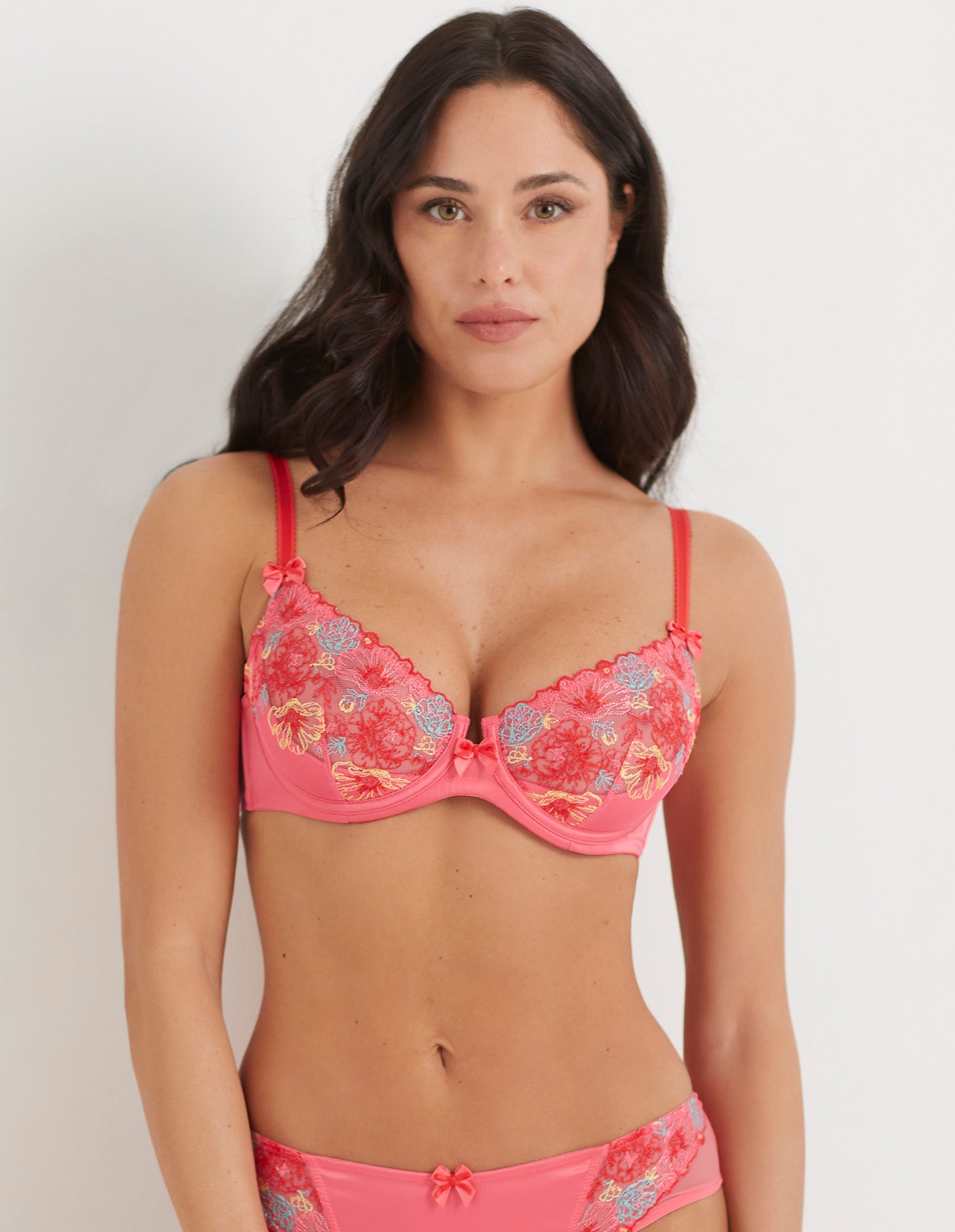 Pour une humeur printanière parfaite, rien de tel que des fleurs ! La ligne de sous-vêtements pour femme Ashley est un délicat mélange de broderie, de satin et de tulle, le tout confectionné à partir de fibres recyclées. La base est d’un rose géranium vif et tendance. Le soutien-gorge balconnet, non doublé et à armatures, est disponible jusqu’au bonnet 6D, pour sublimer toutes les courbes.