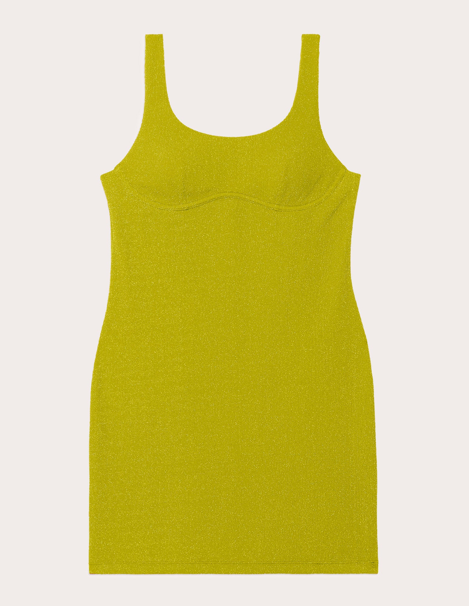Robe débardeur femme en jacquard extensible avec lurex gaufré, avec bonnets moulés et larges bretelles. Disponible en deux coloris.