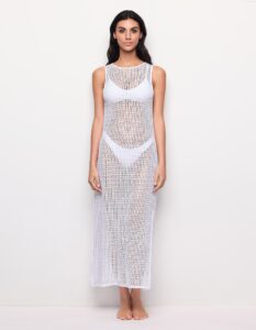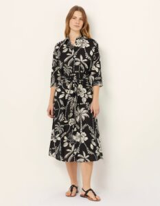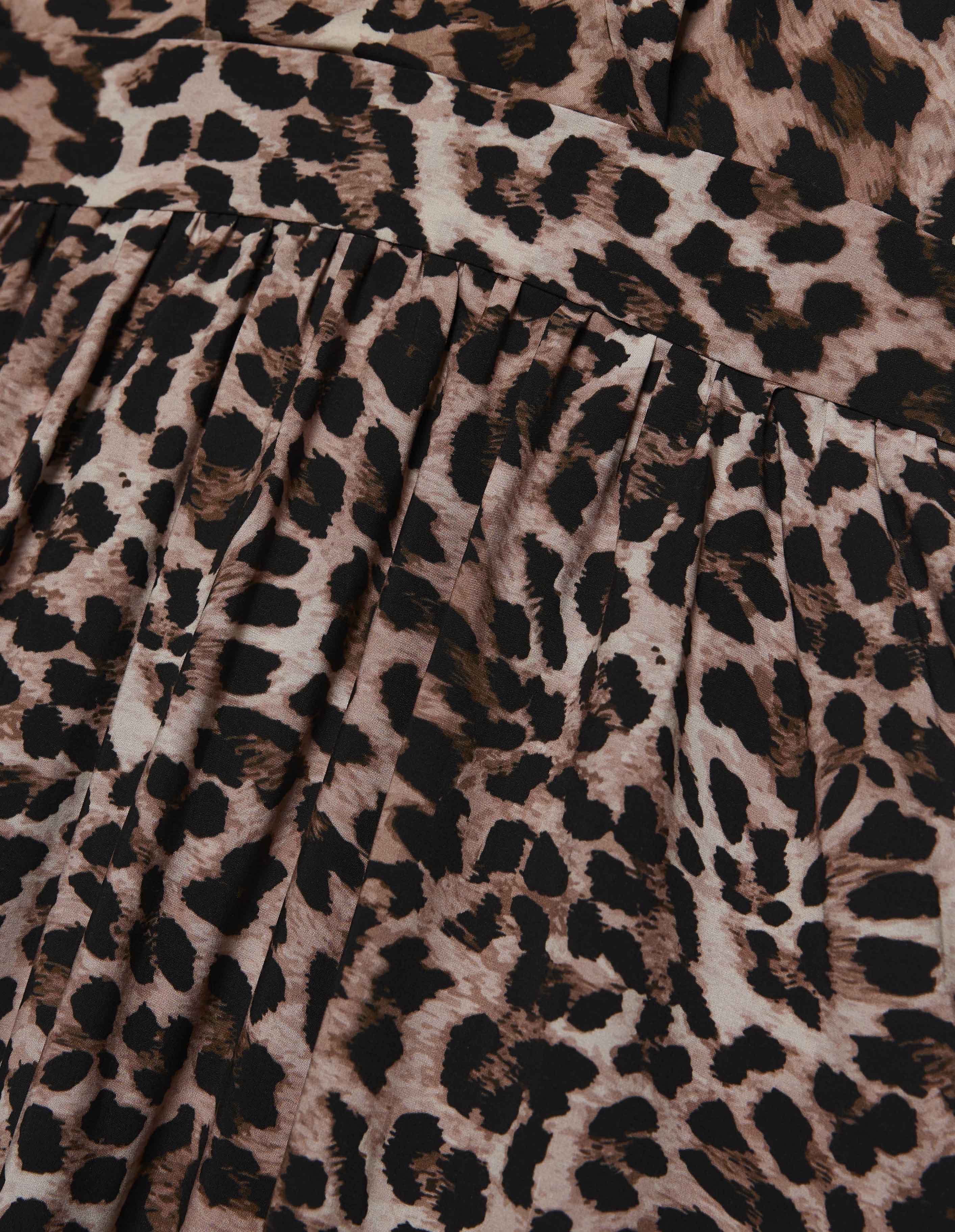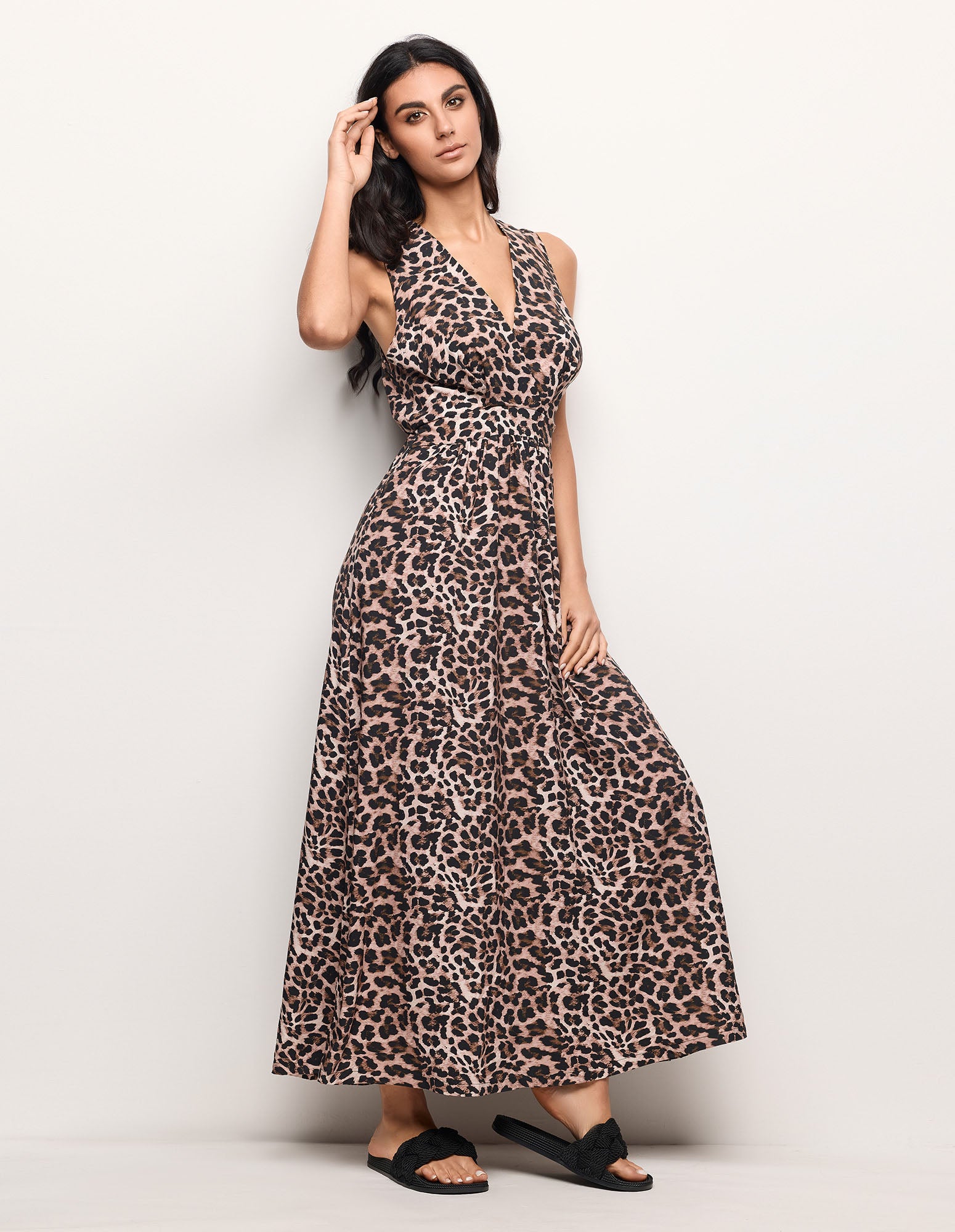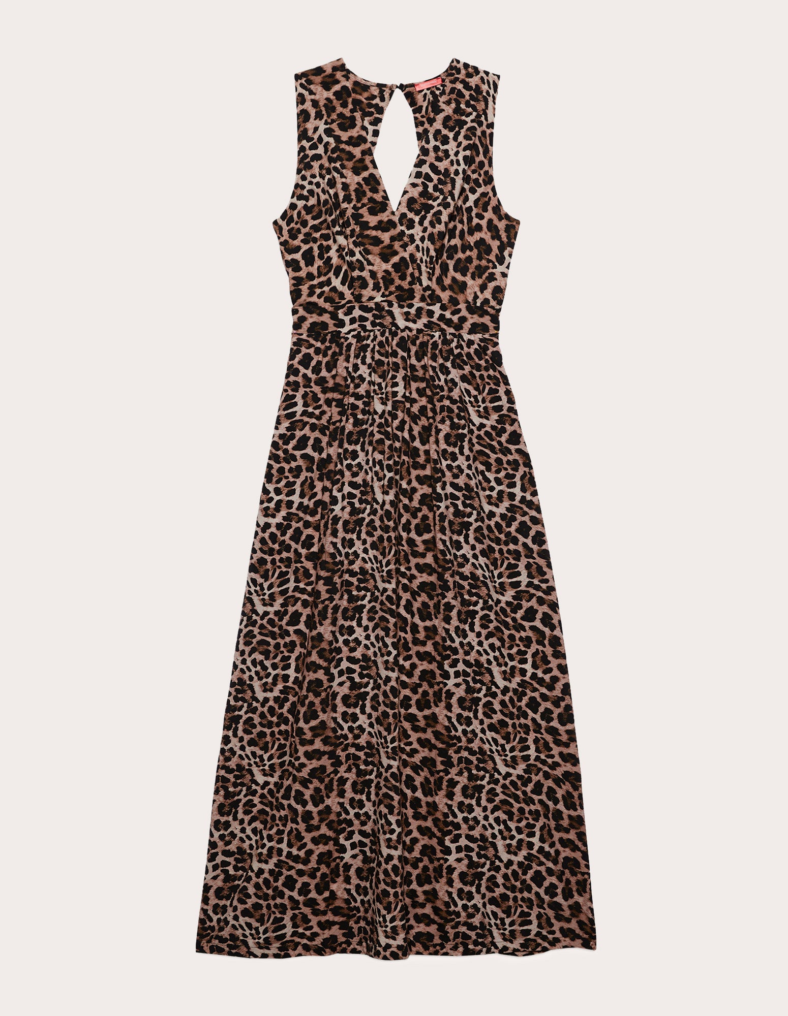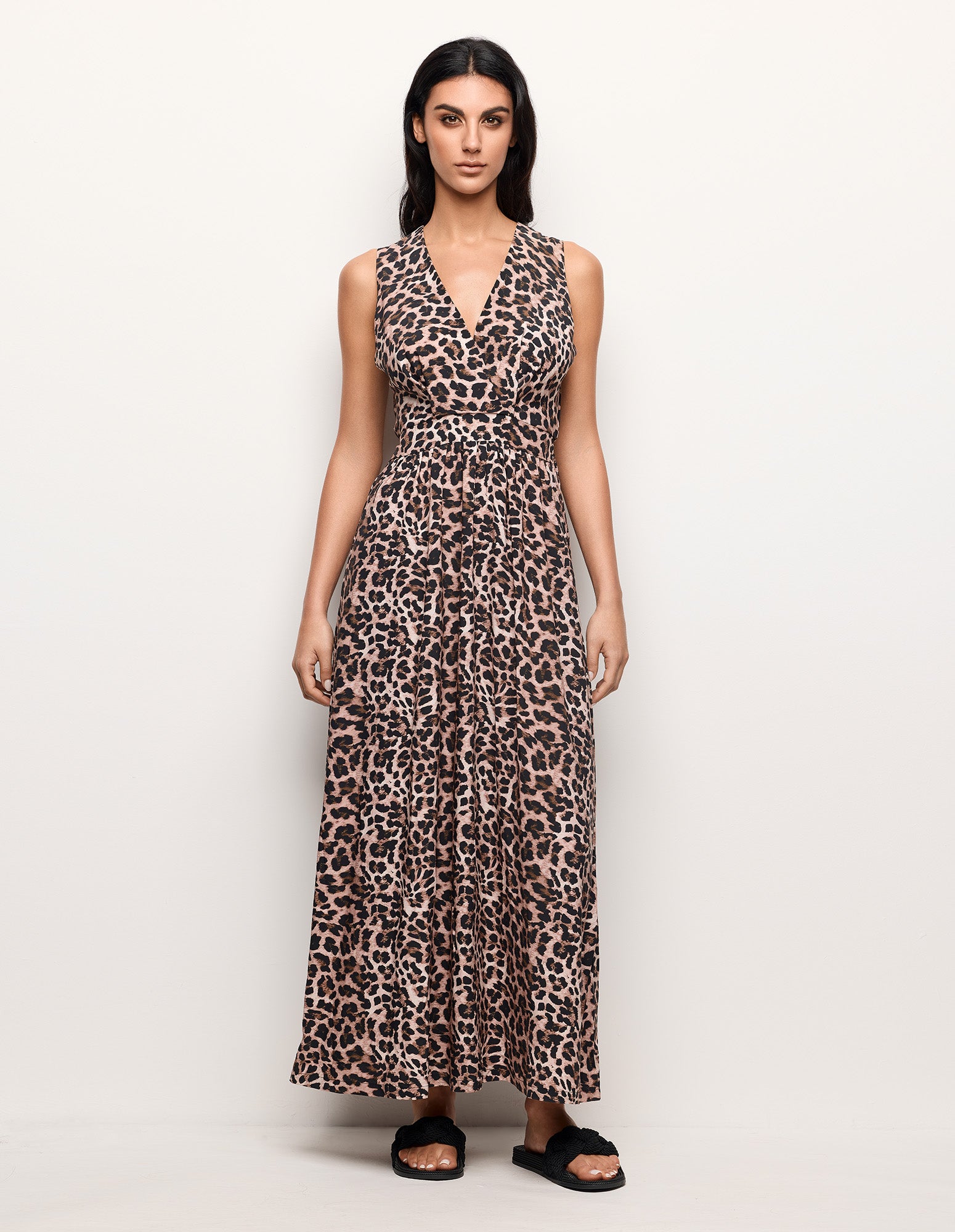 Robe longue sans manches en viscose à imprimé léopard. Décolleté en V profond devant et ouverture goutte d’eau dans le dos. Silhouette évasée et fluide avec fronces élastiquées sous la poitrine pour souligner la taille.
