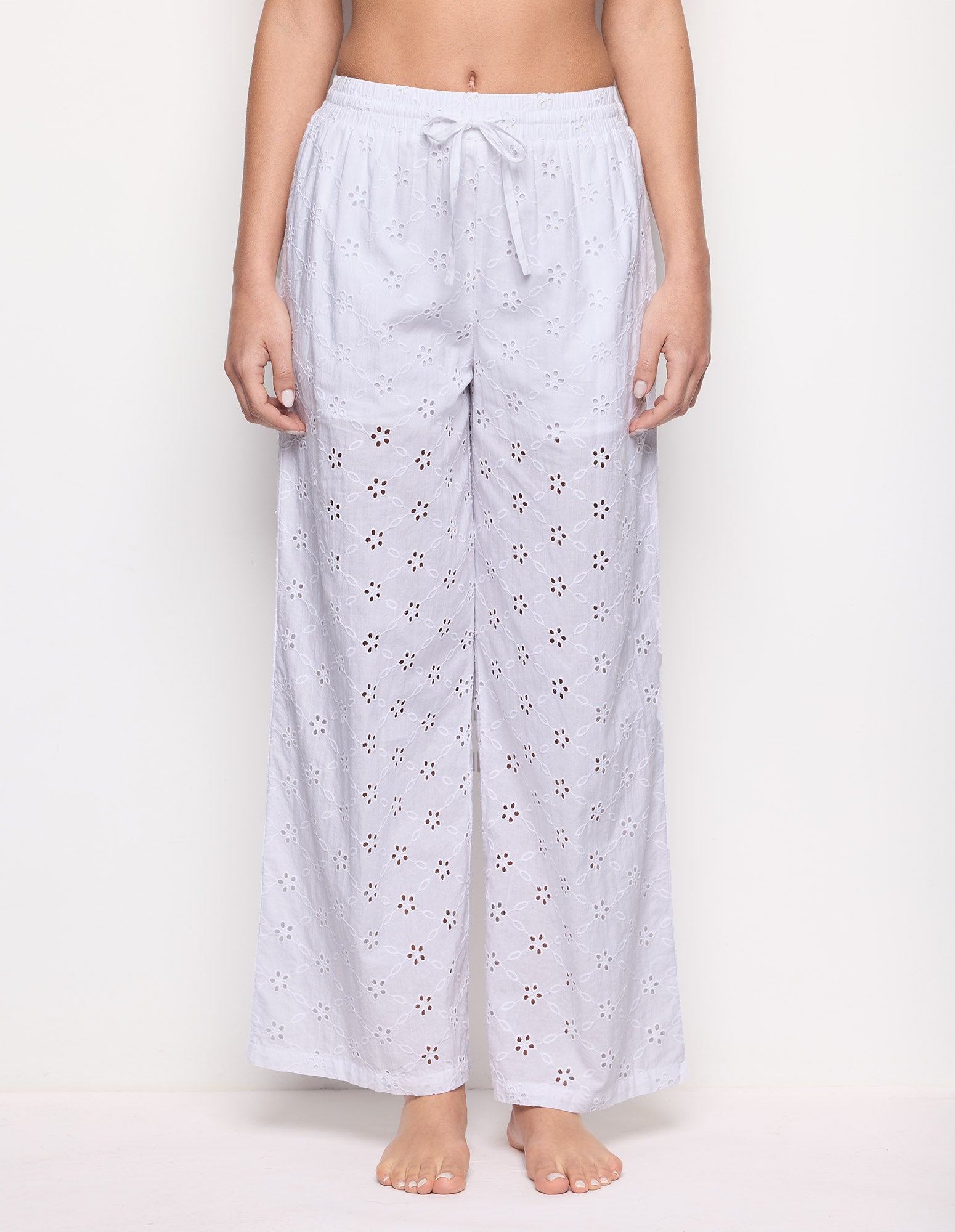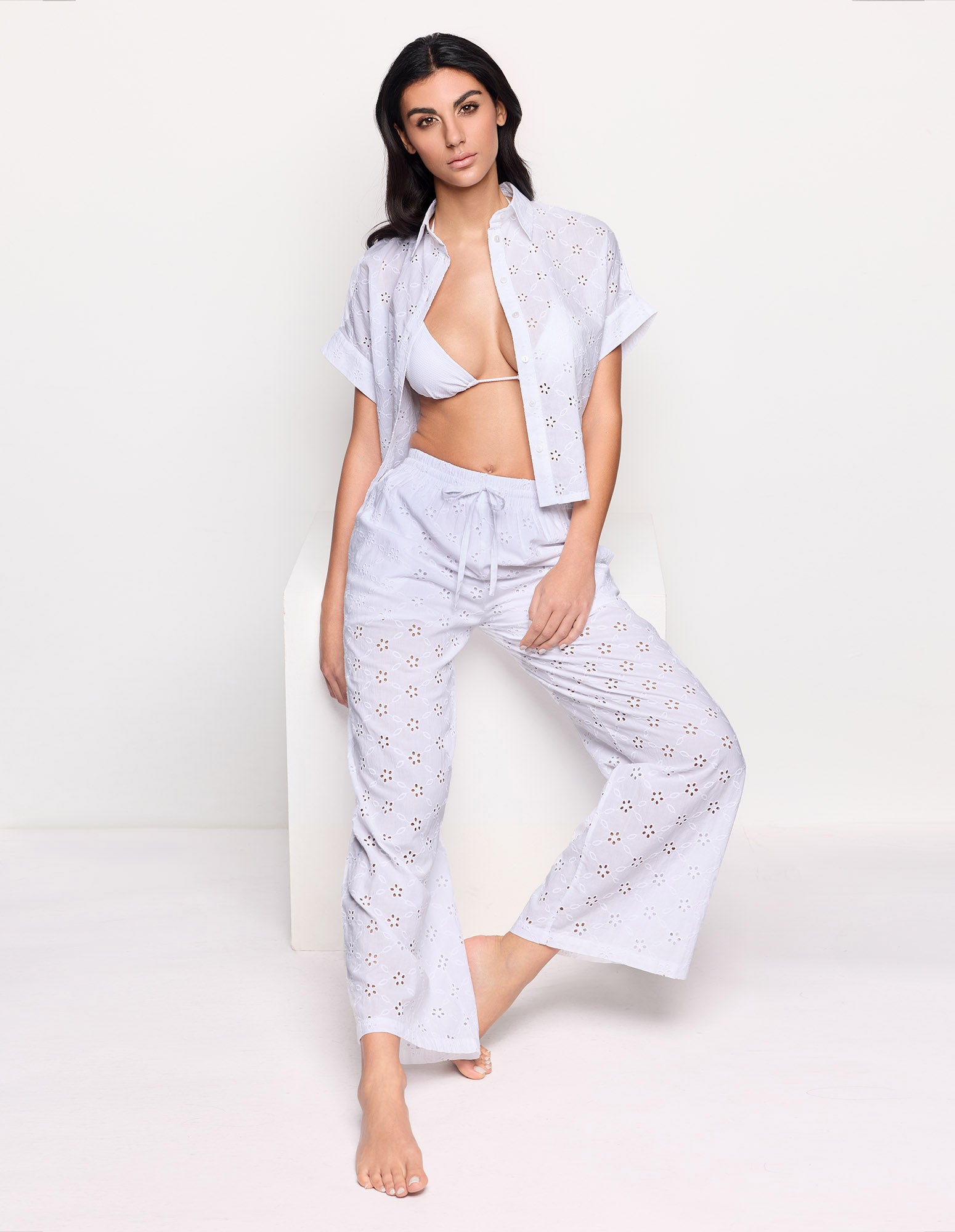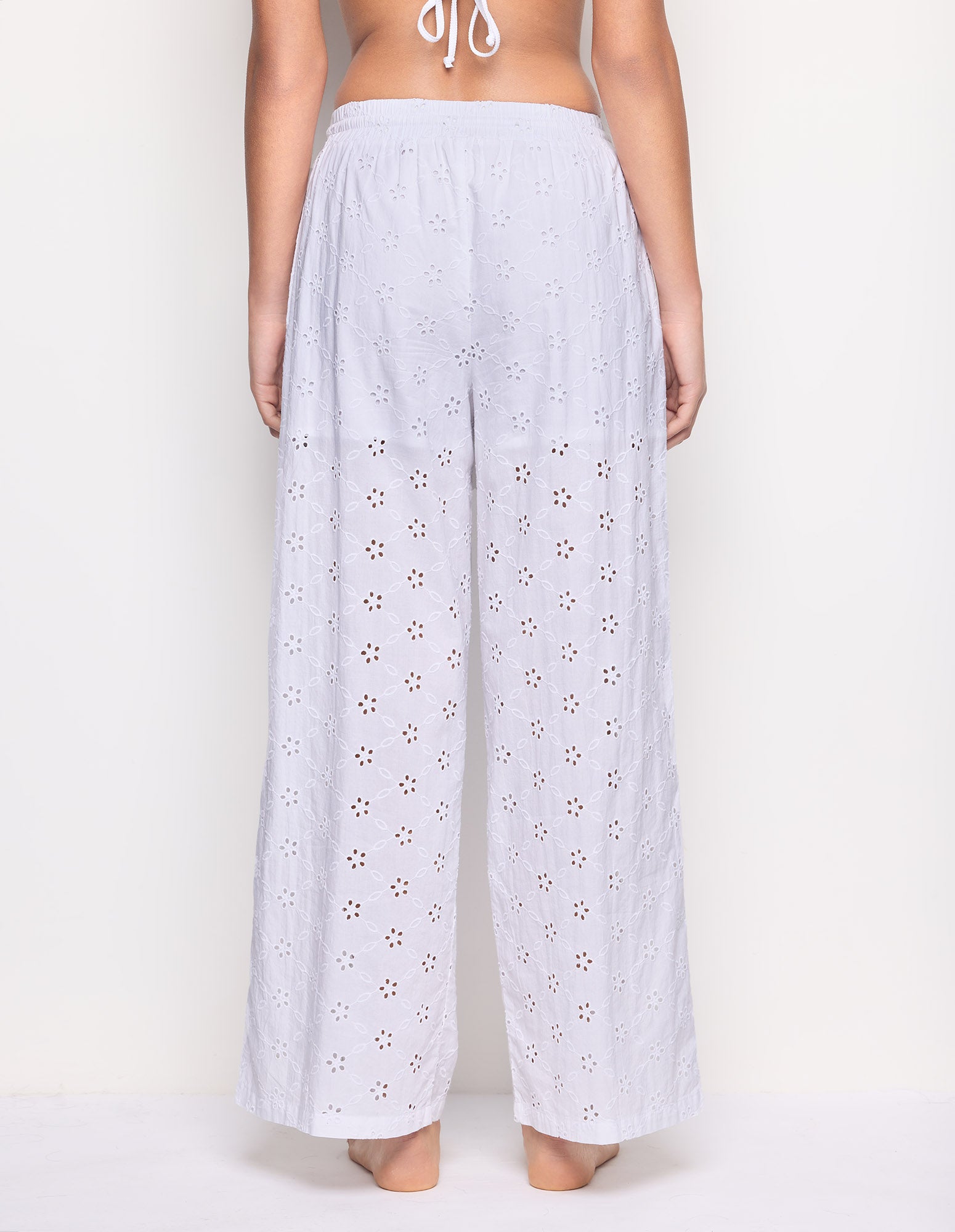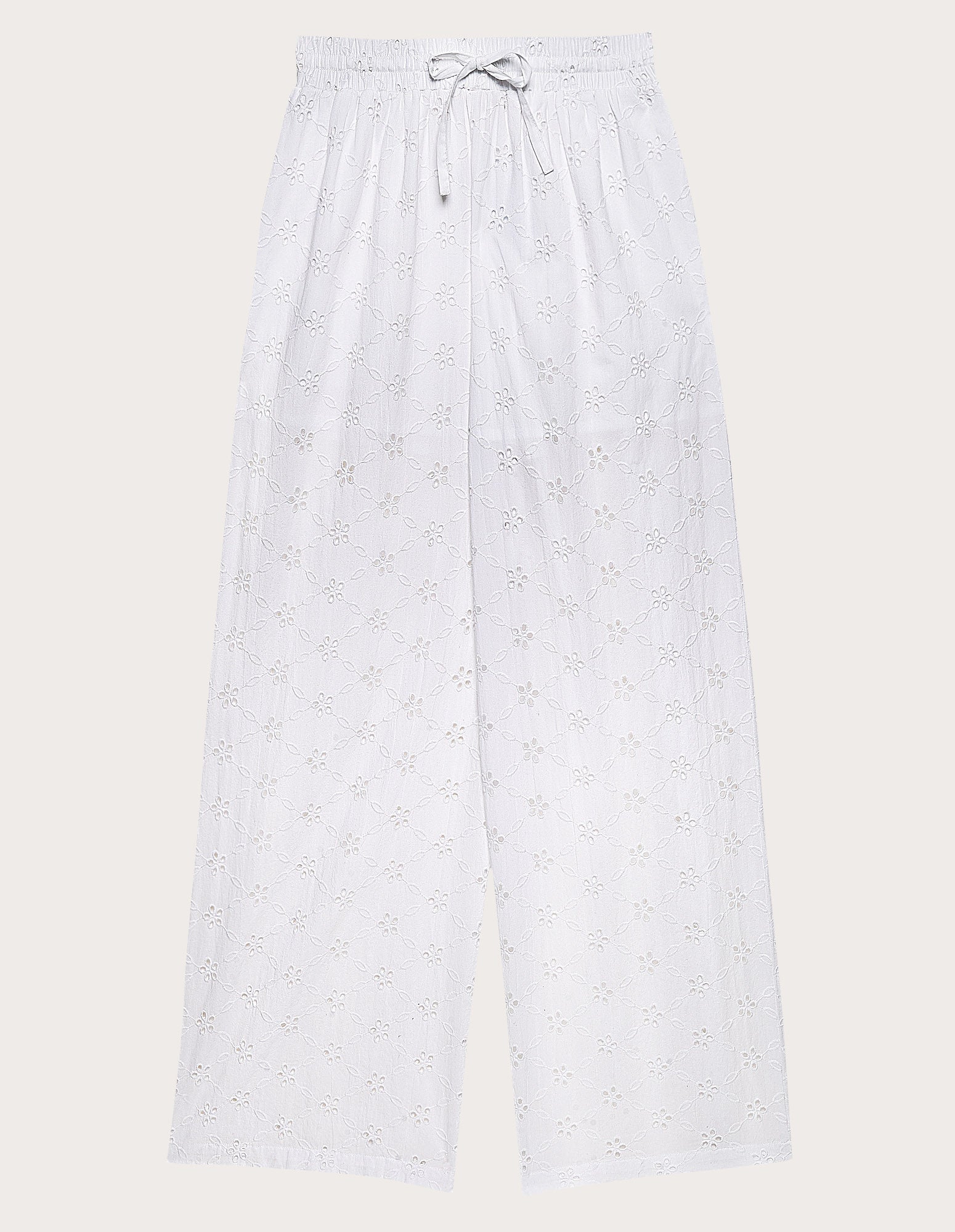 Pantalon long pour femme en tissu Sangallo perforé orné de motifs floraux brodés pour un look élégant et romantique. Sa coupe ample et fluide offre confort et aisance, idéale pour des tenues estivales légères. La taille élastiquée avec cordon de serrage permet un ajustement personnalisé. Une doublure intérieure courte assure confort et couverture malgré la délicate transparence du tissu. Un vêtement pratique et raffiné, parfait aussi bien pour les tenues de plage que pour les looks décontractés de jour.