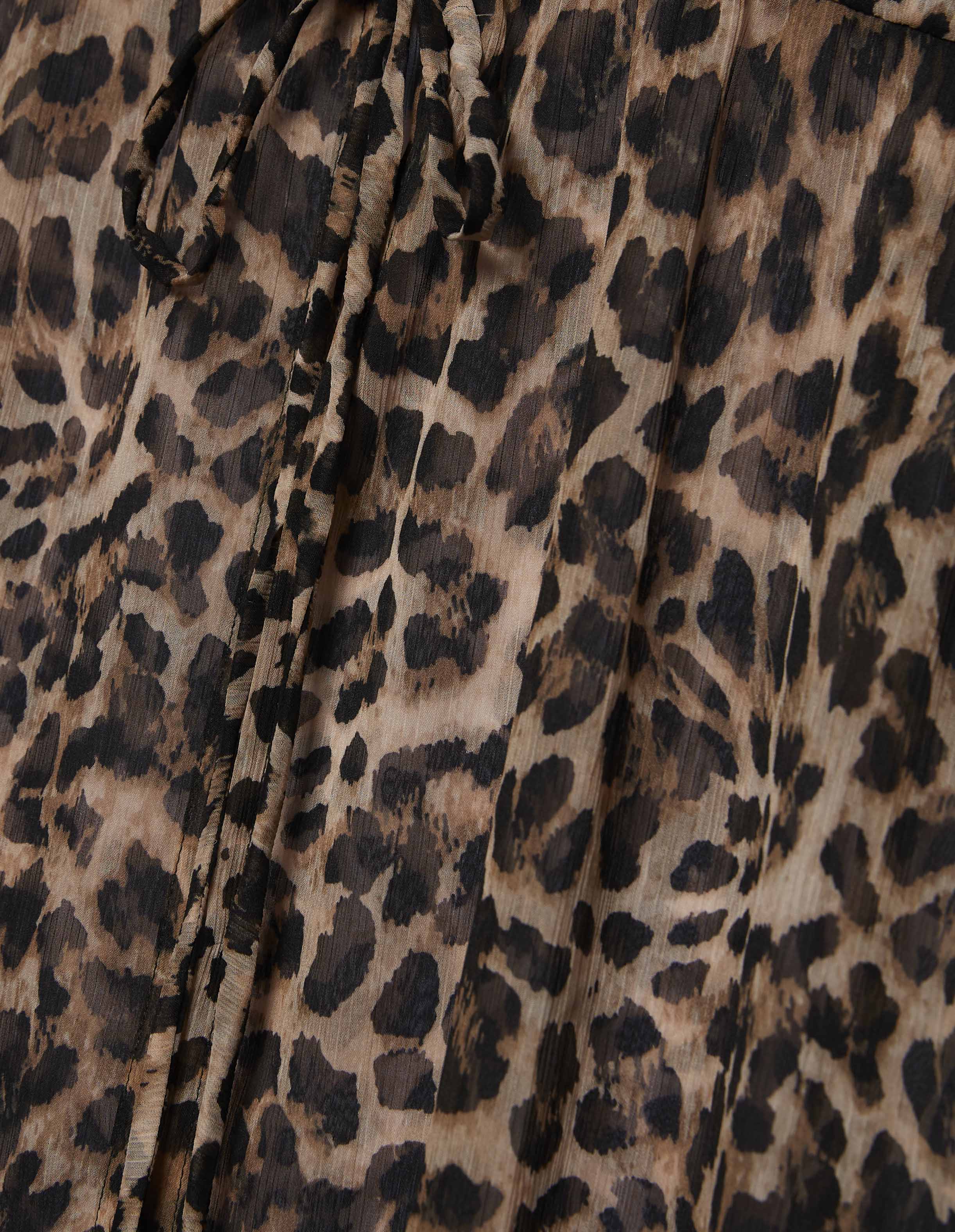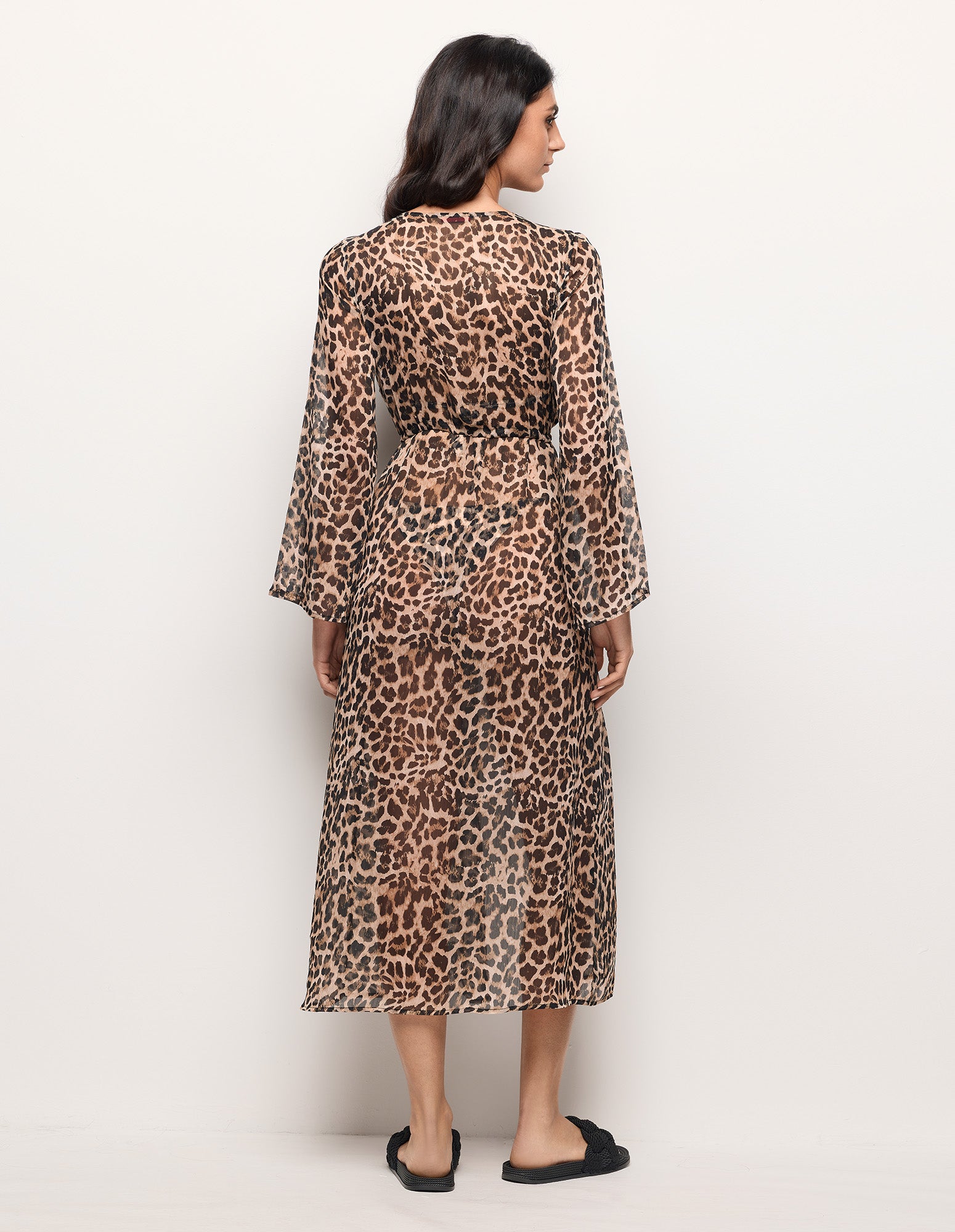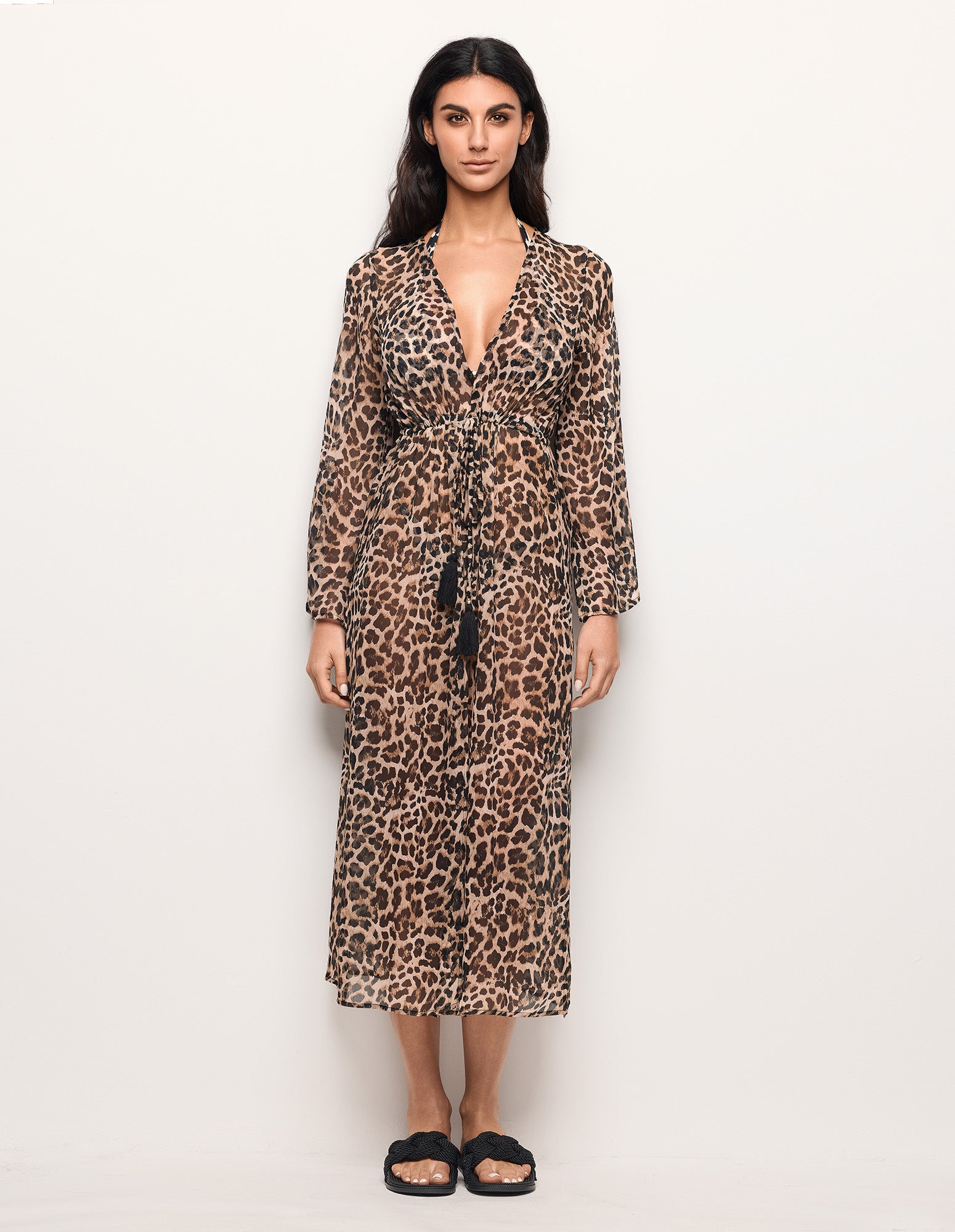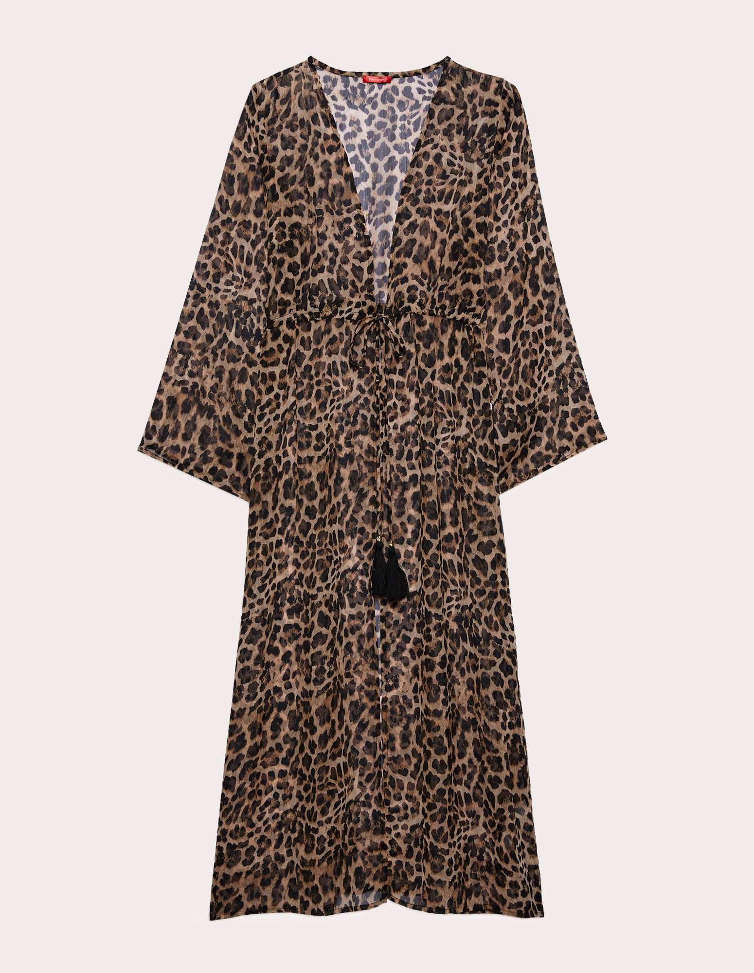 Long caftan en mousseline de soie à imprimé léopard et décolleté en V profond. Il est doté d’une ouverture sur le devant et d’un cordon de serrage ajustable à la taille, avec lien en tissu assorti, et de cordons noirs à pampilles. Idéal comme paréo de plage ou comme tenue de villégiature élégante.