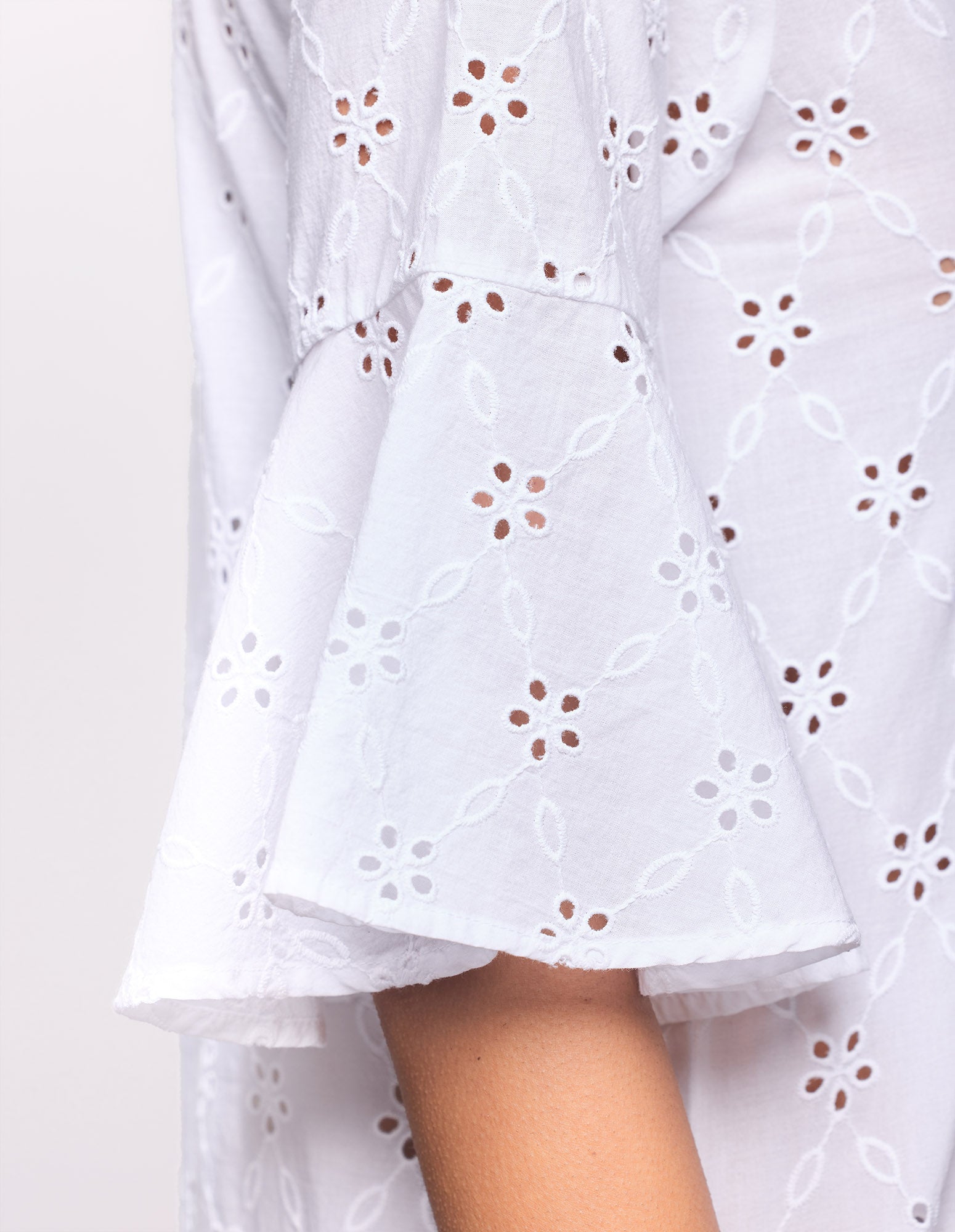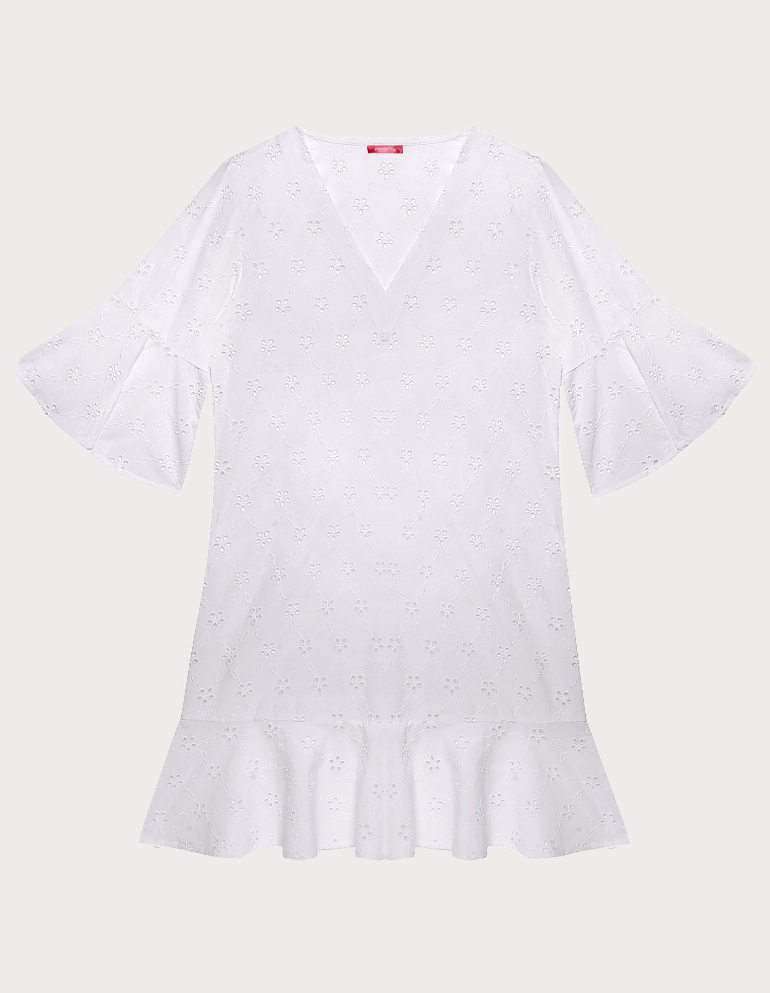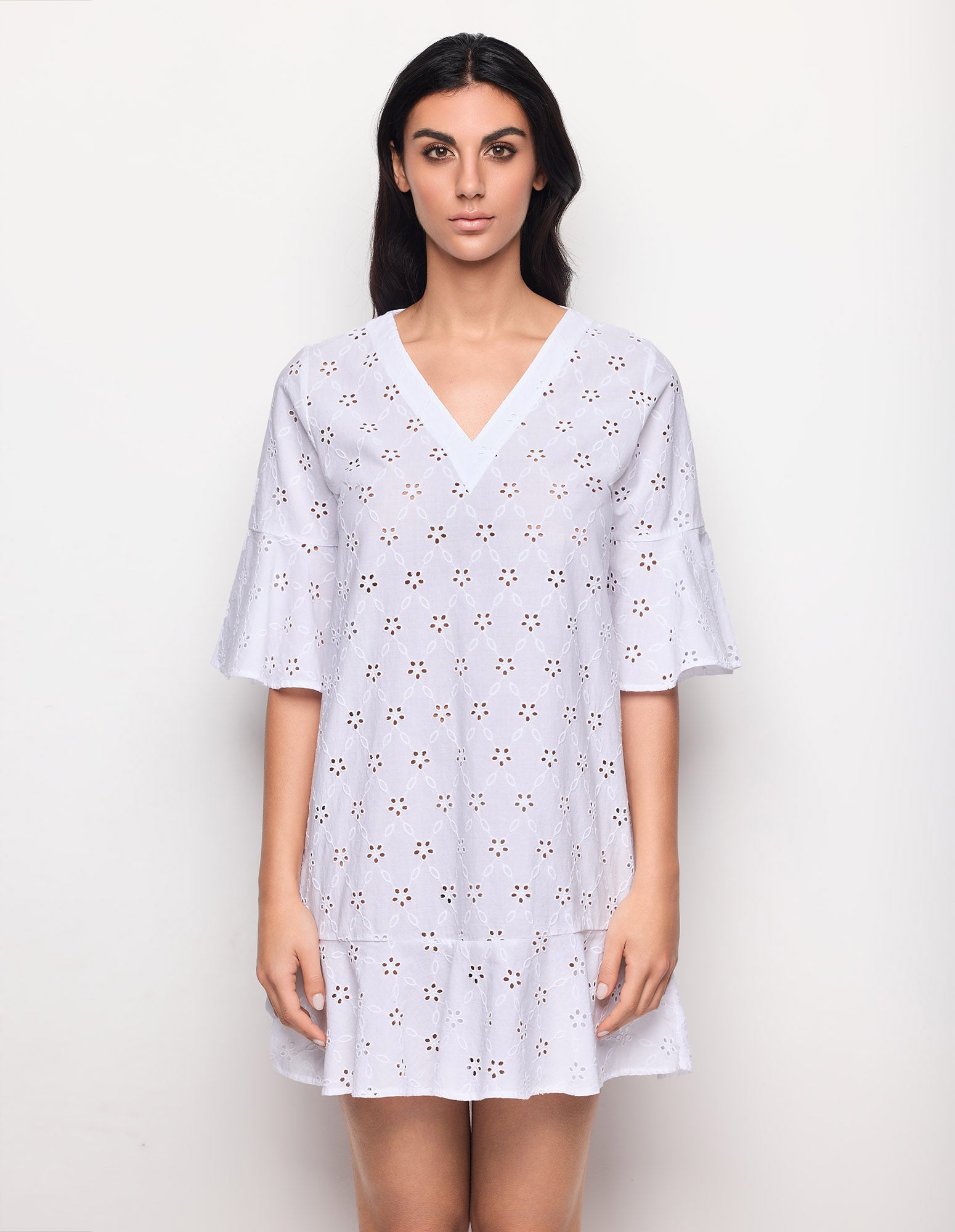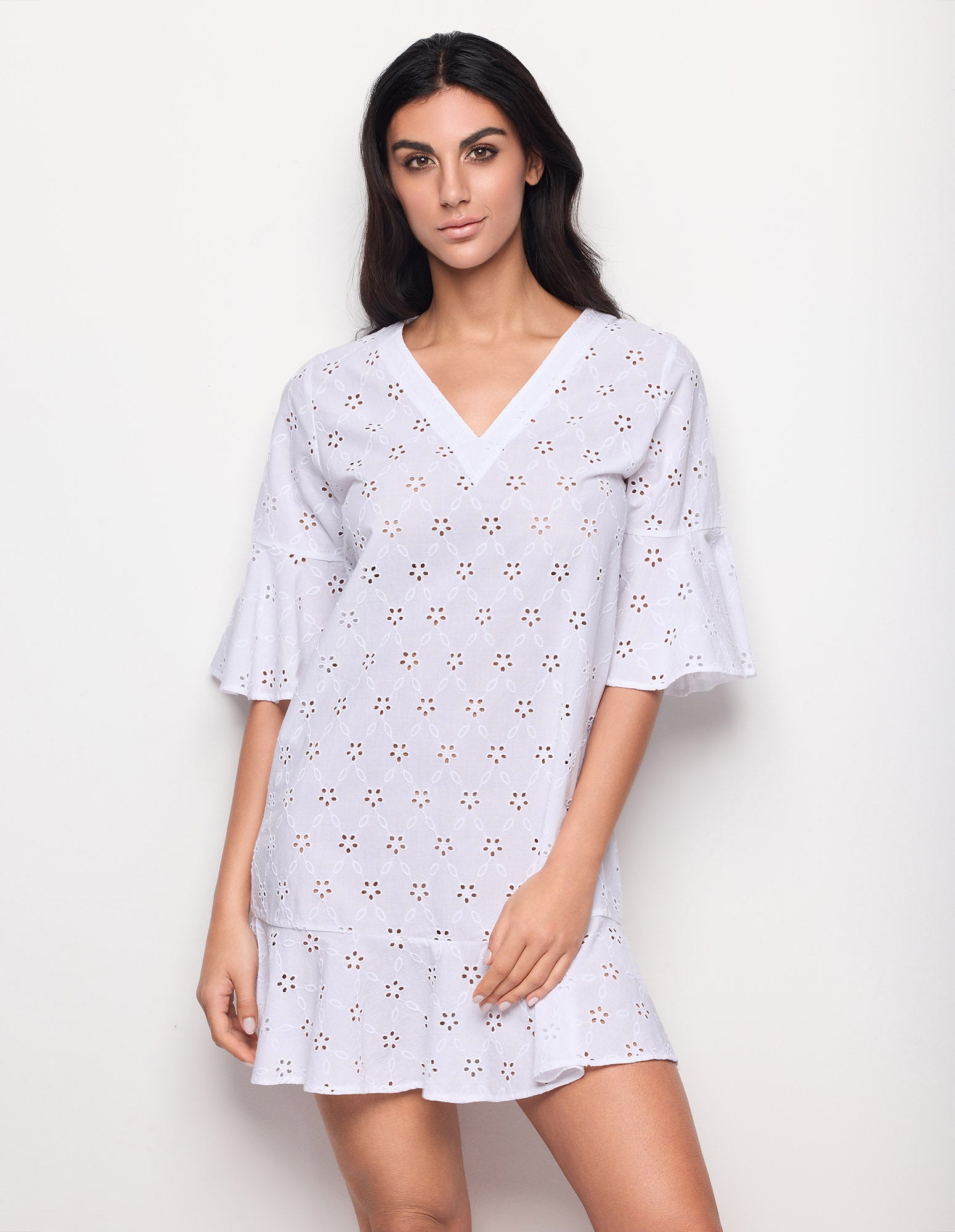 Caftan court pour femme en tissu léger orné de broderies Sangallo et décoré de délicats motifs floraux perforés. Sa coupe décontractée présente un décolleté en V flatteur et des manches trois-quarts à volants aux poignets pour plus de mouvement et de féminité. L’ourlet est orné d’un large volant rappelant les manches, conférant au vêtement une allure aérienne et raffinée. Idéal pour se couvrir à la plage ou pour des tenues d’été décontractées et élégantes.