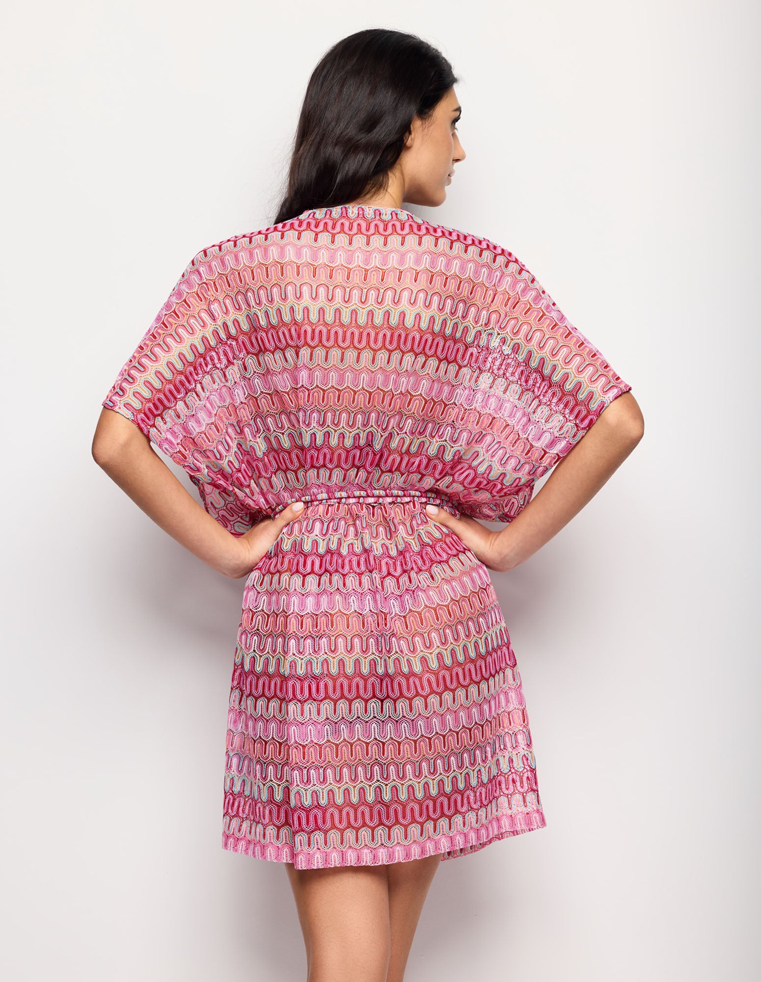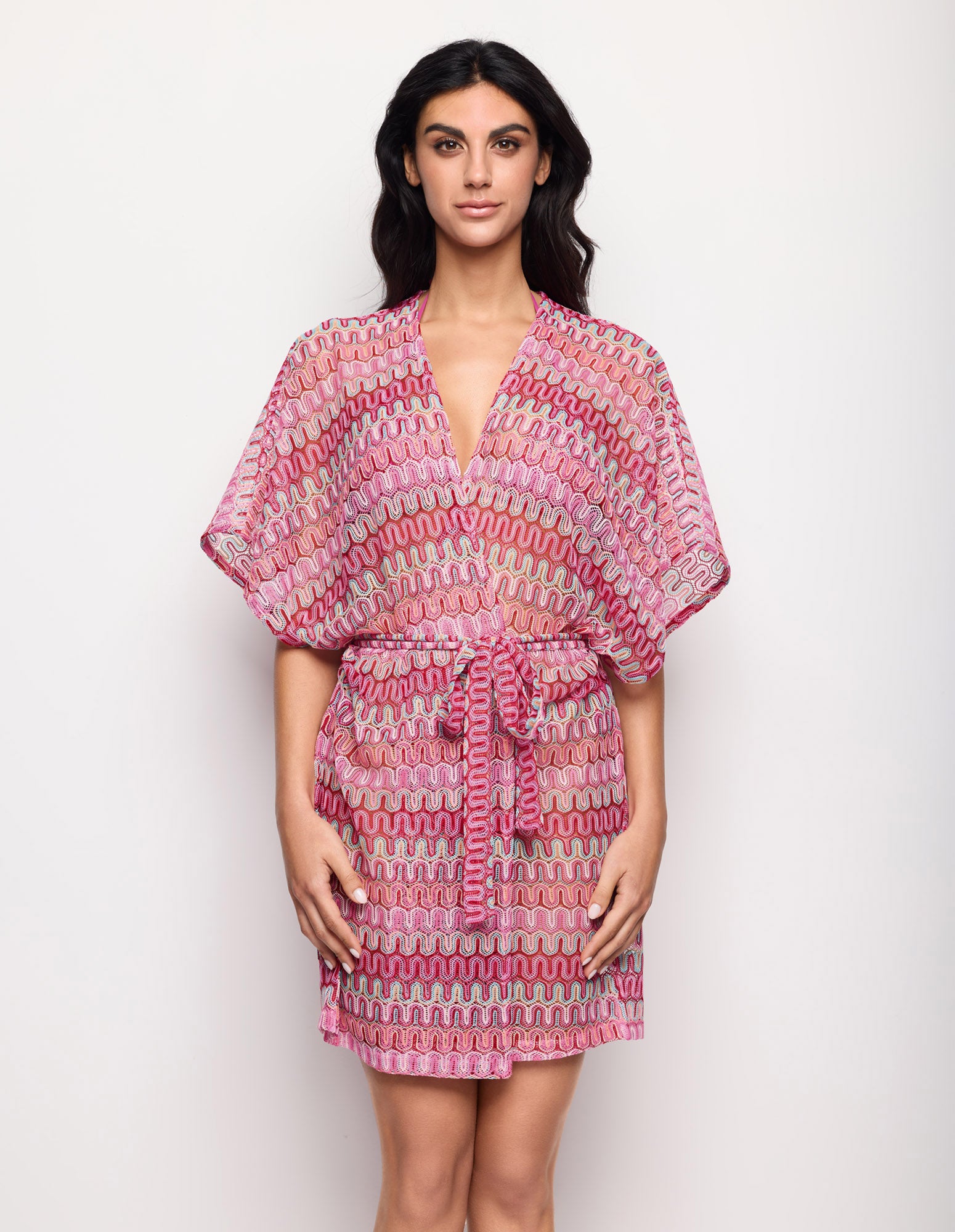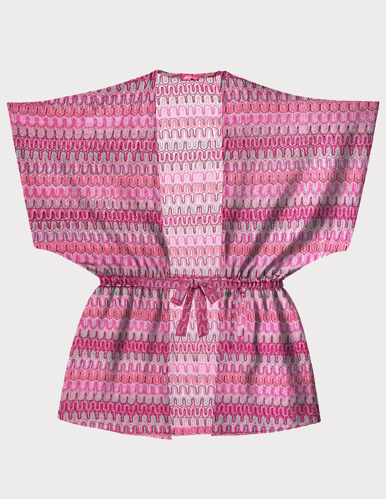 Caftan court et ouvert pour femme, avec ceinture à la taille. Ce vêtement présente une coupe ample et fluide, des manches amples et carrées et un motif à rayures ondulées dans des tons roses.