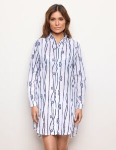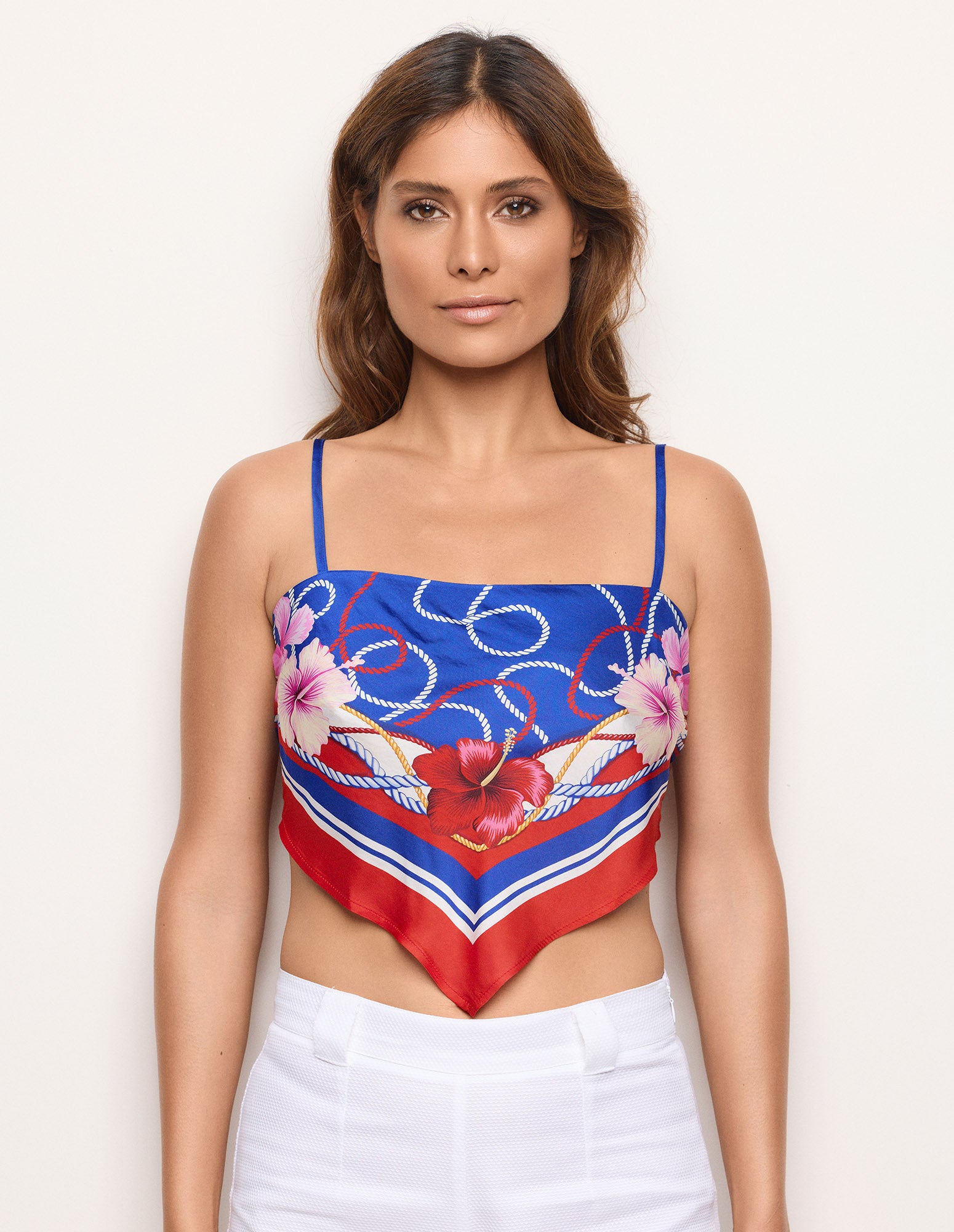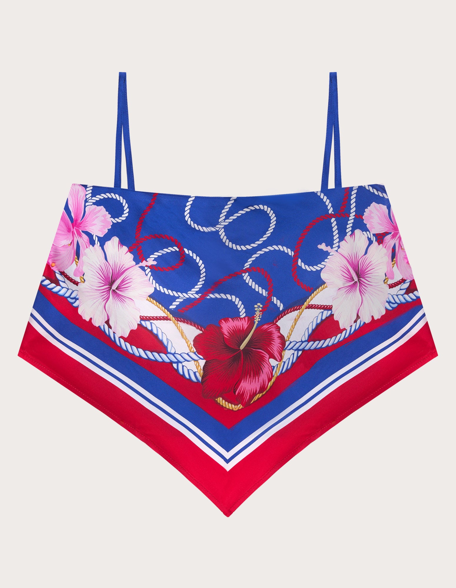 Haut en viscose pour femme, orné d’un imprimé floral et nautique sur fond bleu. Coupe style bandana avec des pointes au milieu devant et au dos. Bretelles fines réglables et lien à nouer au dos pour un ajustement personnalisé. Les bords rouges contrastants apportent une touche de couleur vive.