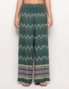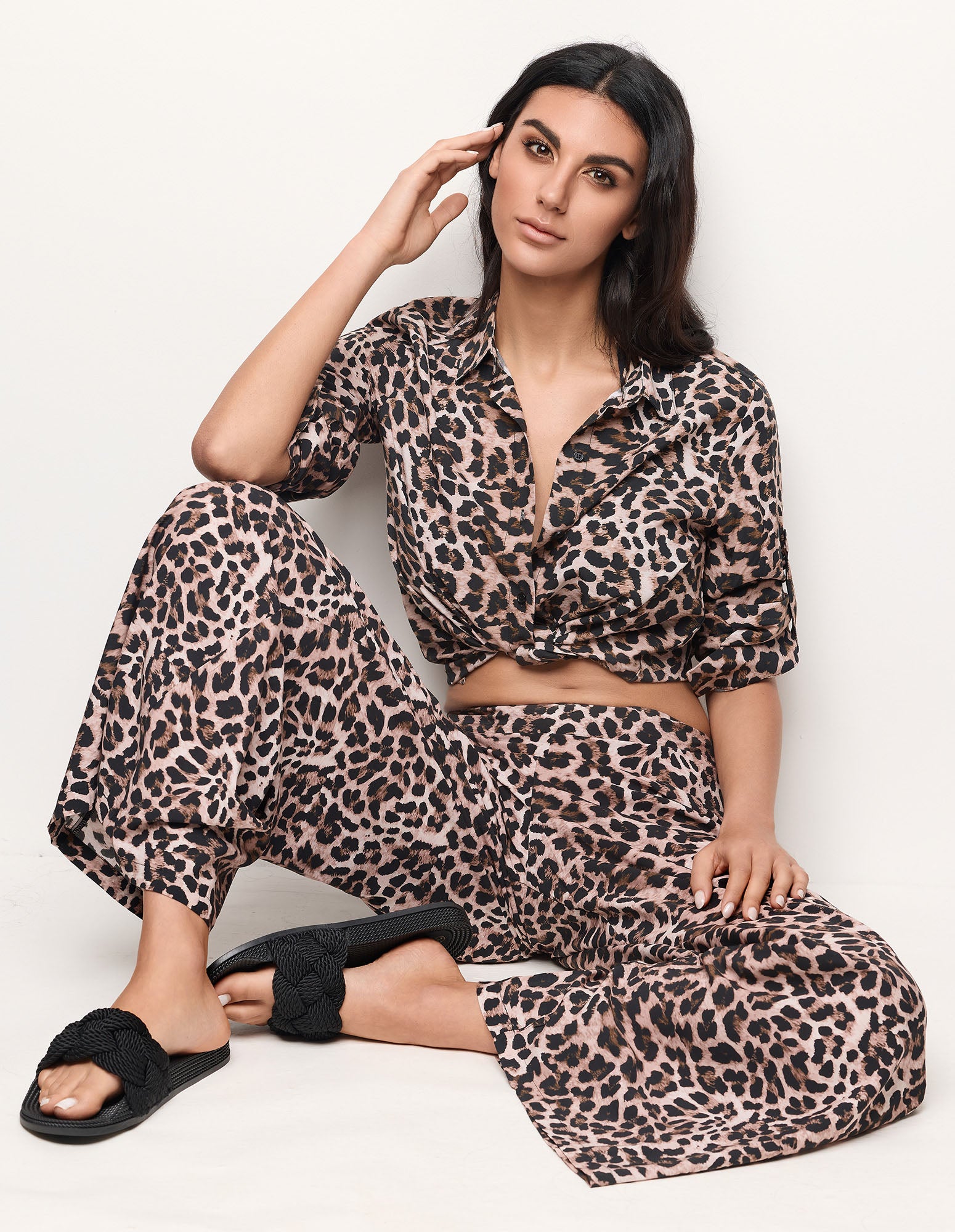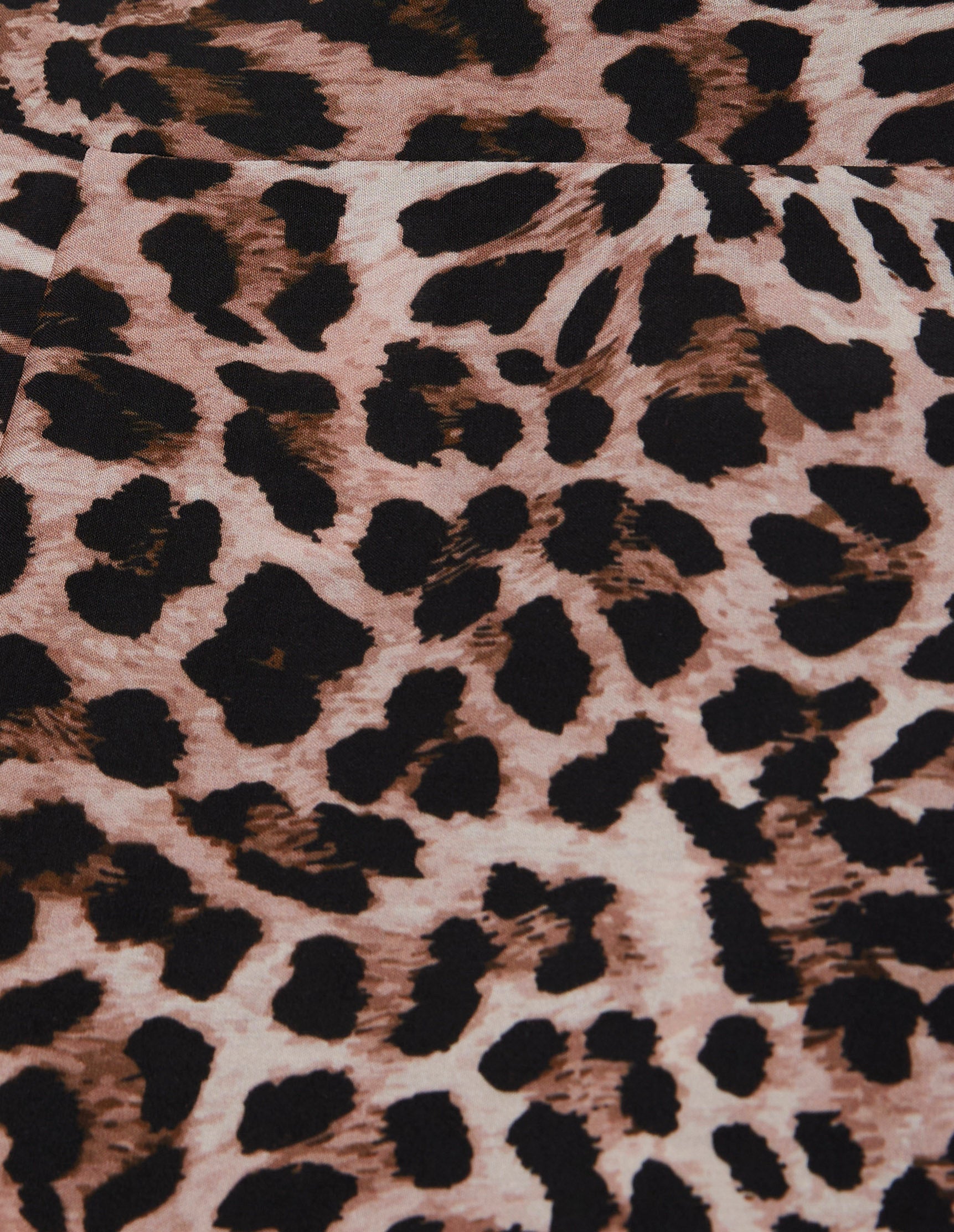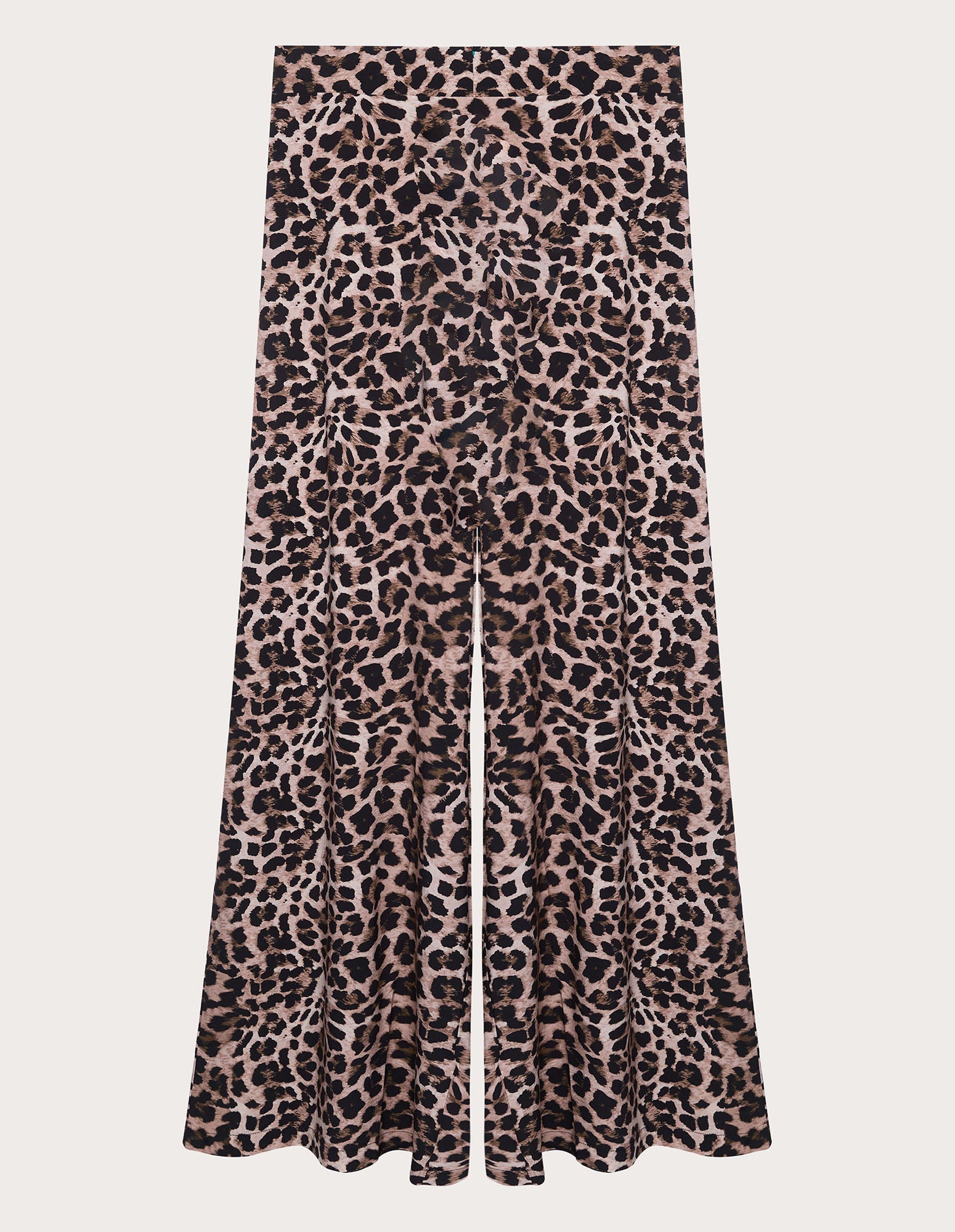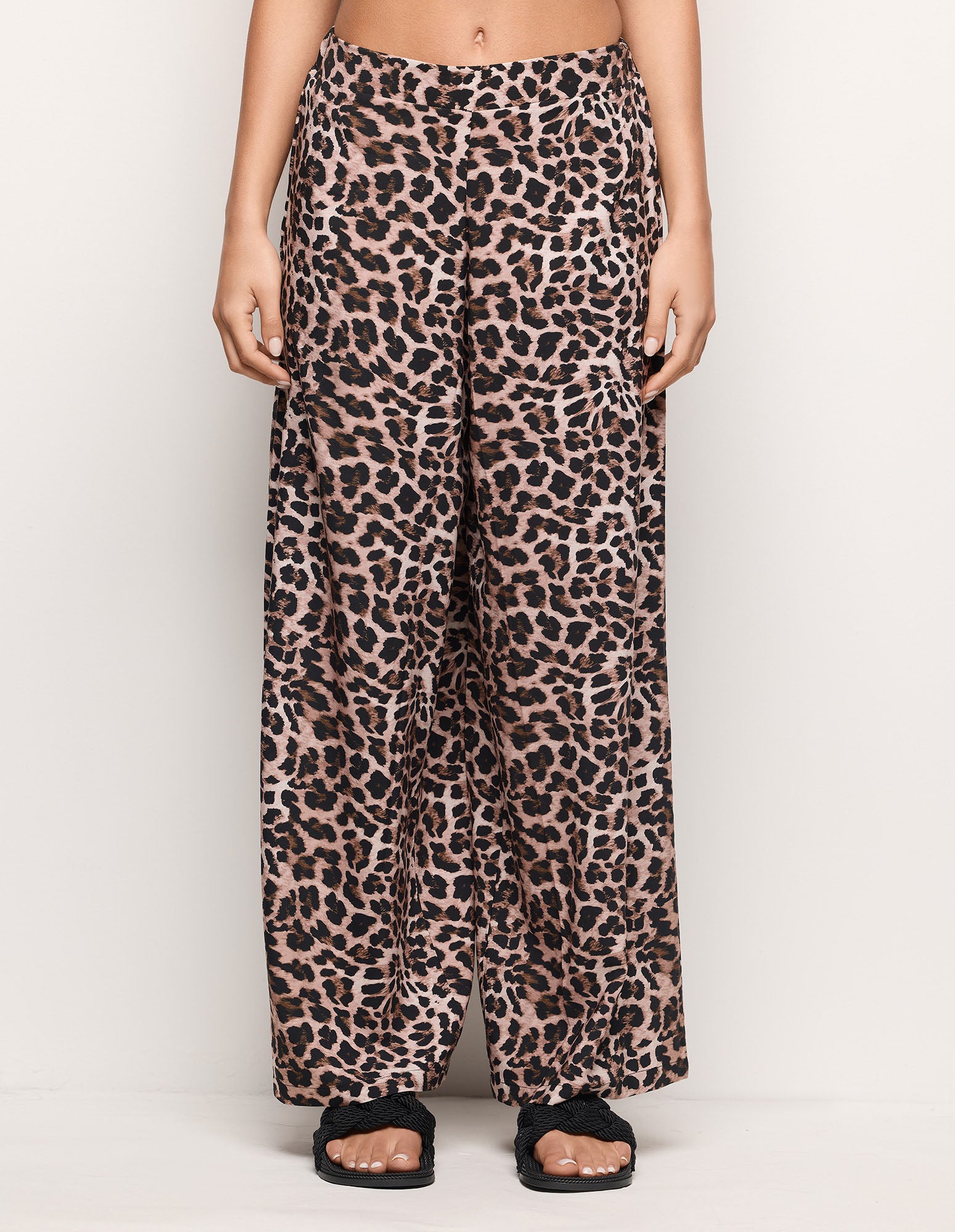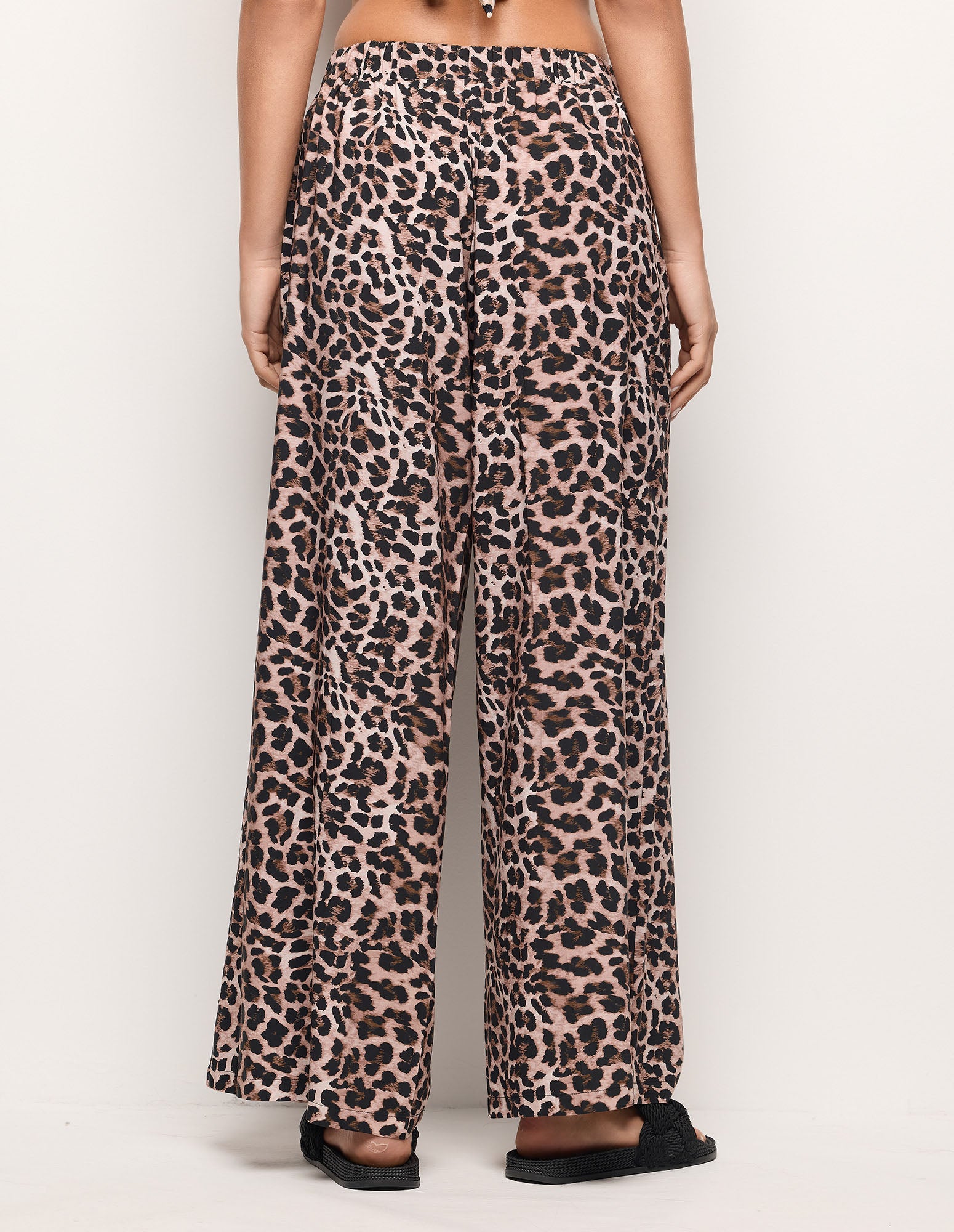 Pantalon palazzo large en viscose à imprimé léopard intégral. Taille élastiquée et coupe fluide pour plus de confort.