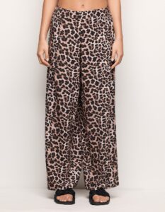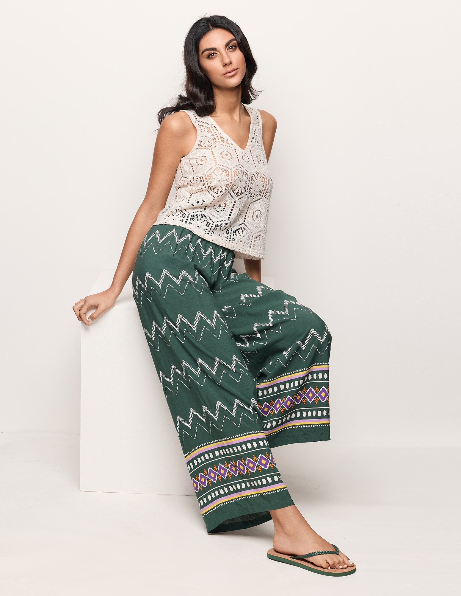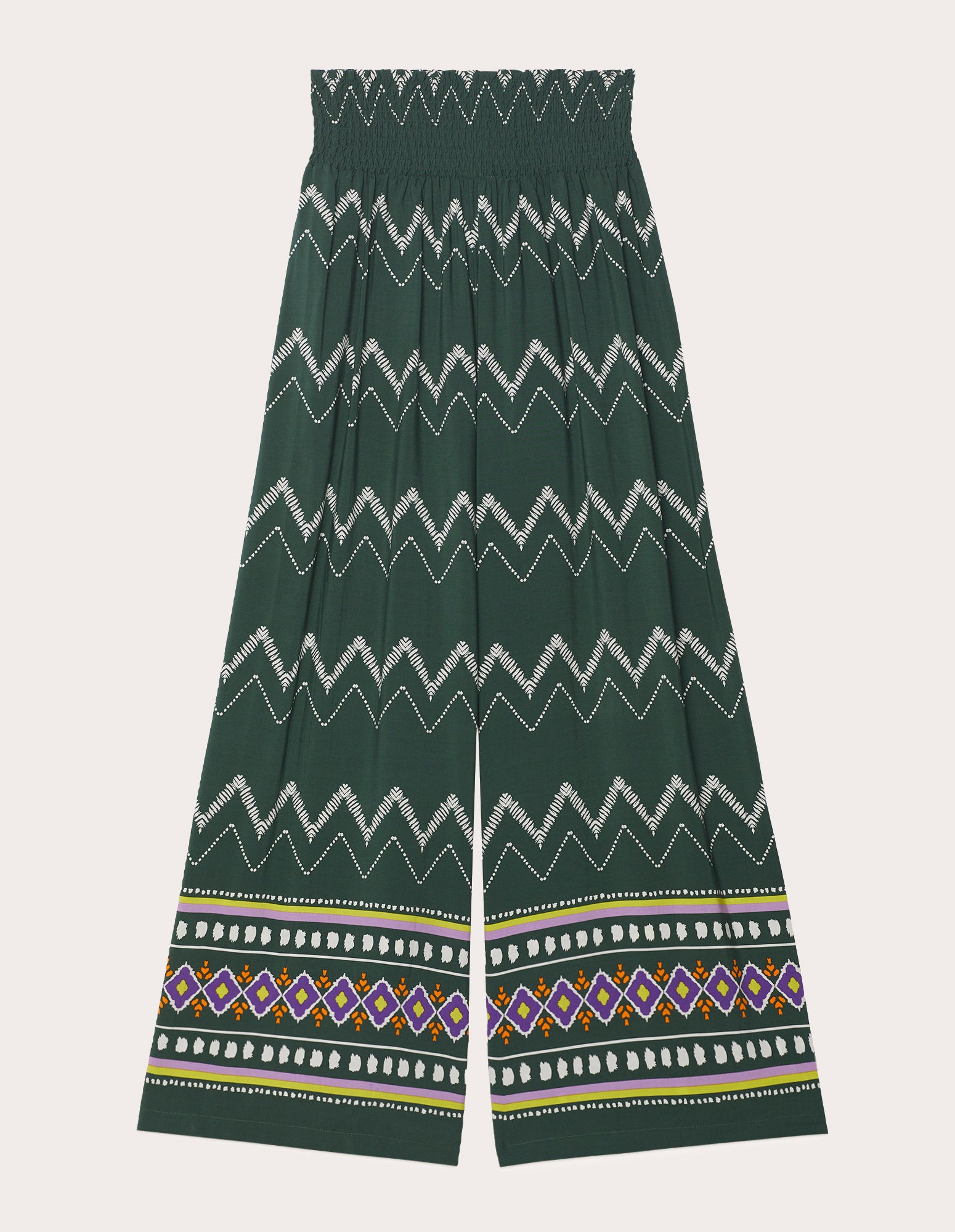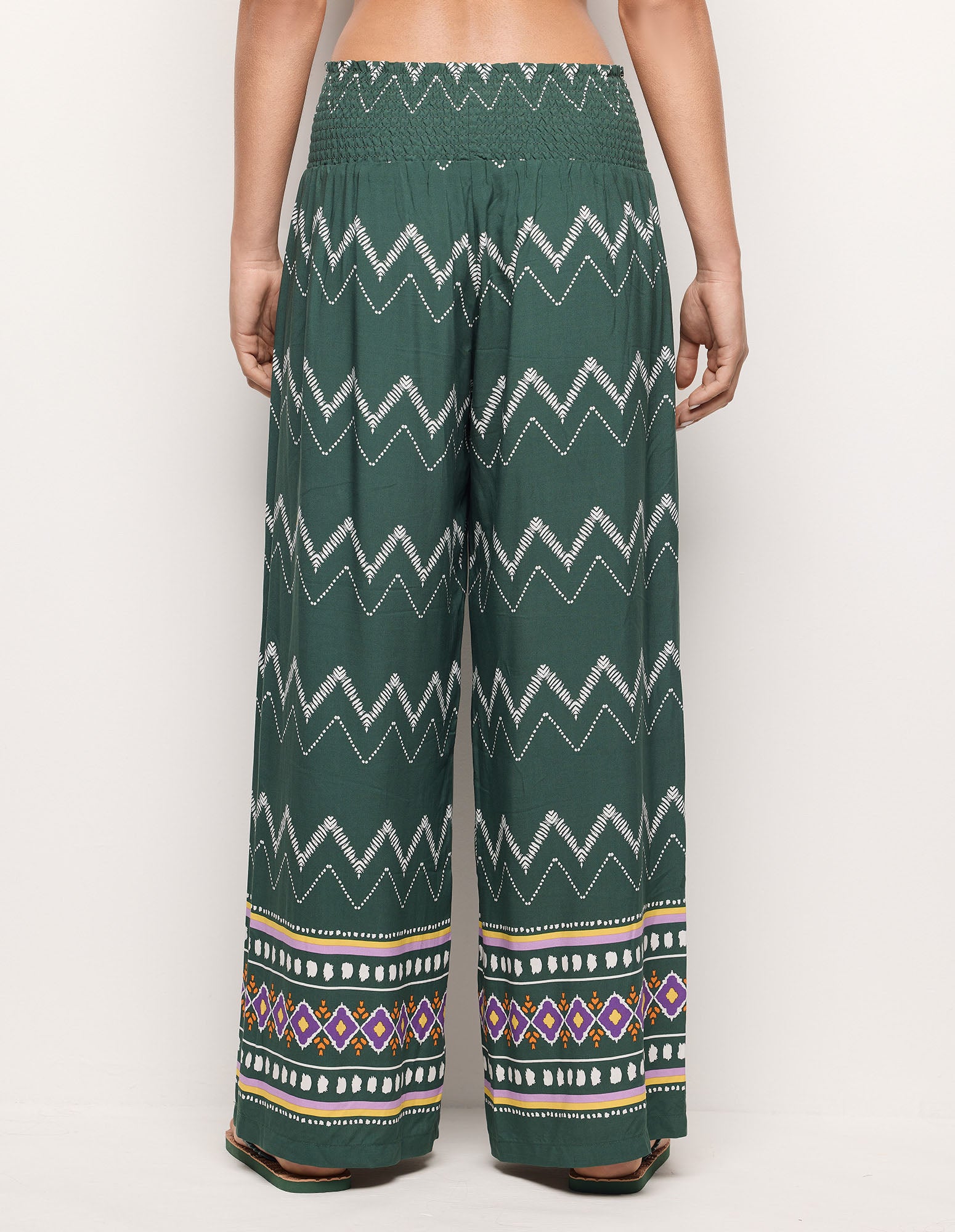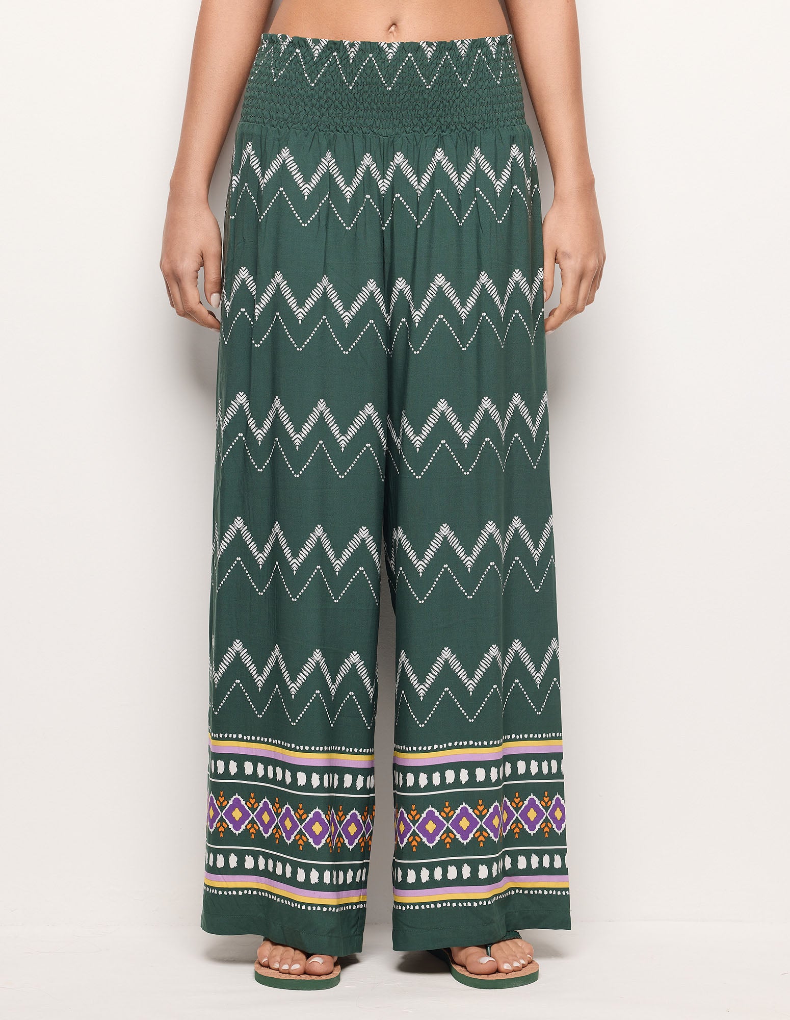 Pantalon long style ethnique pour femme en viscose, avec taille élastique pour sublimer la silhouette. Coupe palazzo ample et fluide, ornée de finitions ethniques colorées.