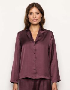 Veste chemise souple en satin bleu indigo, à manches longues, avec encolure en V et boutons. Texture légère et lisse, idéale aussi bien en chemise de jour qu’en pyjama léger, à associer au pantalon assorti.