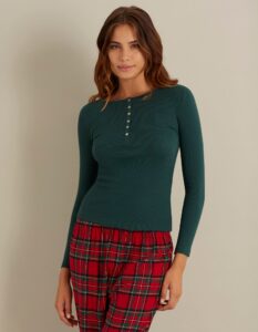 Ligne de pyjamas chic et élégante en modal et dentelle. Cette large gamme vous permet de créer votre propre pyjama en combinant t-shirts et pantalons selon vos envies. Elle est confectionnée en modal LENZING™, un tissu frais et élastique, respirant, absorbant et délicat. Ce t-shirt à manches longues est orné d’un volant en dentelle à l’encolure, pour un effet encore plus raffiné.