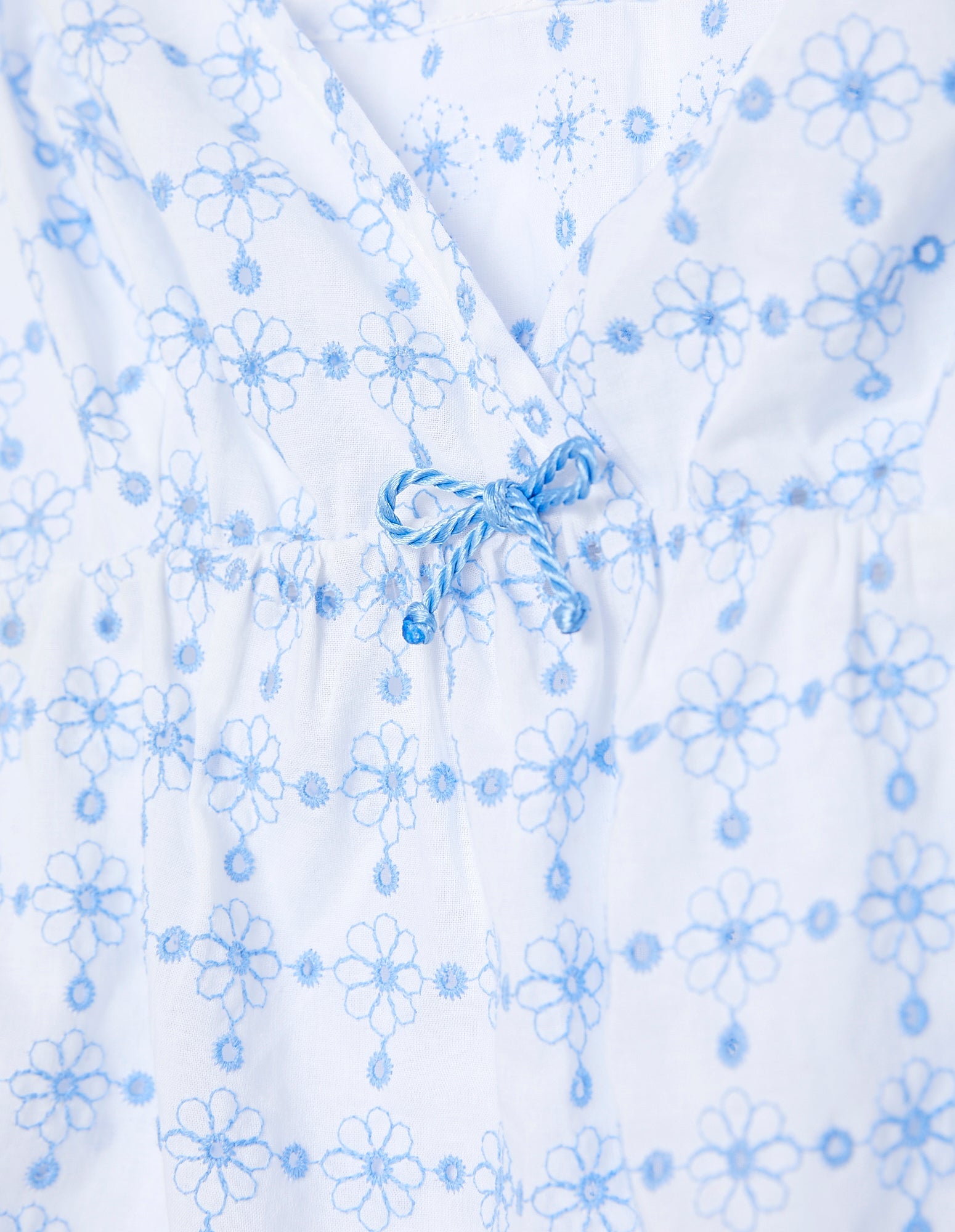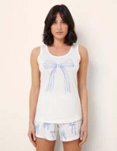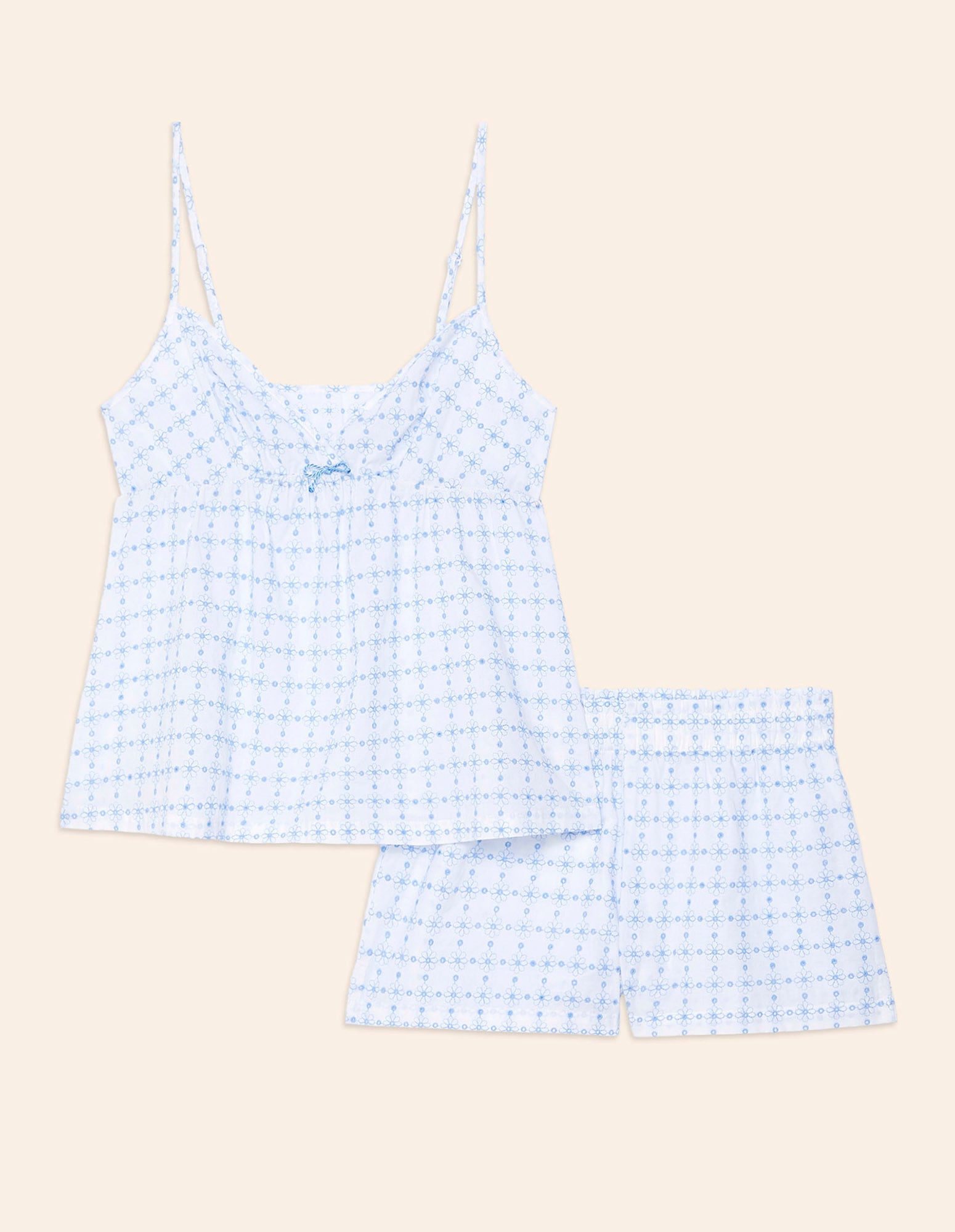 Pyjama court en jersey de coton léger à imprimé micro-fleurs. Le haut est doté de fines bretelles réglables et d’un décolleté en V, avec une couture légèrement froncée sous la poitrine. Le short, à la coupe souple, est légèrement évasé, avec une taille élastiquée et des coutures froncées pour plus de confort.