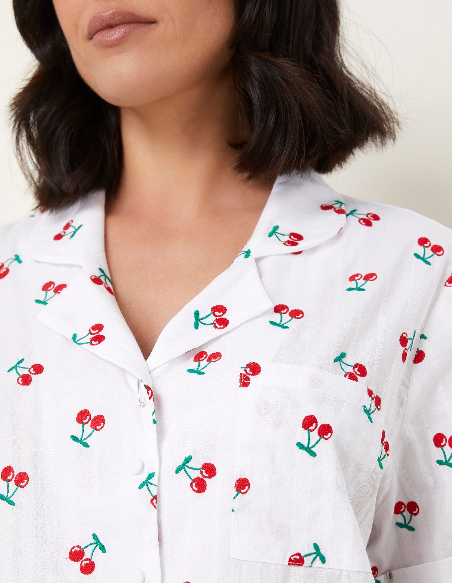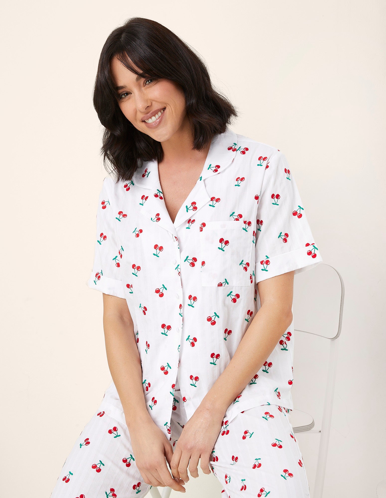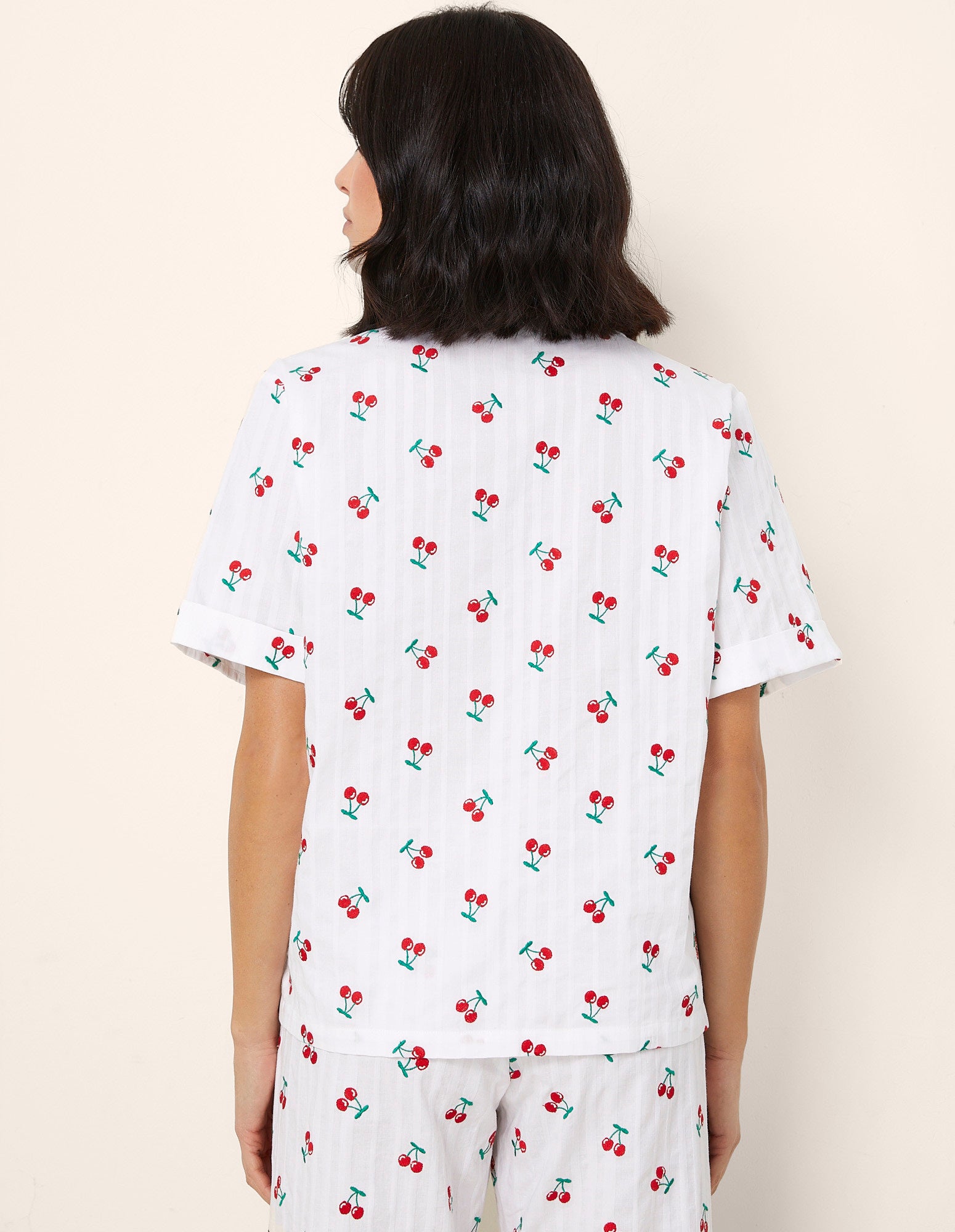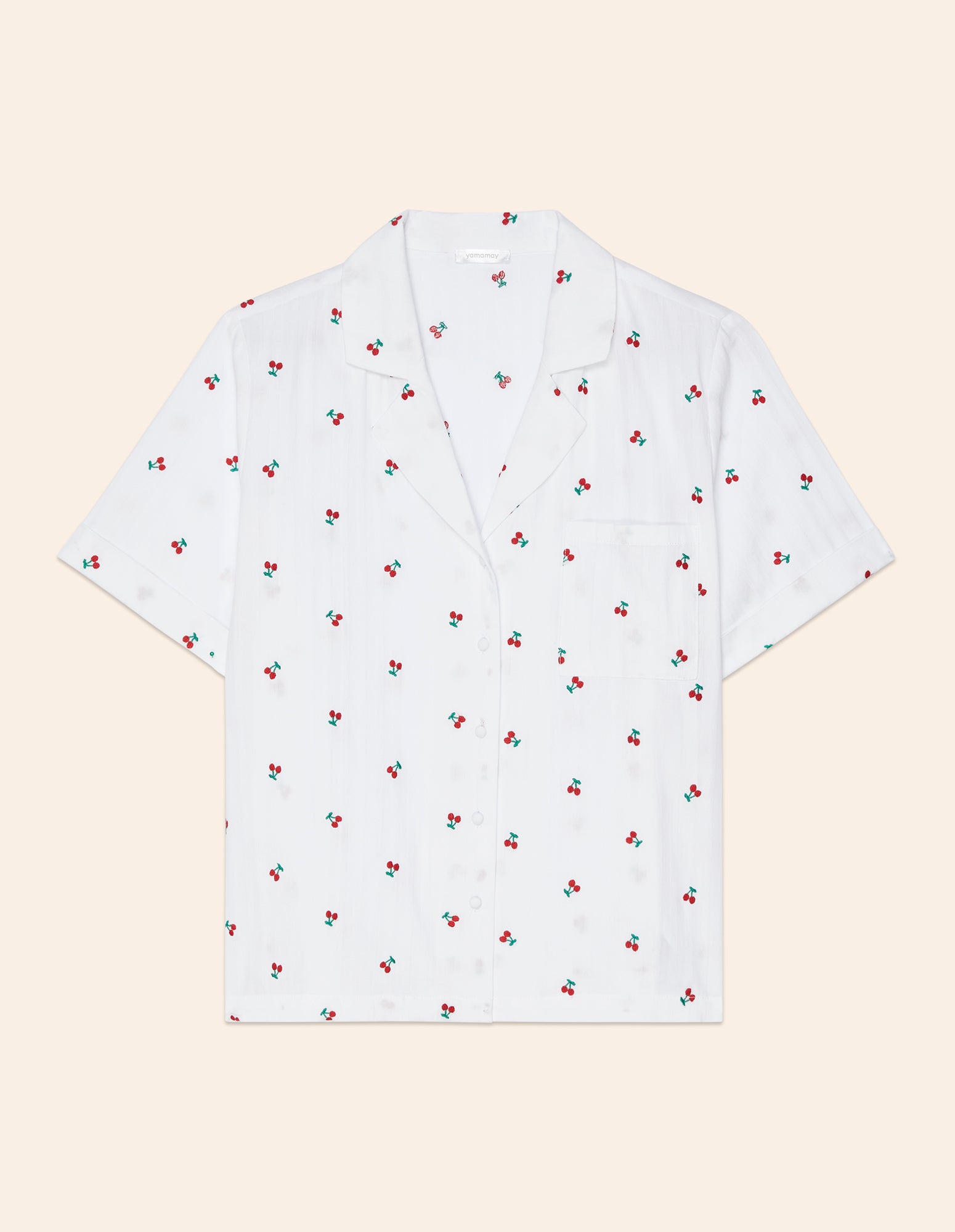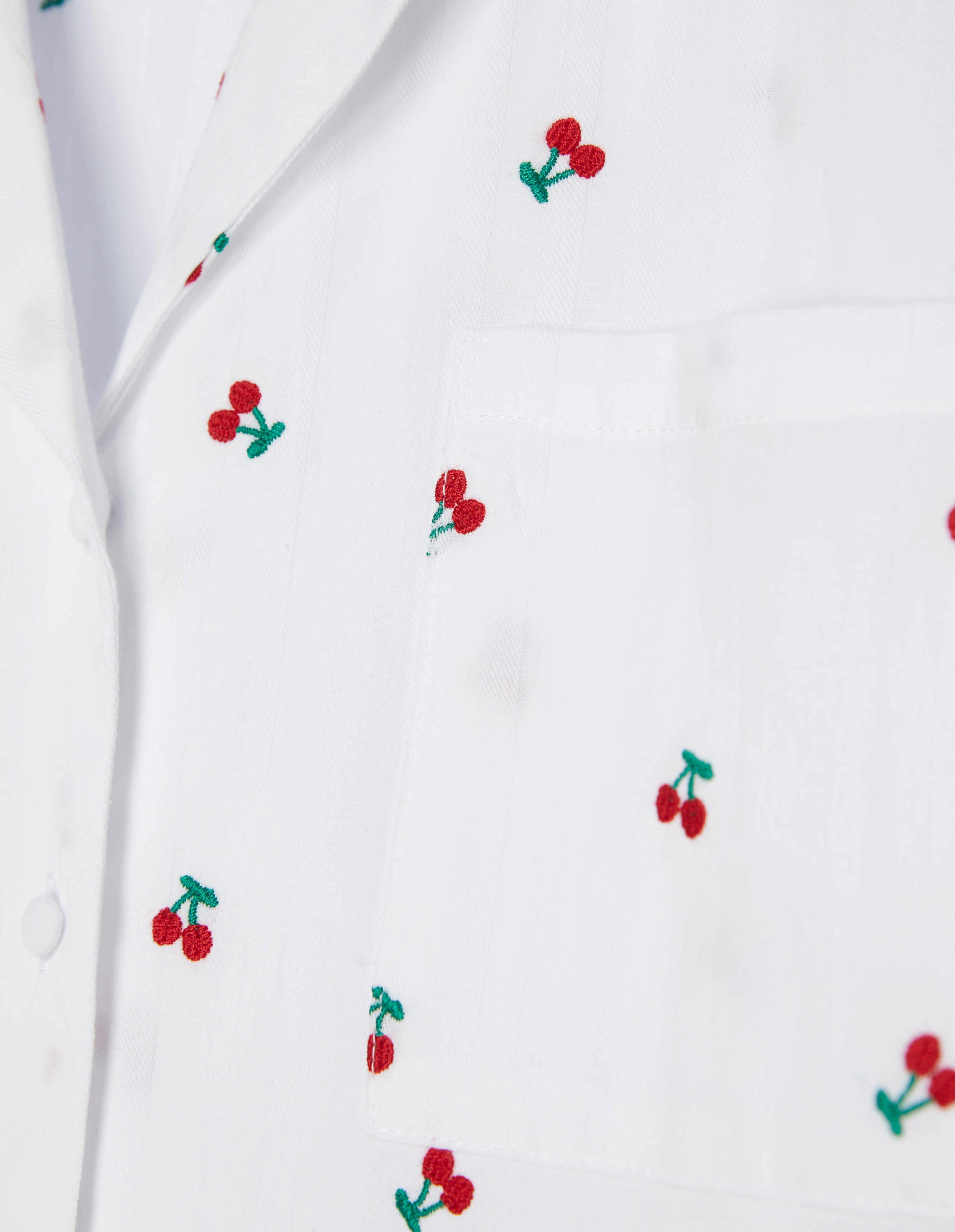 Chemise de pyjama à manches courtes en coton, boutonnée. Elle est décorée d’un motif de fines rayures verticales grises sur fond blanc, rehaussé d’un micro-imprimé de cerises.