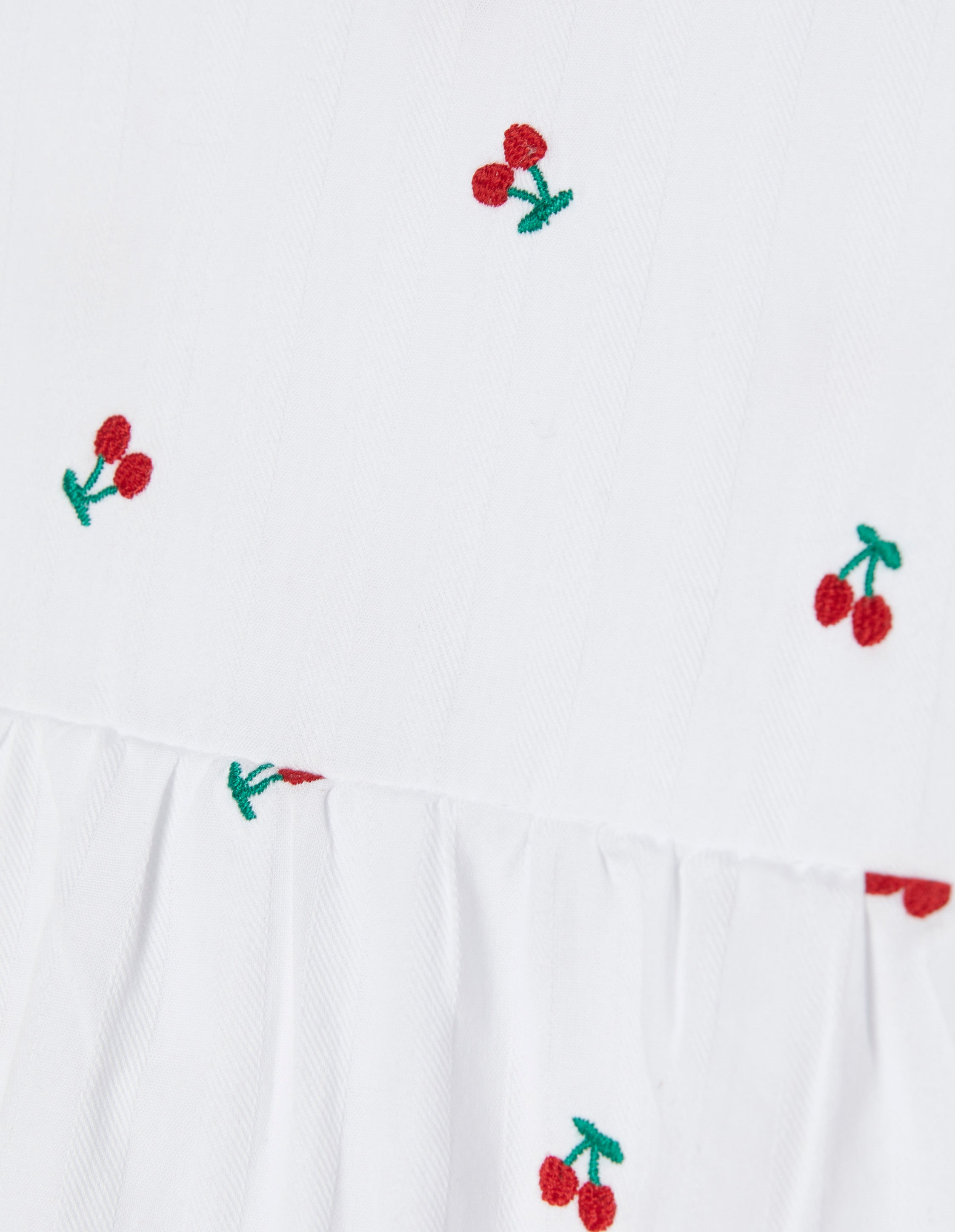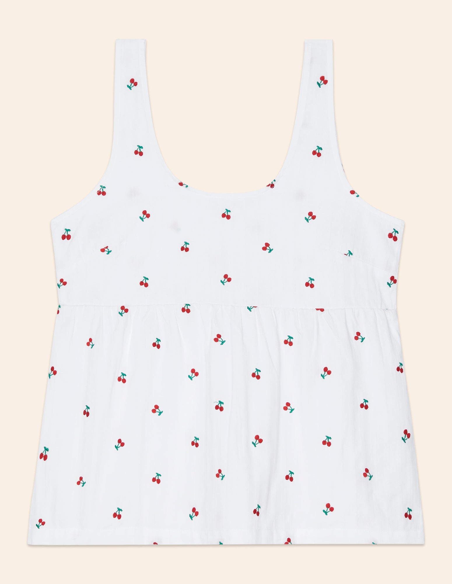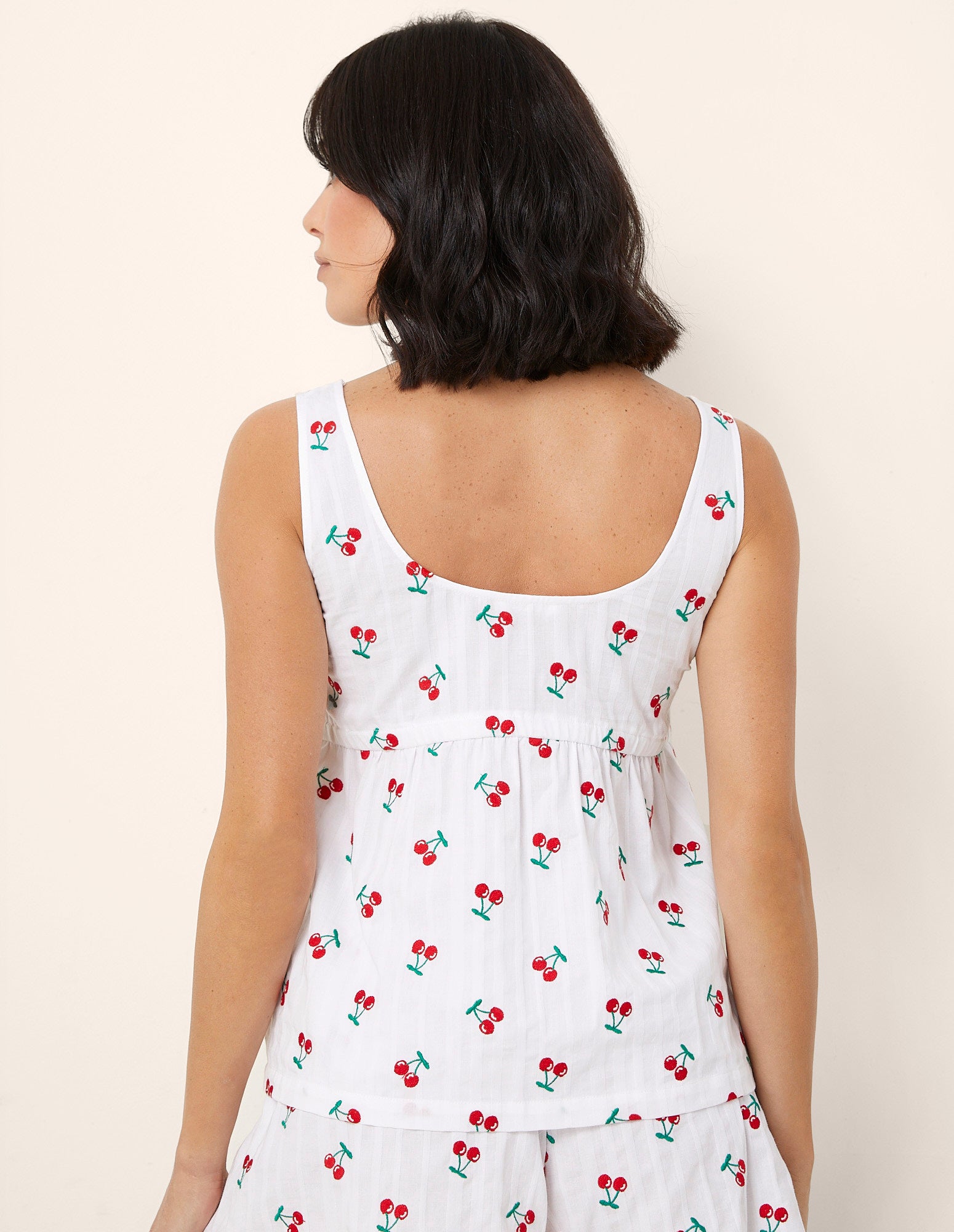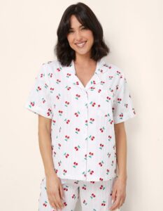 Haut de pyjama femme en coton orné d’un motif de fines rayures verticales gris clair sur fond blanc, rehaussé d’un micro-imprimé de cerises. Ce vêtement présente de fines bretelles et une coupe évasée et aérienne, avec une découpe sous la poitrine définie par un léger élastique intérieur.