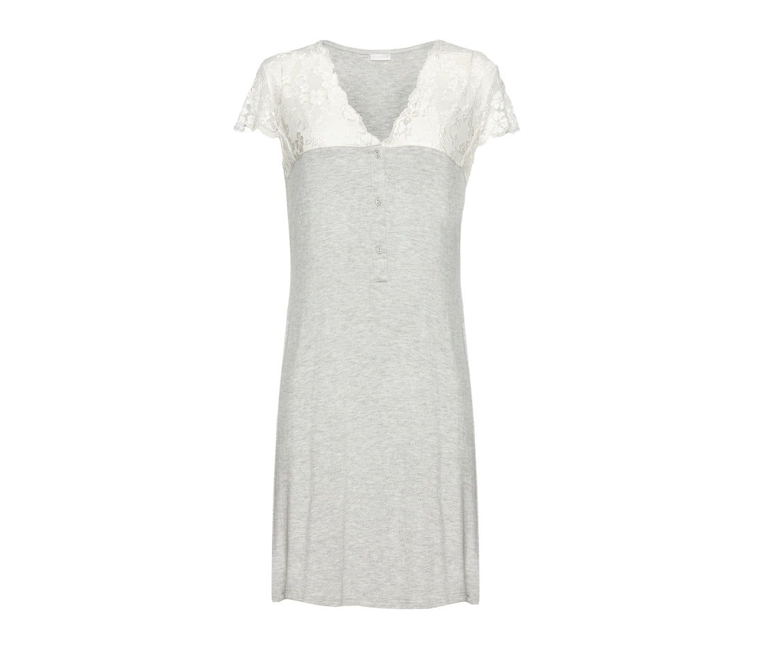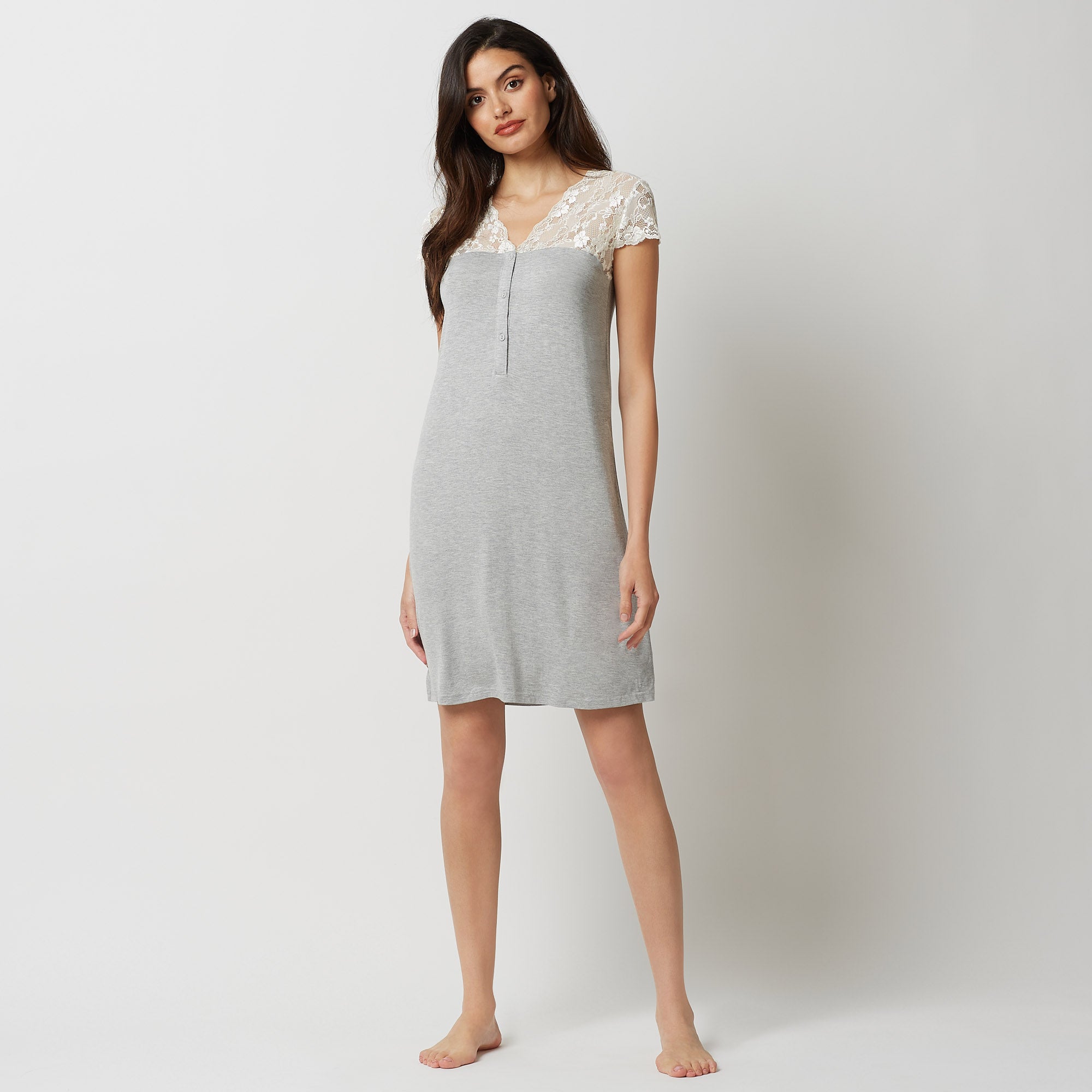Chemise de nuit courte à boutons devant en jersey extensible ornée d’une élégante dentelle sur le décolleté et les manches courtes