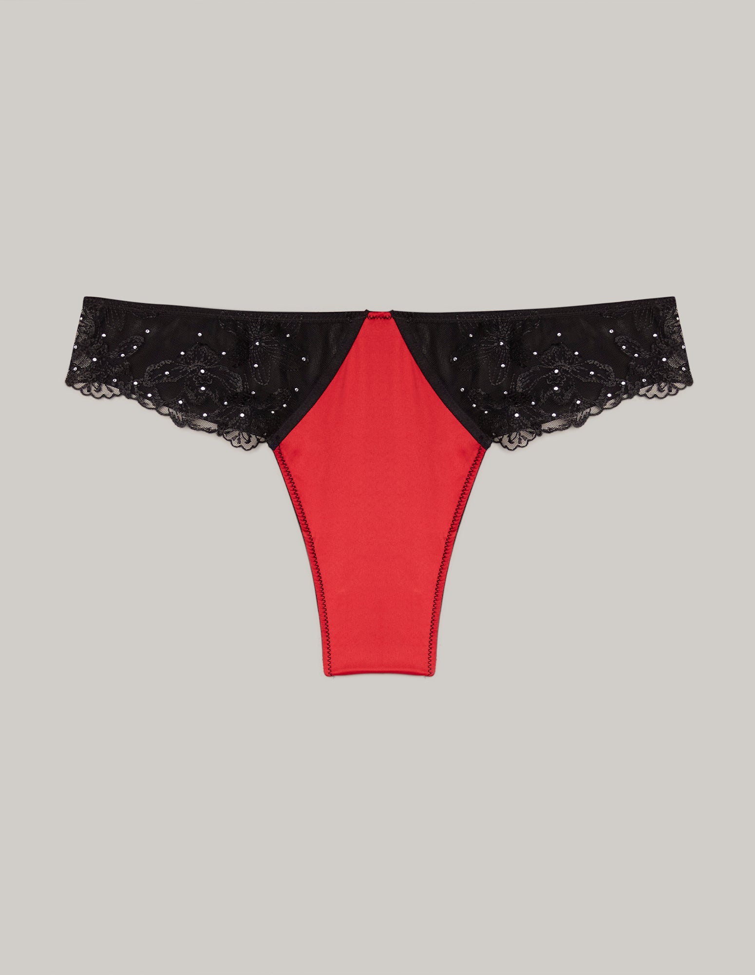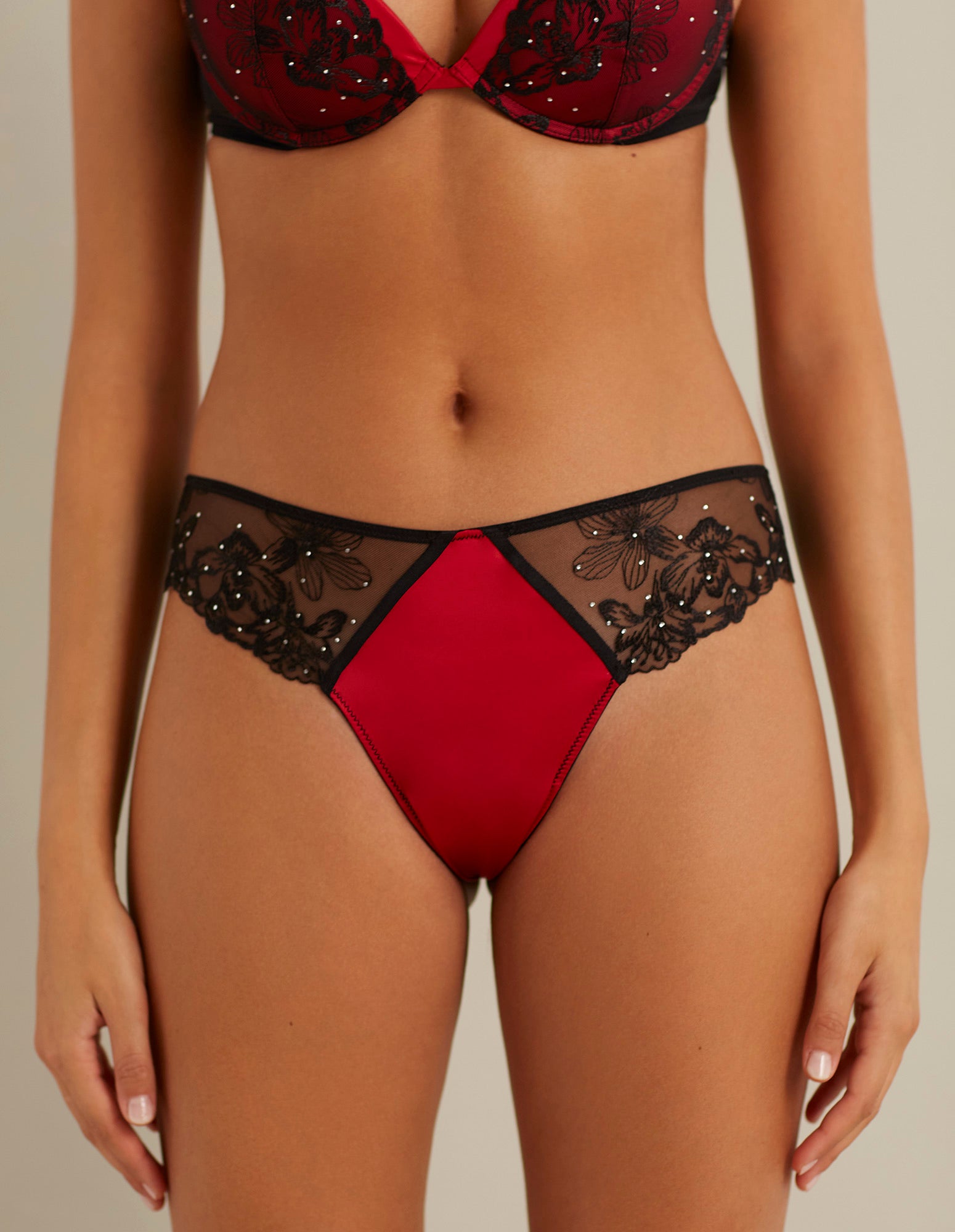 Illuminez votre look avec sensualité grâce à la nouvelle ligne Lucent. Un regard responsable grâce à une collection de sous-vêtements et de lingerie en satin, tulle et broderies, confectionnée à partir de fibres recyclées. Les couleurs intemporelles de l’hiver et des fêtes sont agrémentées d’inserts en strass brillants, qui ajoutent une touche précieuse. Le slip brésilien est sensuel et féminin dans sa coupe, avec du tulle doublé au dos, qui offre un confort absolu, et agrémenté d’un nœud et d’une broderie florale.