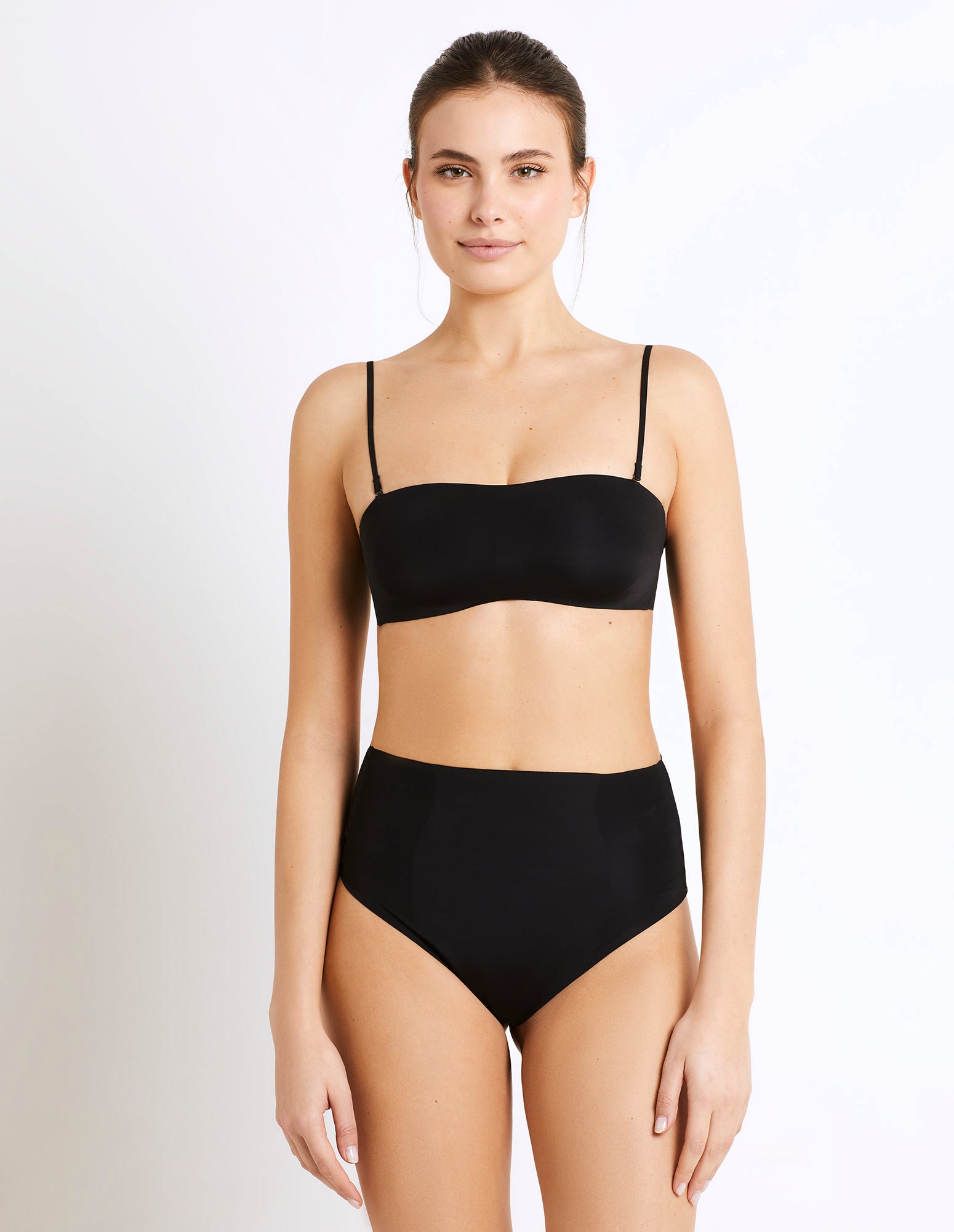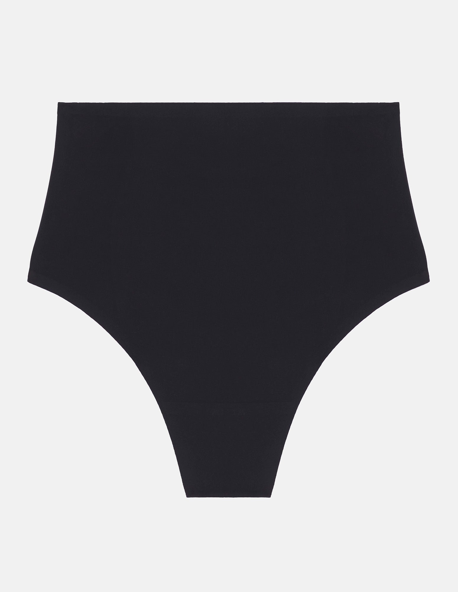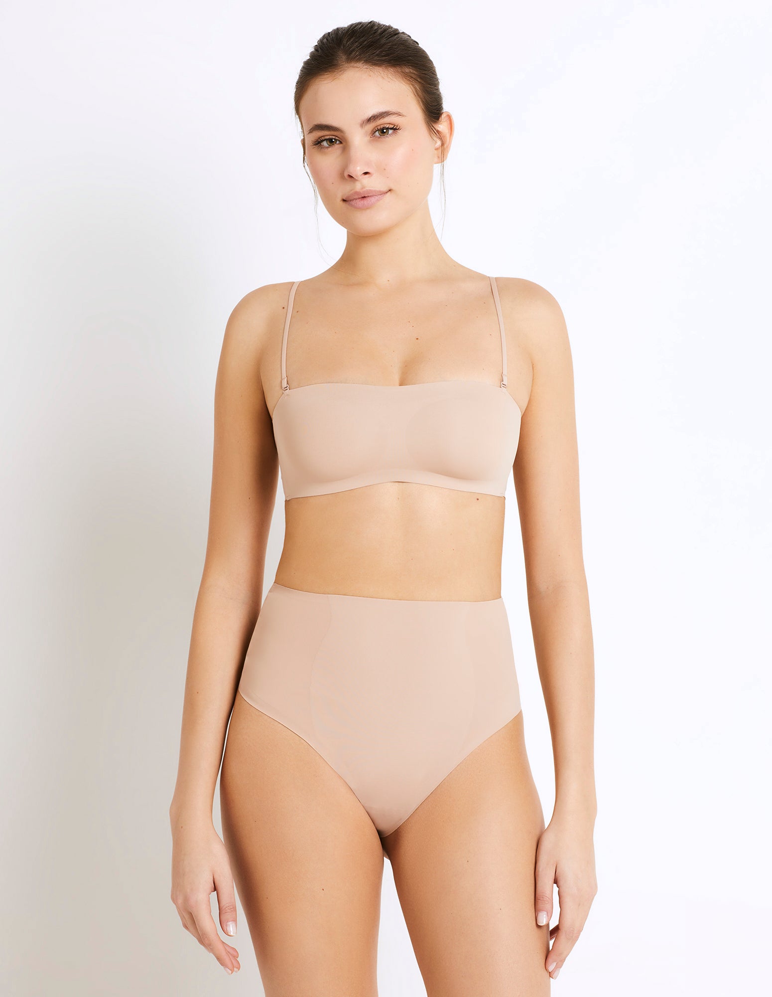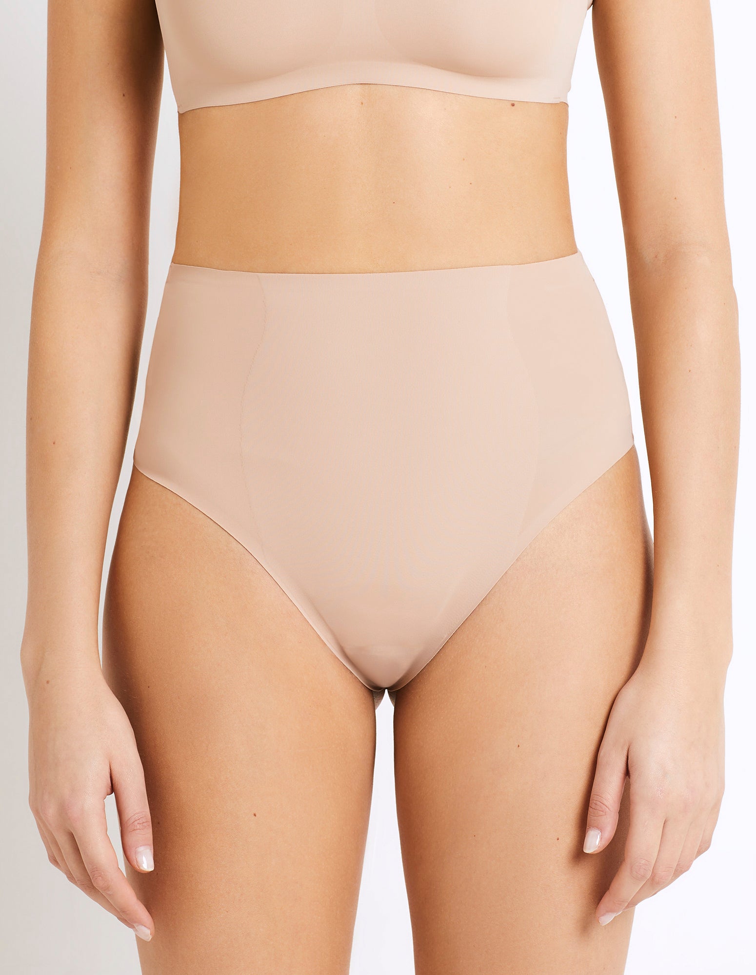 Superfine Shaping, une ligne gainante légère, confectionnée dans un tissu confortable et sans contraintes. Des vêtements confectionnés à partir de fibres recyclées, aux bords découpés au laser, sans coutures et sans élastique, grâce à la technologie Bonding. L’effet est invisible sous toutes les tenues. String gainant taille haute avec tissu double épaisseur pour un maintien optimal au centre du devant.