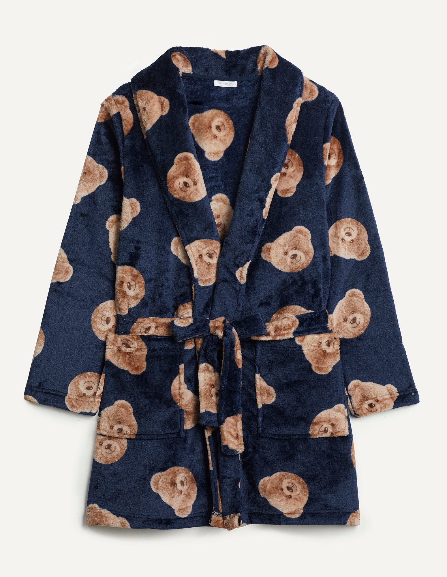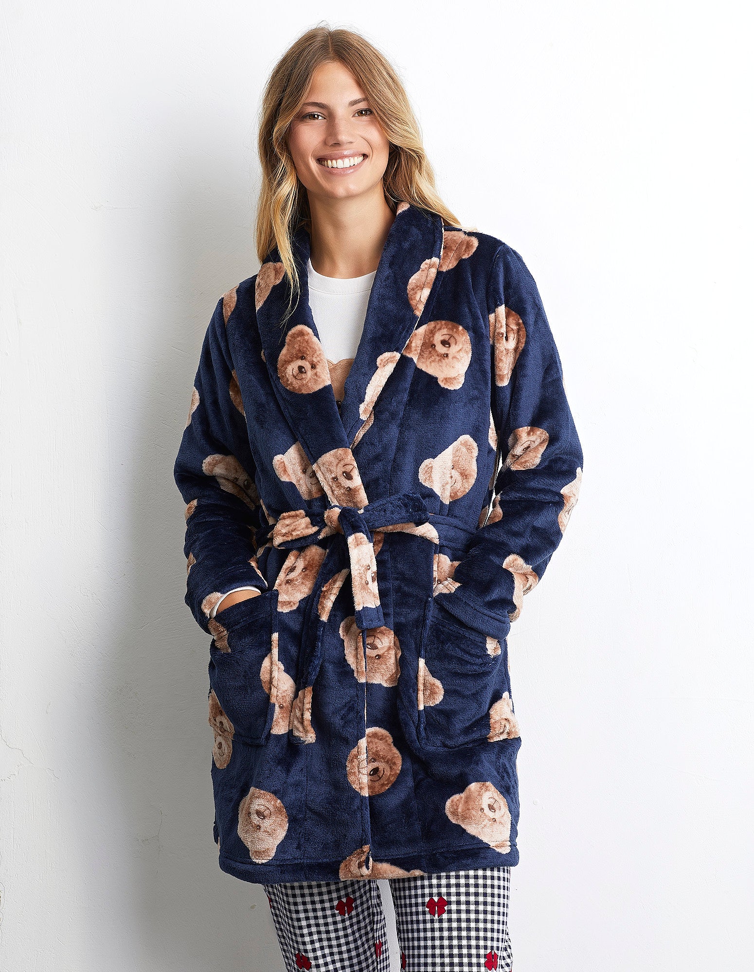 Douce, chaude et parfaite pour cet hiver, la ligne Chic Teddy transformera vos soirées d’hiver en véritables moments de plaisir. La pièce maîtresse de la collection est cet adorable ourson. Ce peignoir en fourrure est un concentré de douceur et de chaleur, idéal après une longue journée pour profiter d’un moment de détente. Sa ceinture et ses grandes poches le rendent ultra-pratique et apportent une touche d’originalité à votre tenue. Son élégant bleu nuit est sublimé par un imprimé all-over d’adorables oursons.